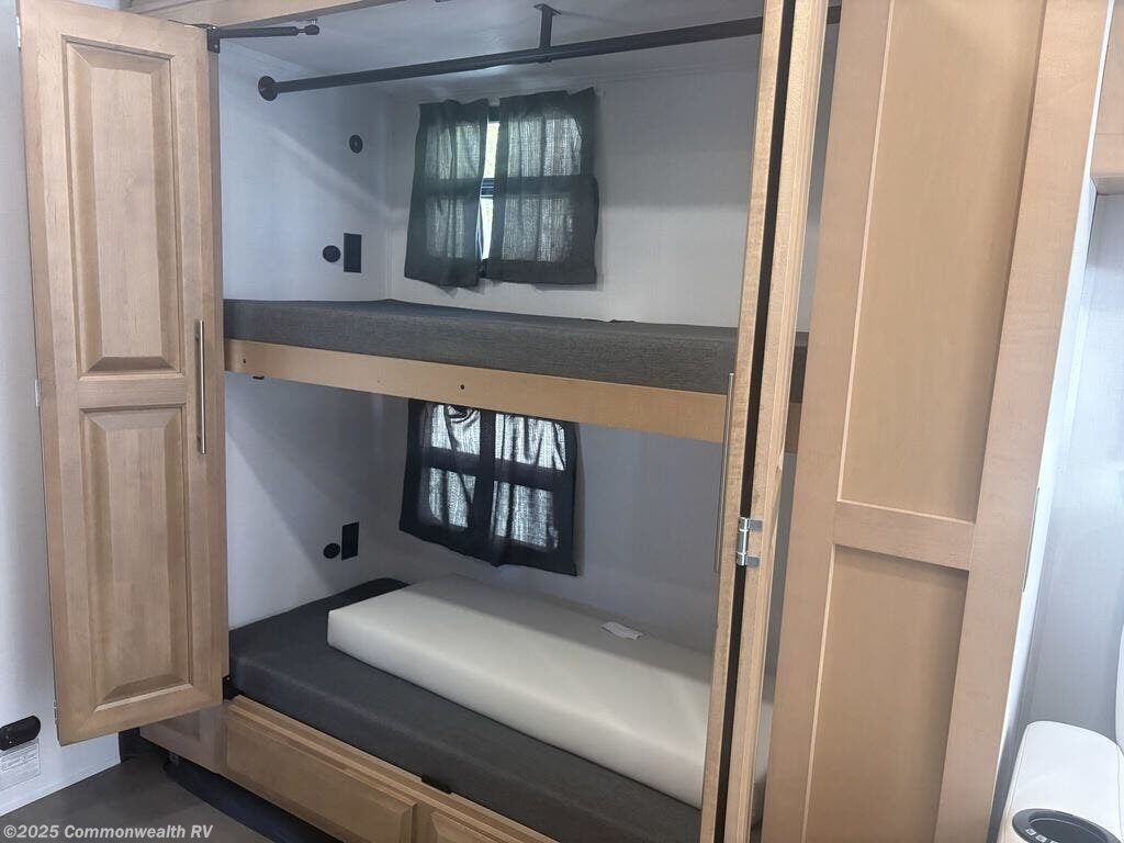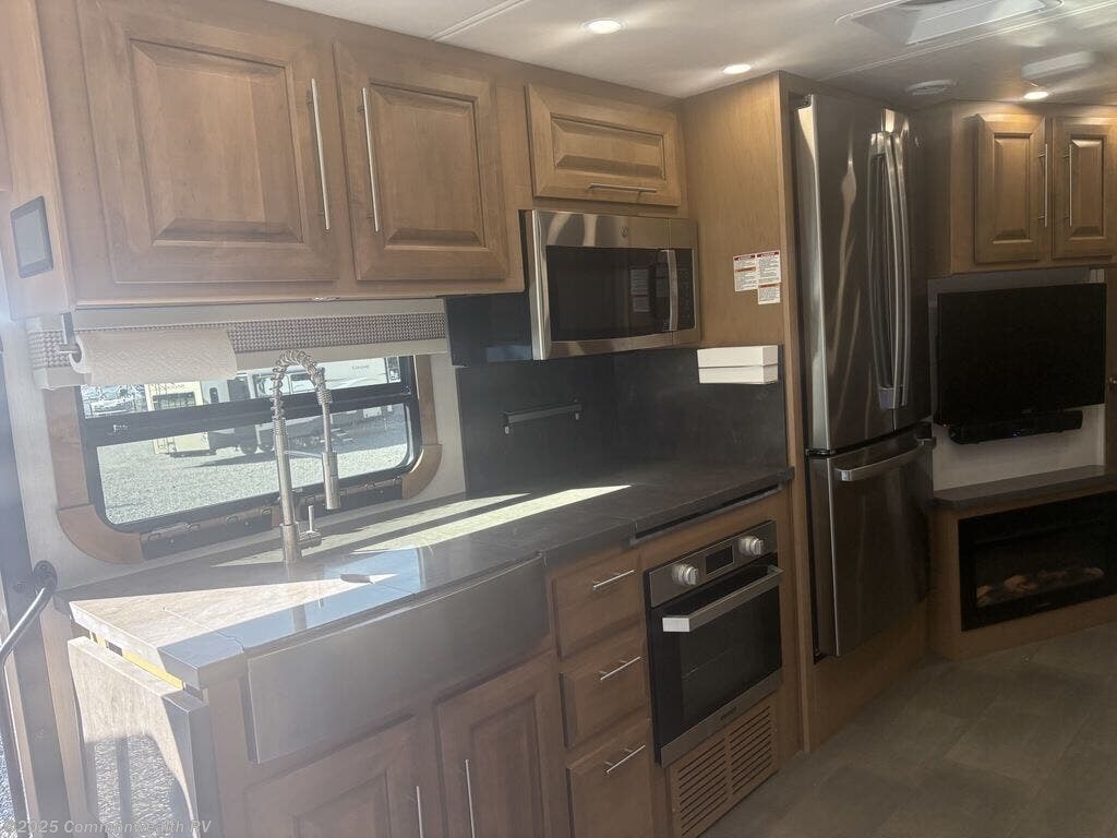 The Georgetown 36k7 floorplan offers 2 full baths, residential refrigerator, & bunks! A booth dinette is opposite kitchen with a farmhouse sink, 3-burner cooktop, & microwave. A TV sits across from theater seats for easy entertainment. A mid-ship full bath is across from bunk beds. The bedroom offers a king bed & washer/dryer, and full master bath. The cab provides swivel captain seats, table, & power overhead bunk.