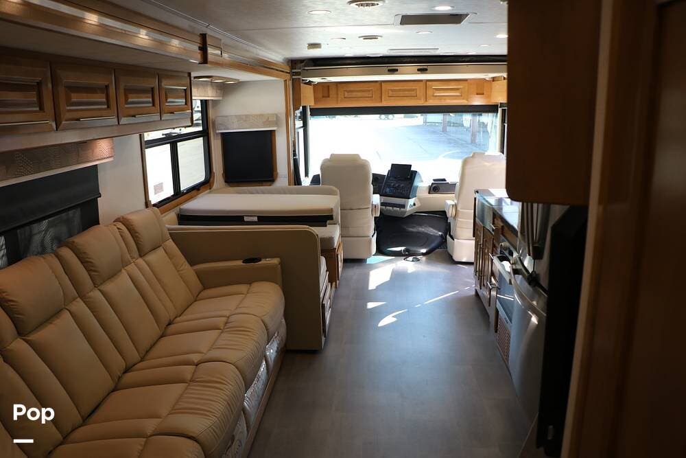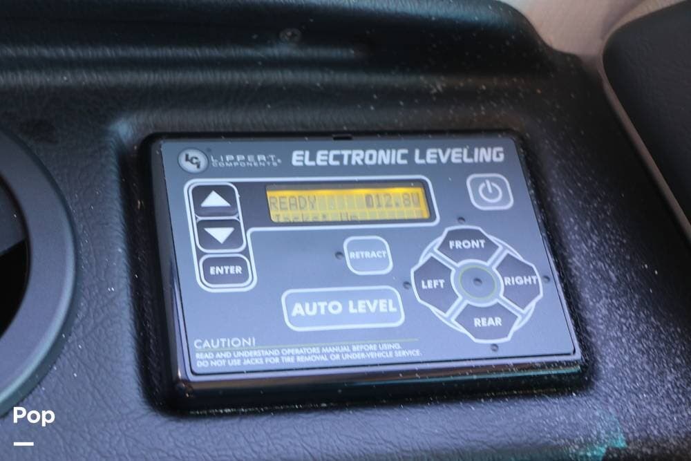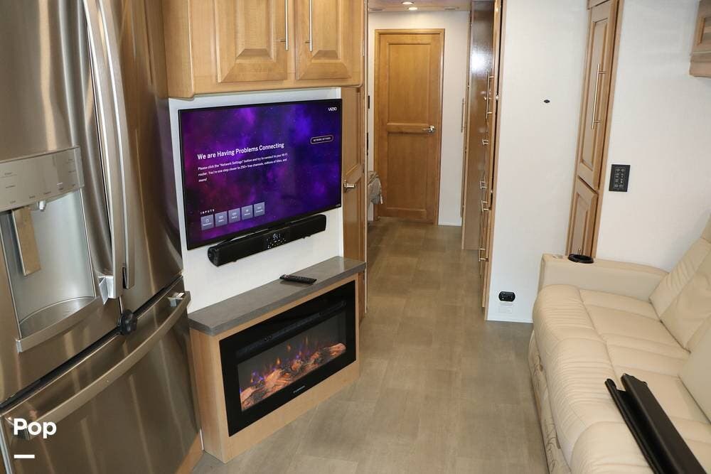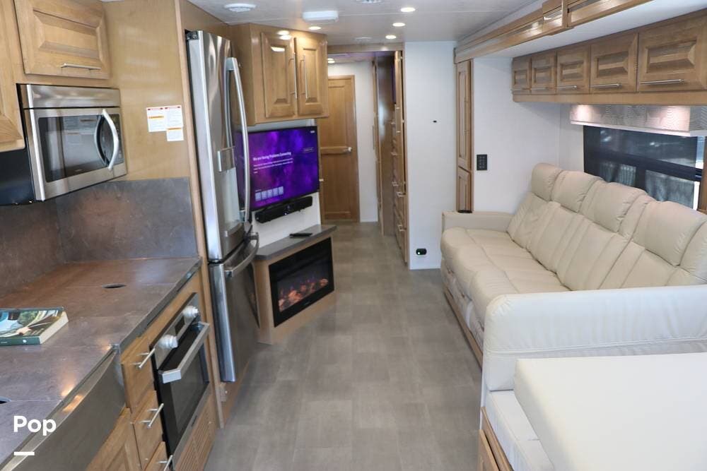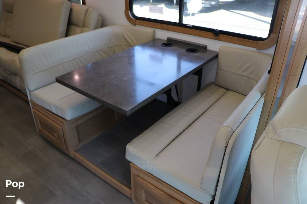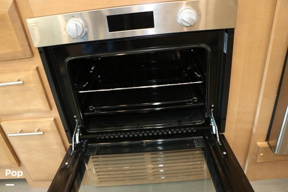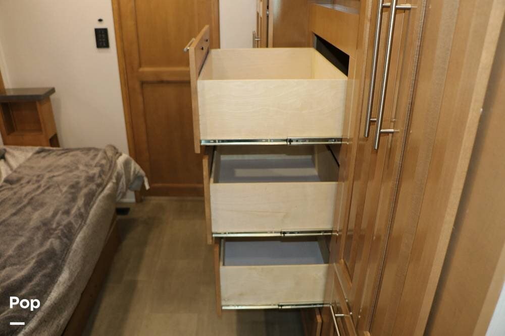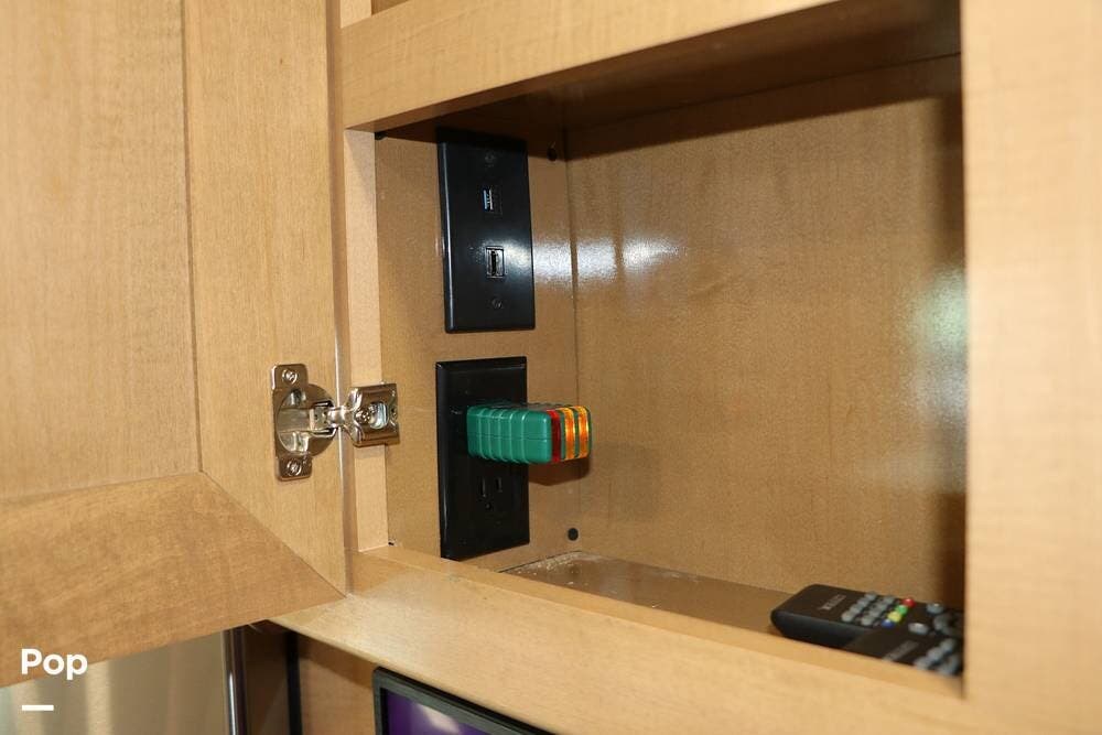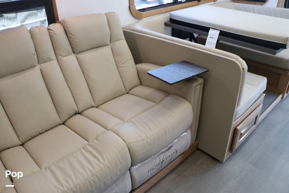 The entertainment center features a large flat screen TV, stereo sound bar, and electric fireplace that can be used for heating or just ambiance. The Dinette quickly converts into a third sleeping area if needed. The Euro Bed over the driver and passenger captains' chairs quietly drops and raises at the touch of a button.