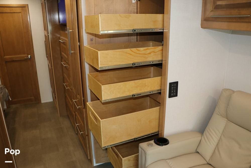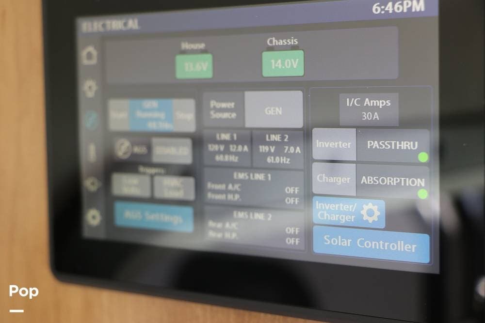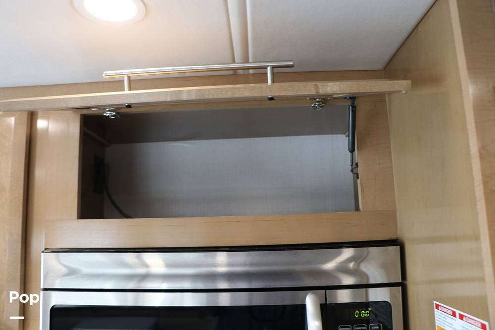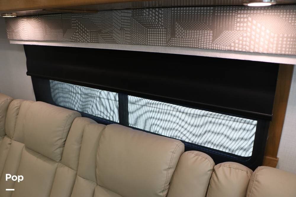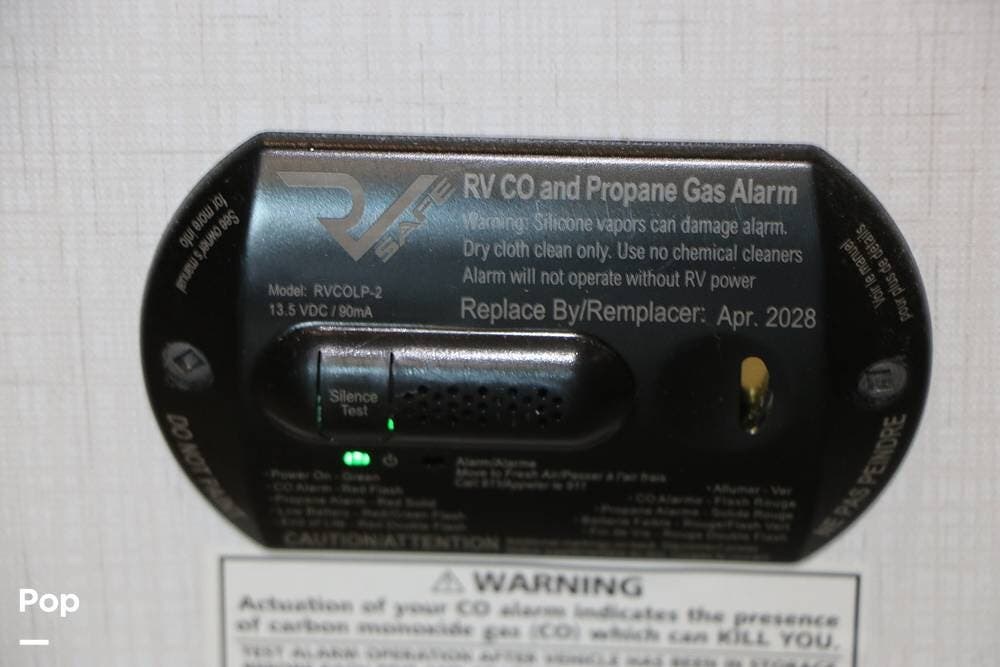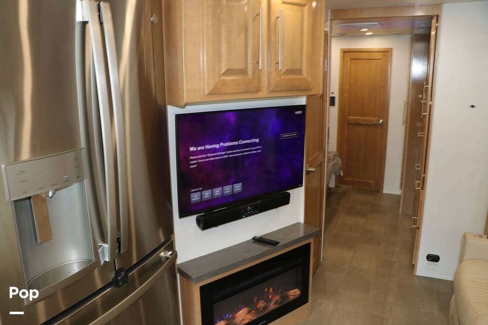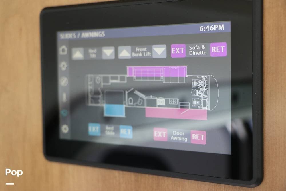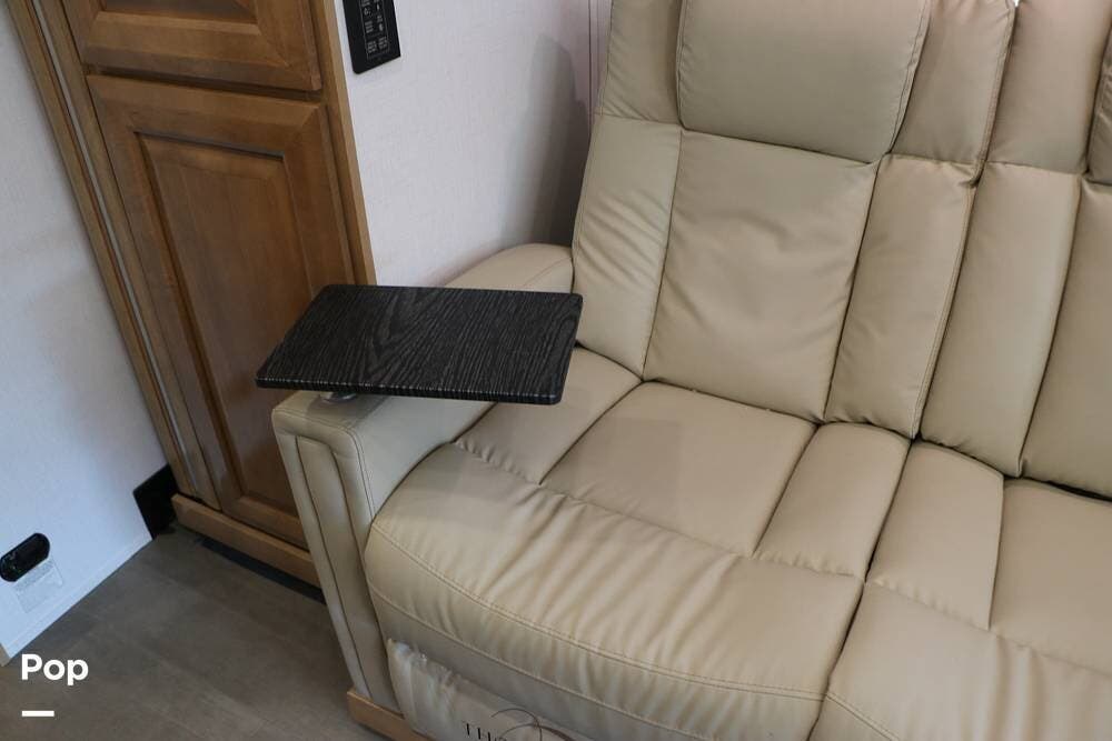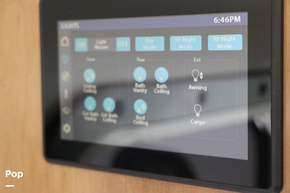 The entertainment center features a large flat screen TV, stereo sound bar, and electric fireplace that can be used for heating or just ambiance. The Dinette quickly converts into a third sleeping area if needed. The Euro Bed over the driver and passenger captains' chairs quietly drops and raises at the touch of a button.