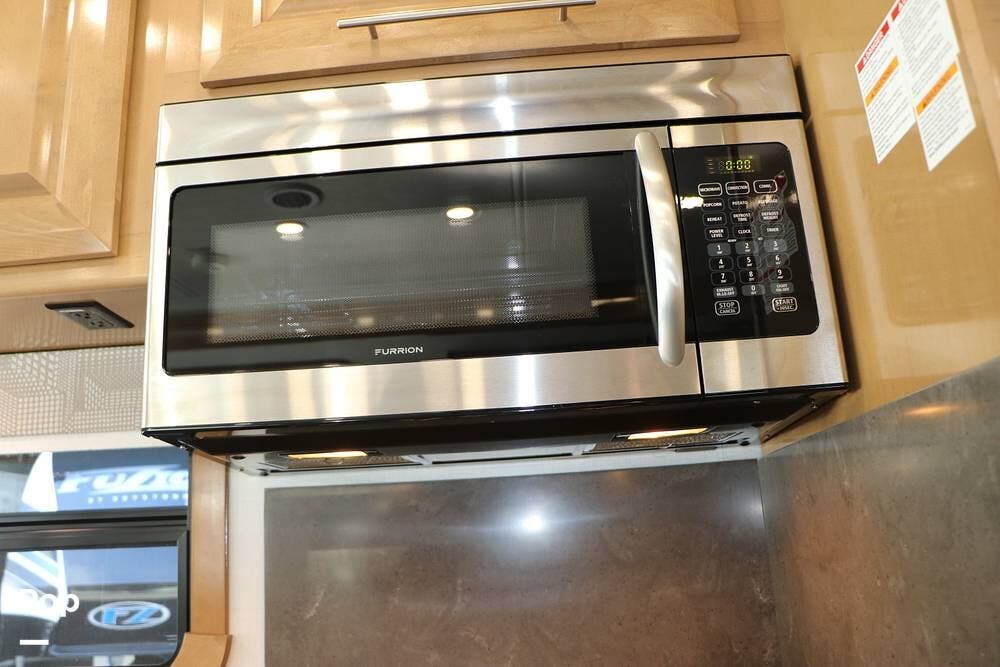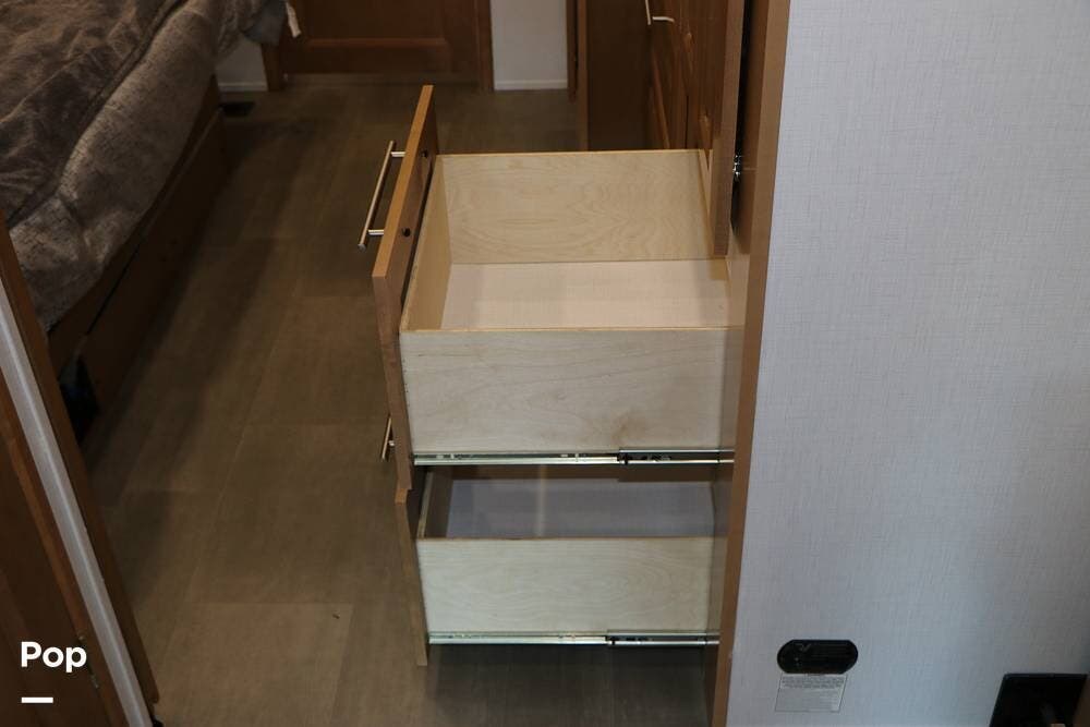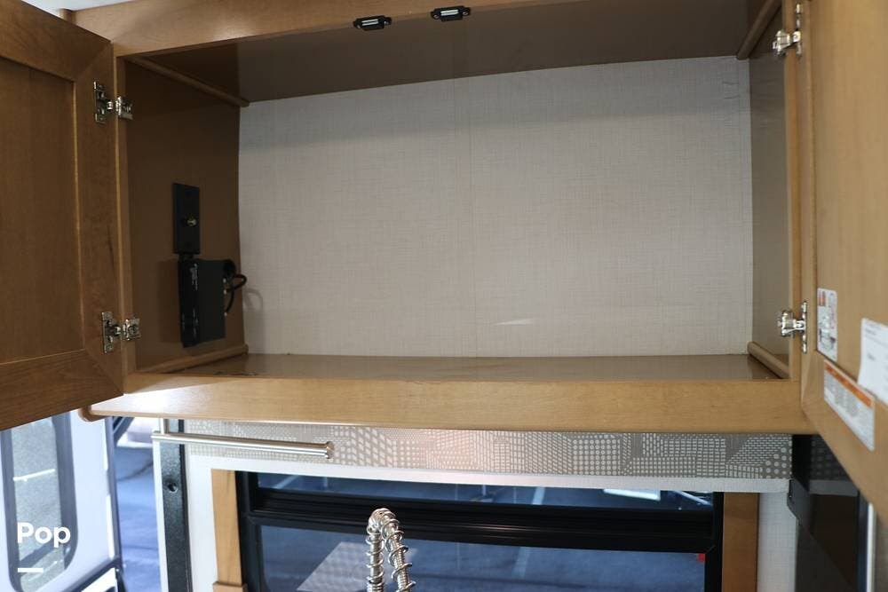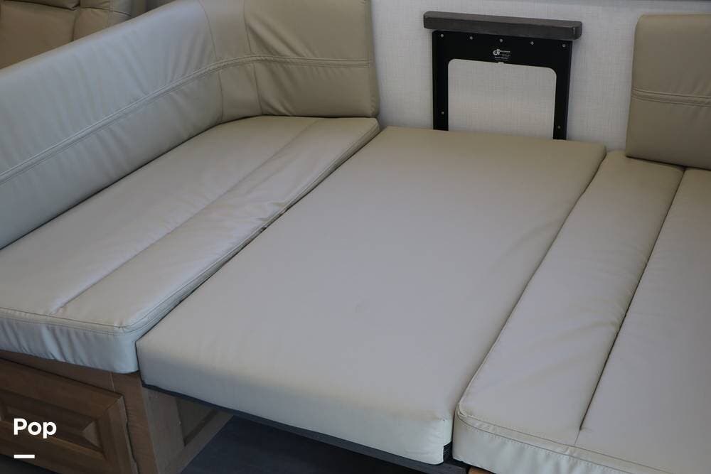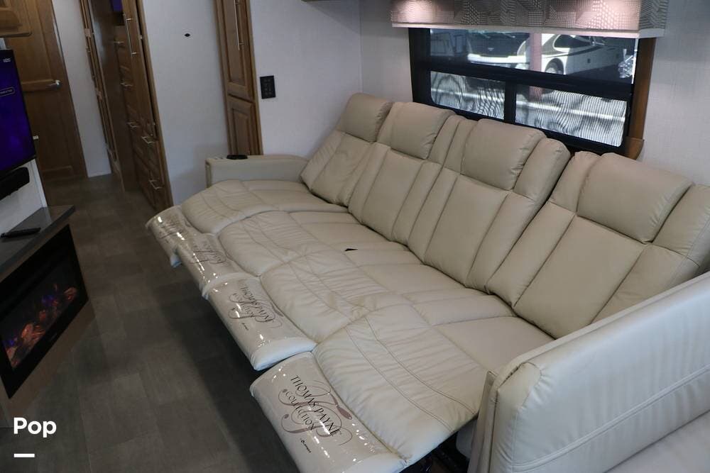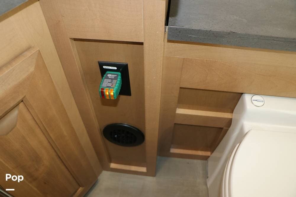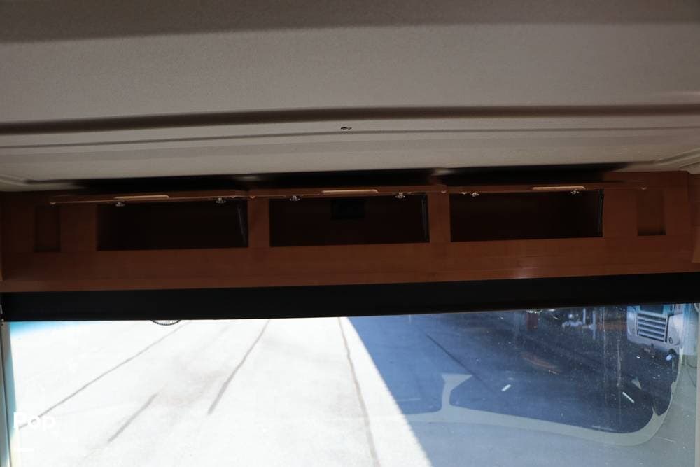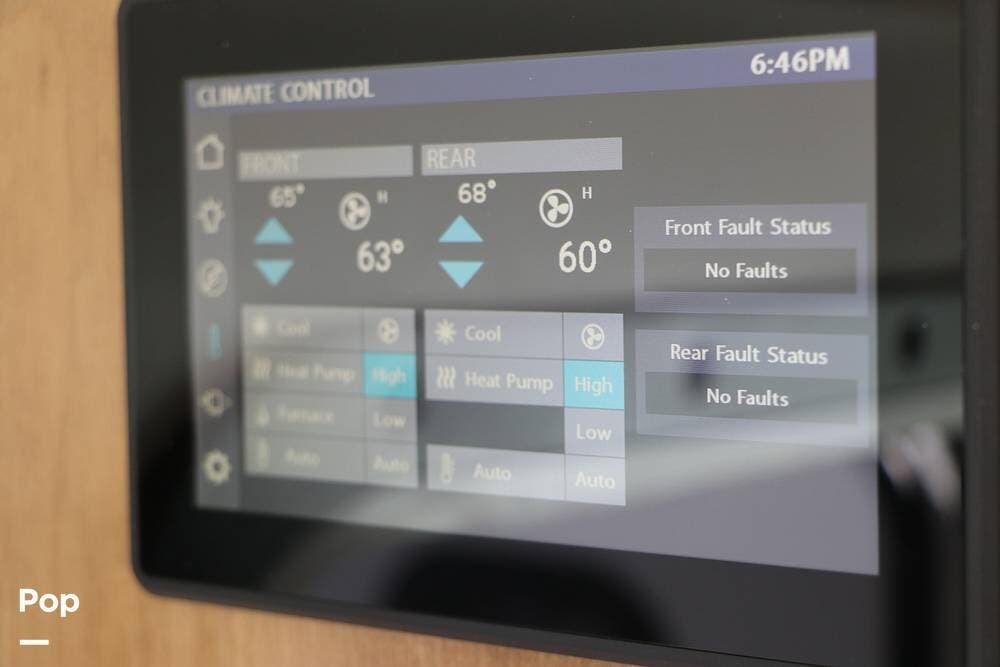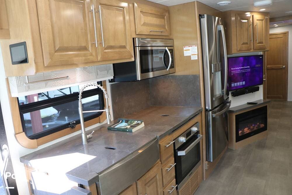 The entertainment center features a large flat screen TV, stereo sound bar, and electric fireplace that can be used for heating or just ambiance. The Dinette quickly converts into a third sleeping area if needed. The Euro Bed over the driver and passenger captains' chairs quietly drops and raises at the touch of a button.