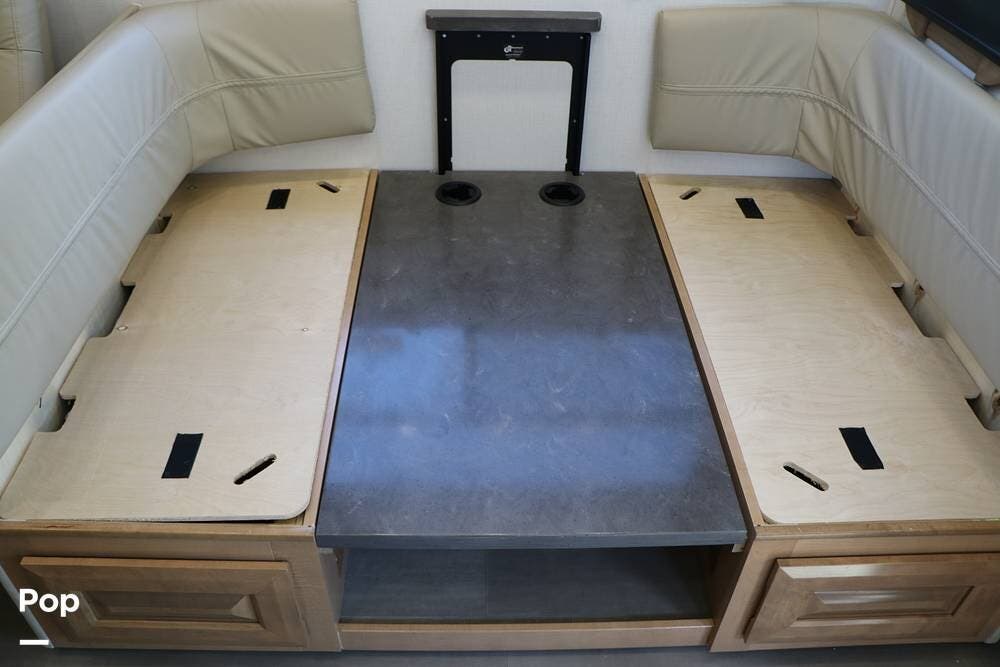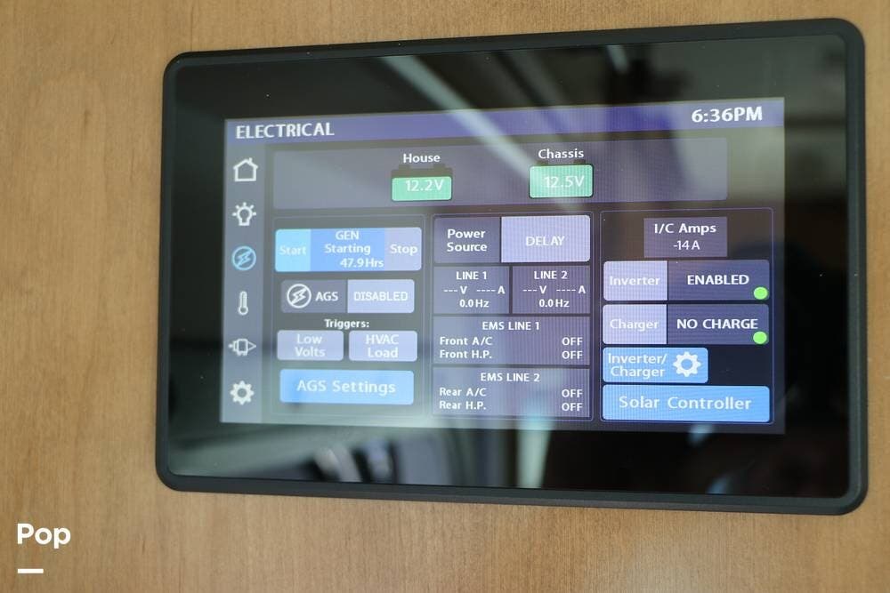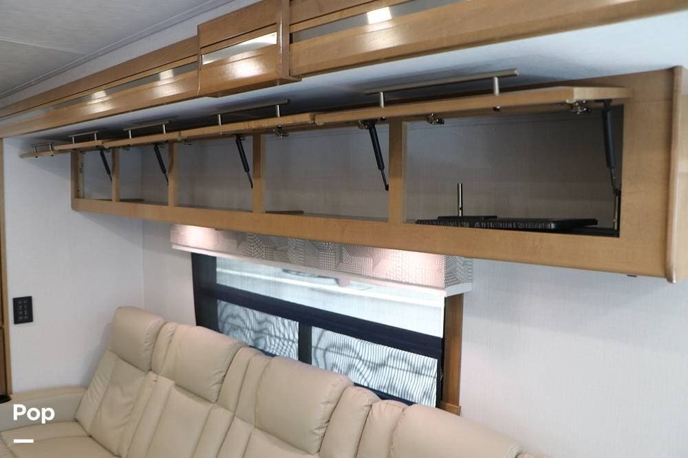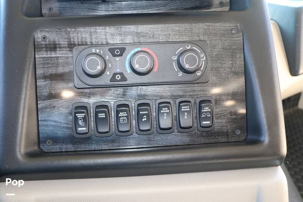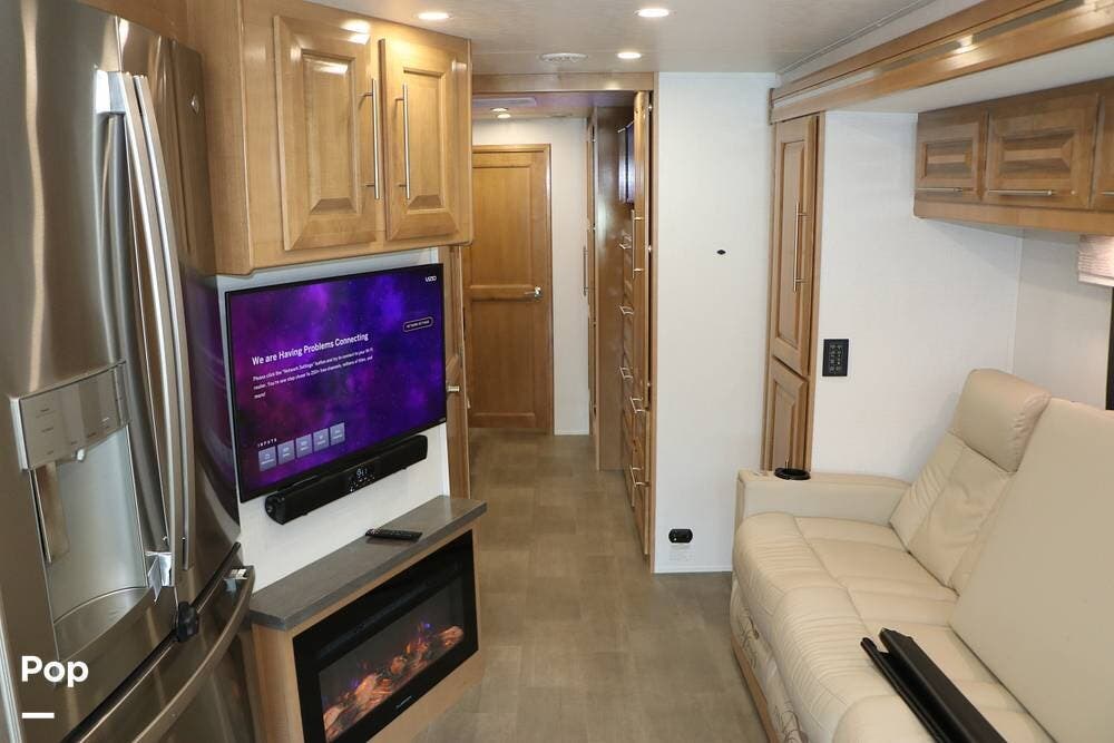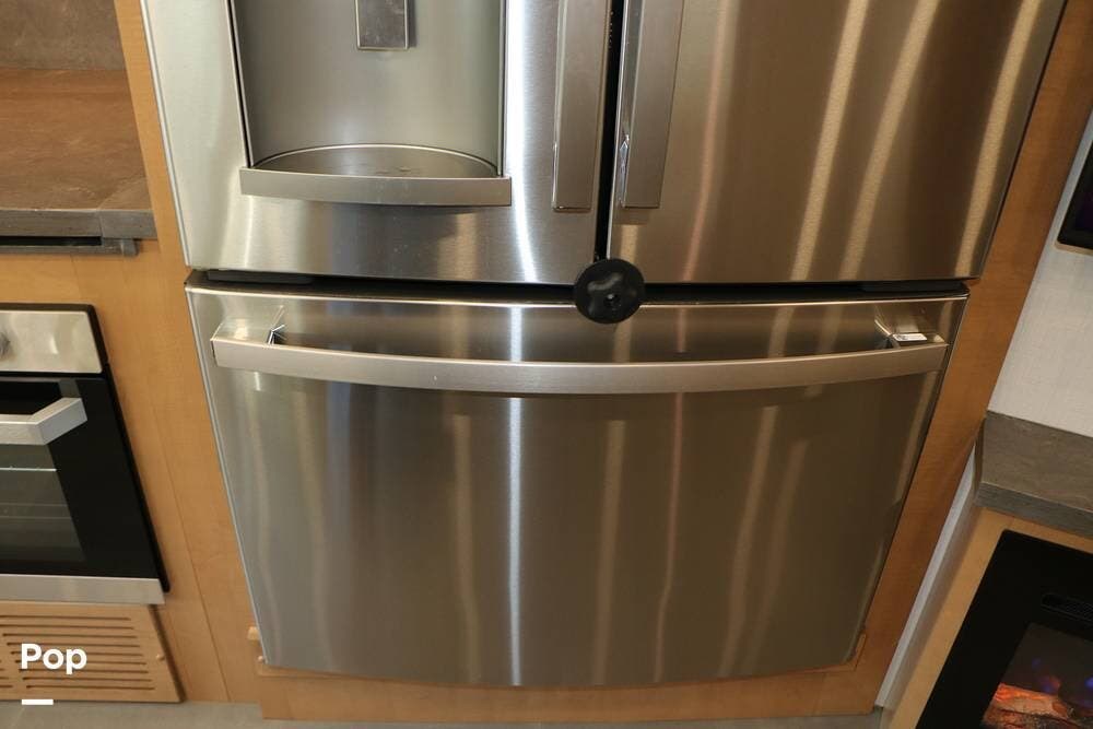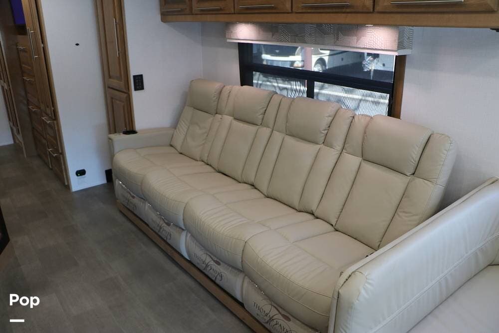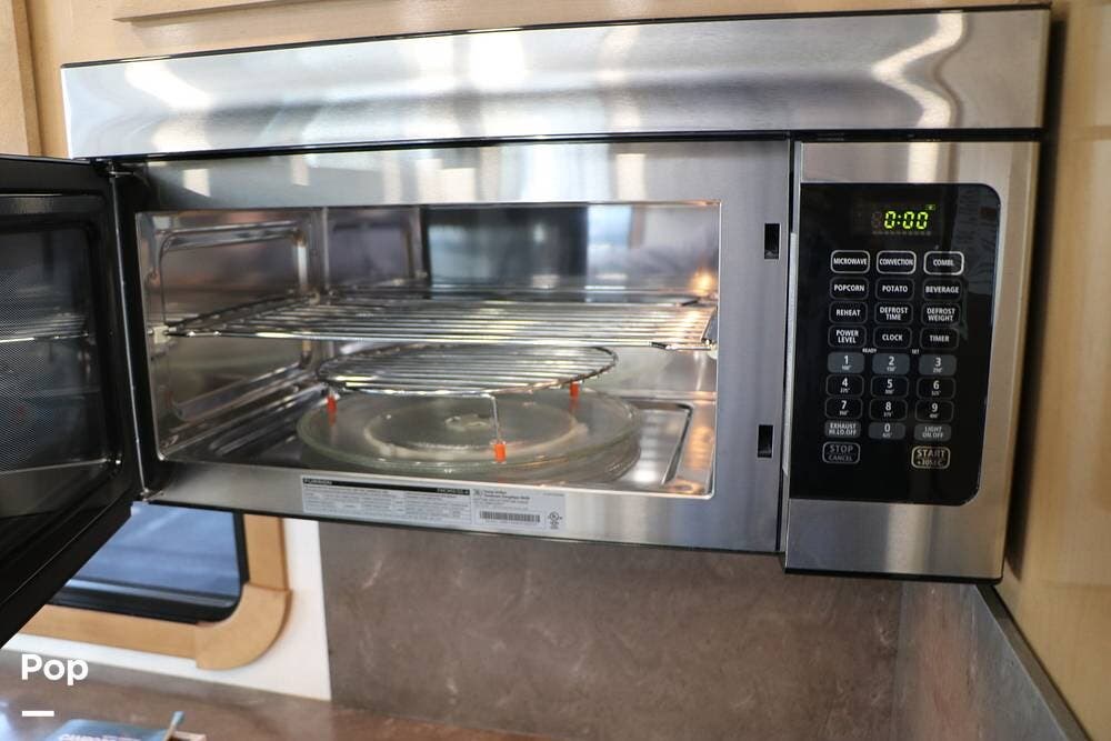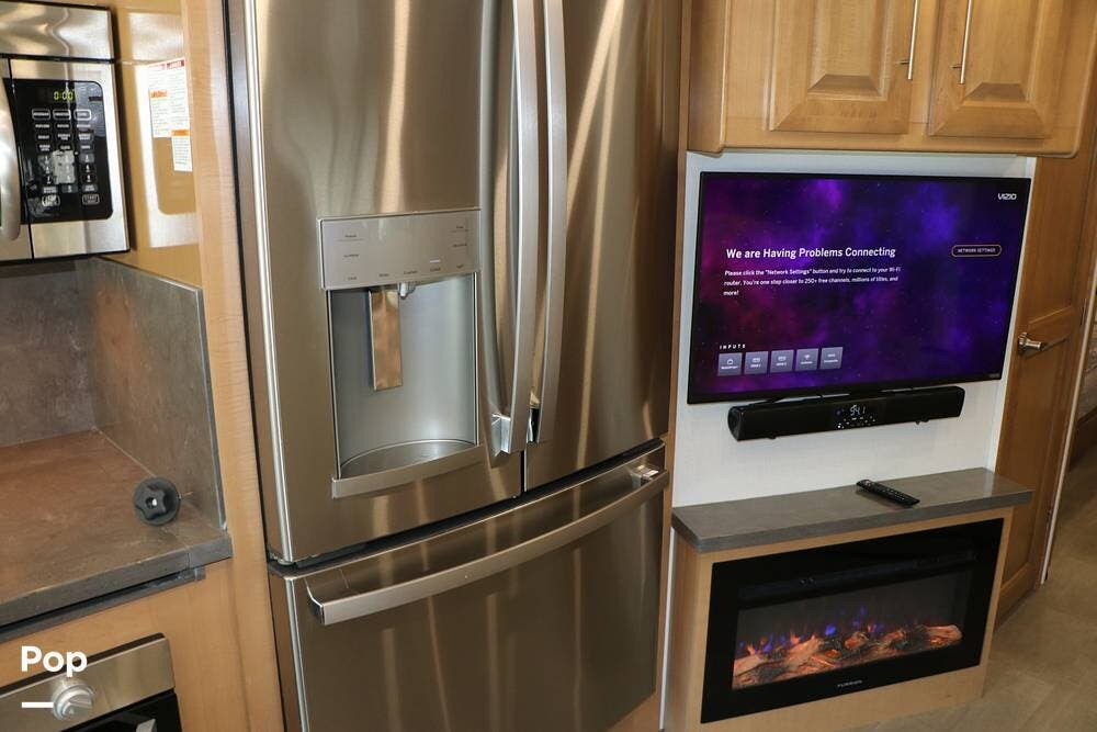 The entertainment center features a large flat screen TV, stereo sound bar, and electric fireplace that can be used for heating or just ambiance. The Dinette quickly converts into a third sleeping area if needed. The Euro Bed over the driver and passenger captains' chairs quietly drops and raises at the touch of a button.