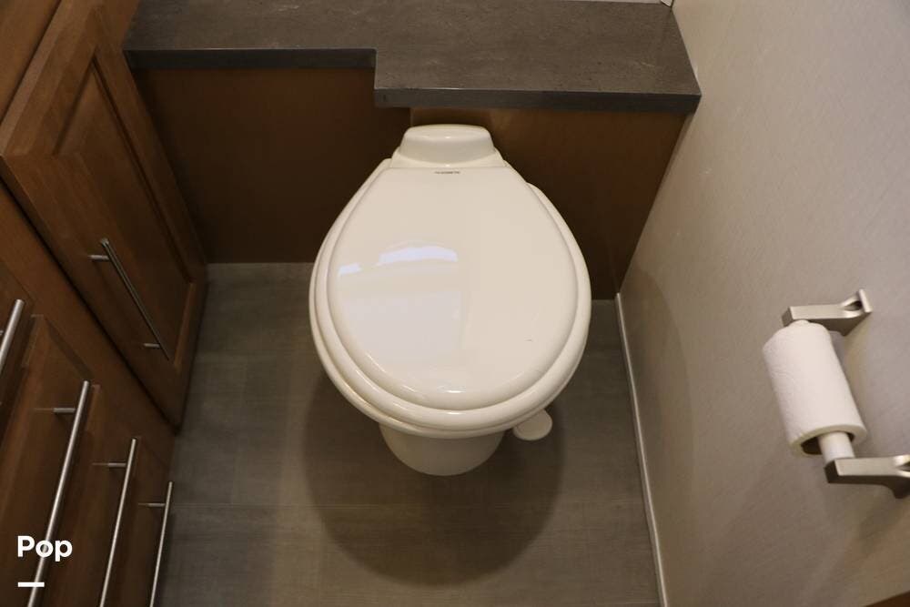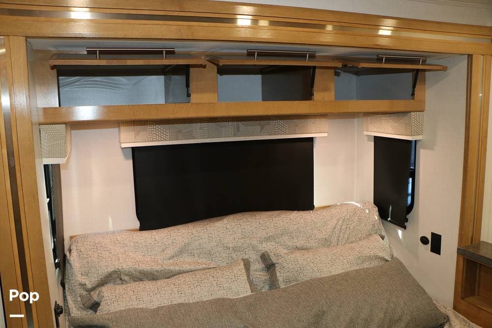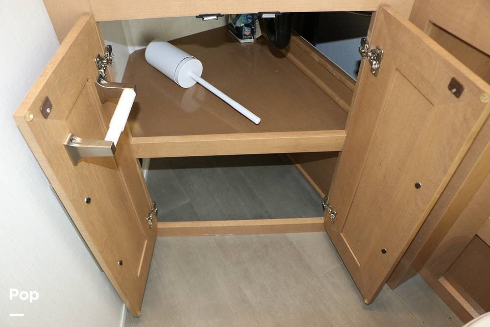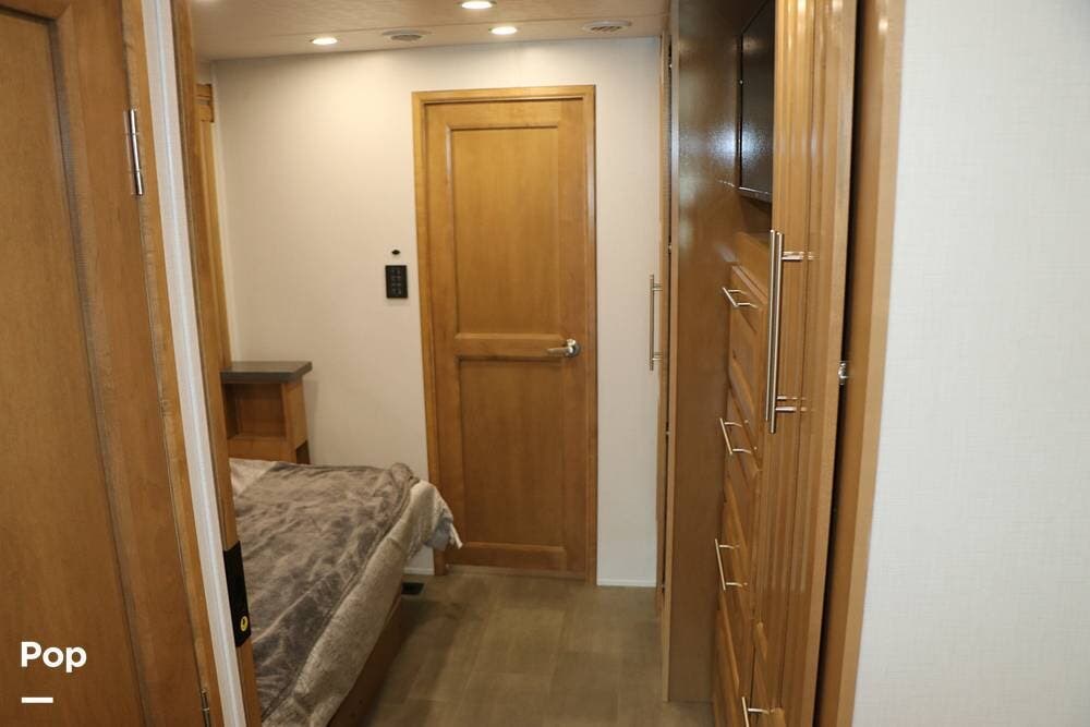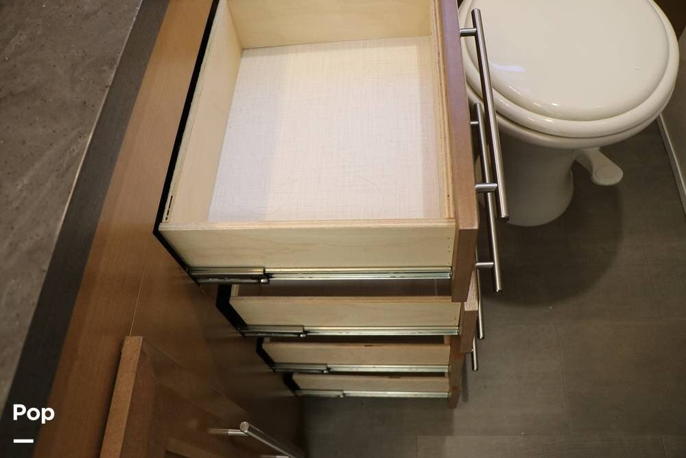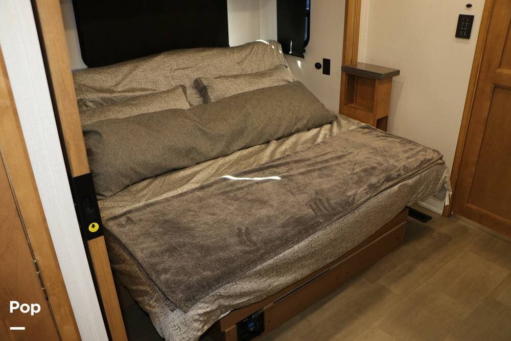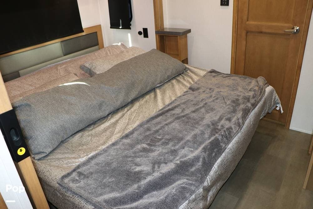 The half bath is behind the entertainment center. The pocket door separates the master suite bedroom from the living area for privacy. The master bedroom features a King Power Tilt Bed, with overhead cabinets, and at the foot of the bed, a dresser and wardrobe closet with a large flat screen TV and stacked clothes washer and dryer units.