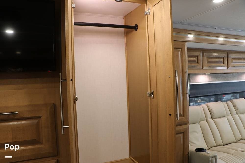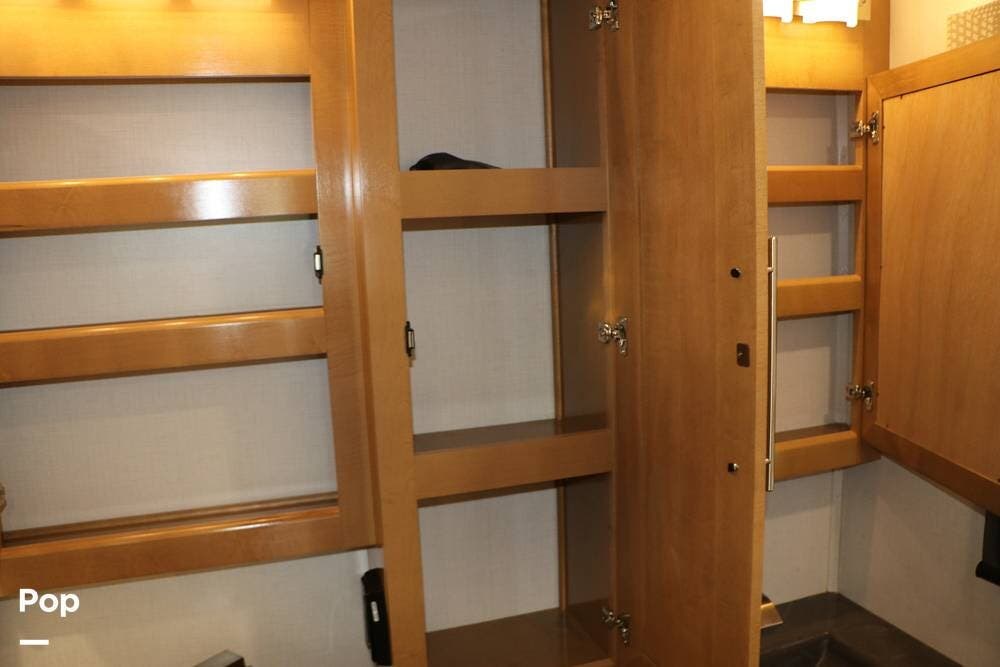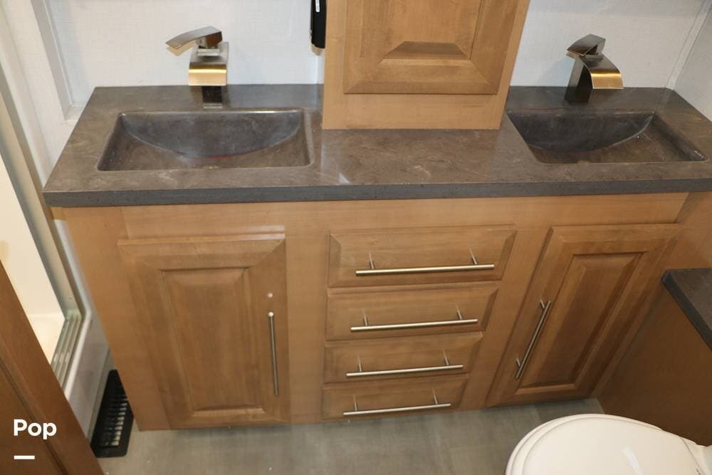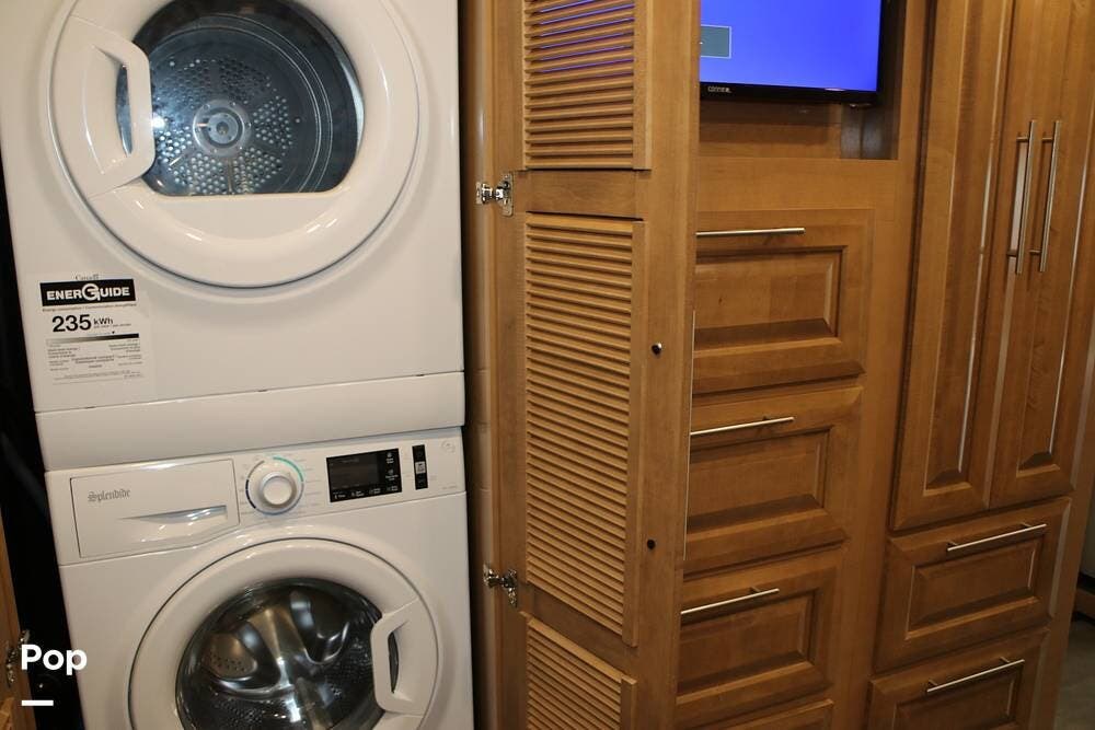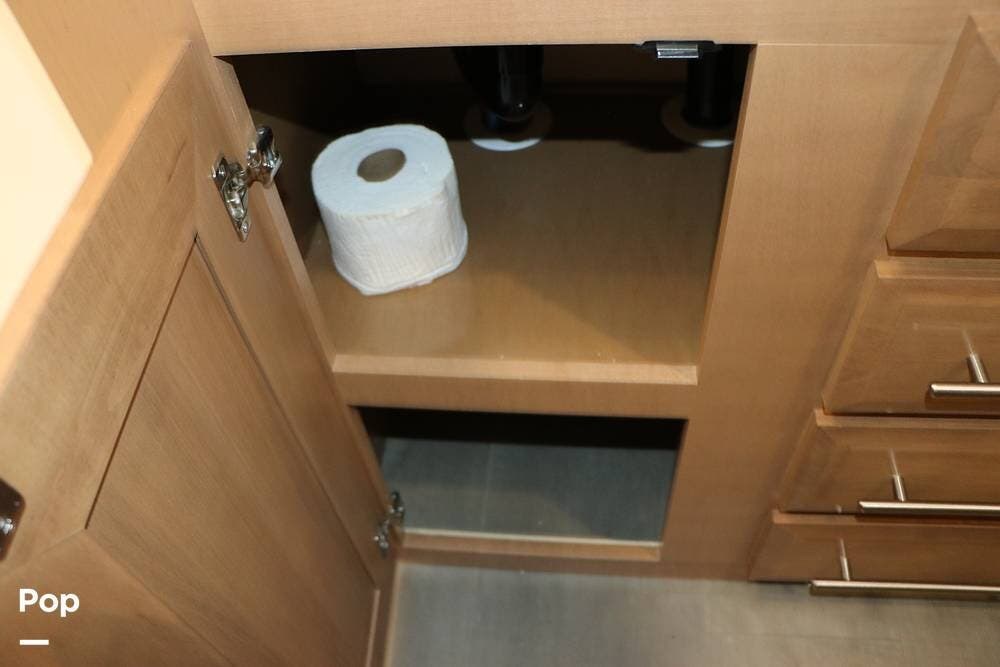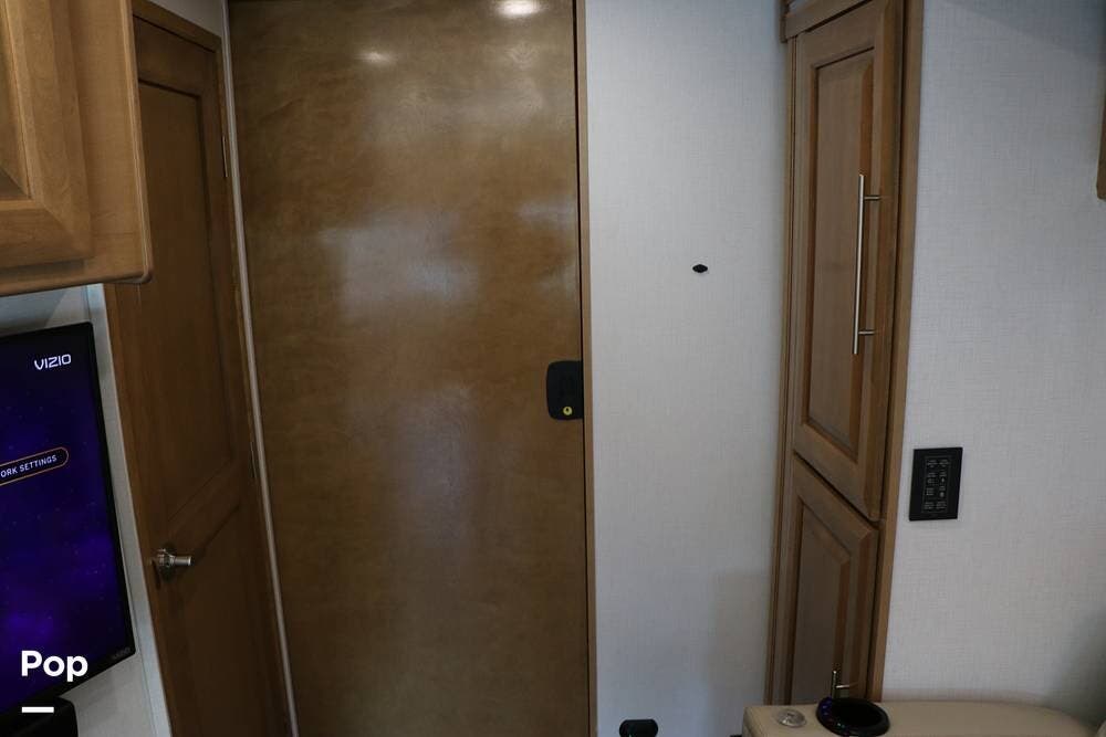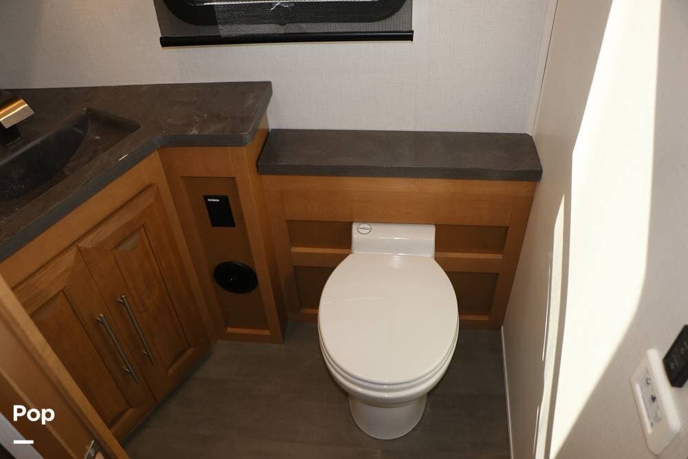 The half bath is behind the entertainment center. The pocket door separates the master suite bedroom from the living area for privacy. The master bedroom features a King Power Tilt Bed, with overhead cabinets, and at the foot of the bed, a dresser and wardrobe closet with a large flat screen TV and stacked clothes washer and dryer units.