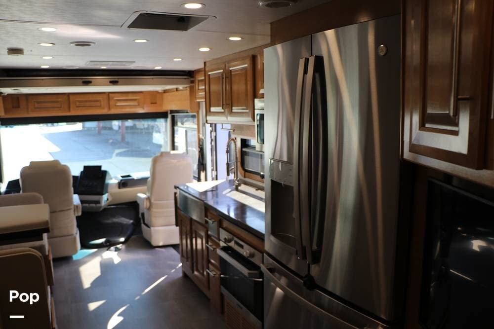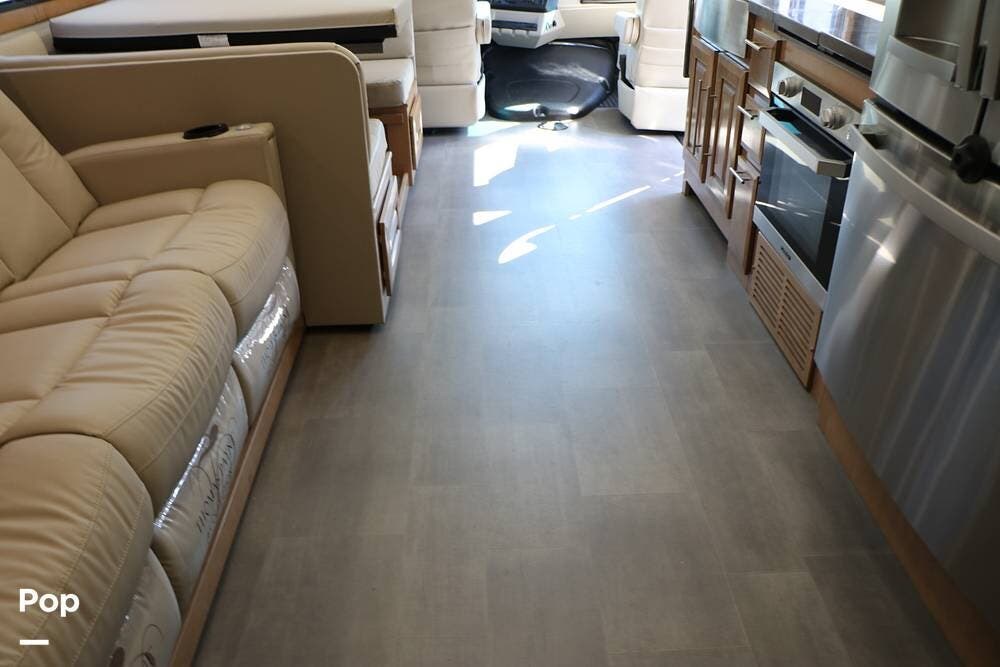 Inside the unit, it is equipped with the Residential Stainless Steel Appliance package, Solid Surface countertops throughout, and the Living Area features four theater seats with two on each end, full power with massage and heat.