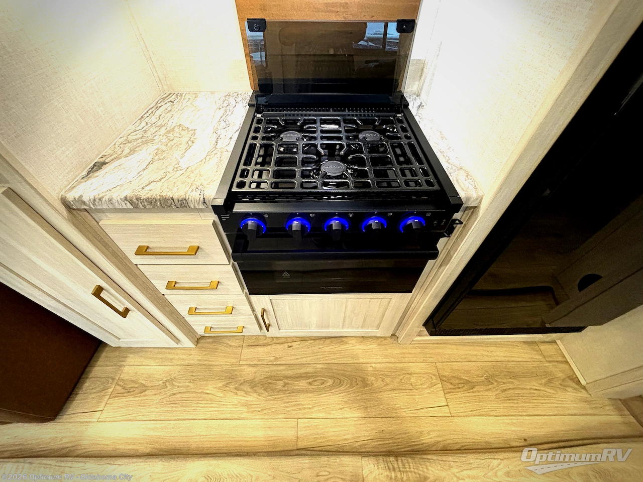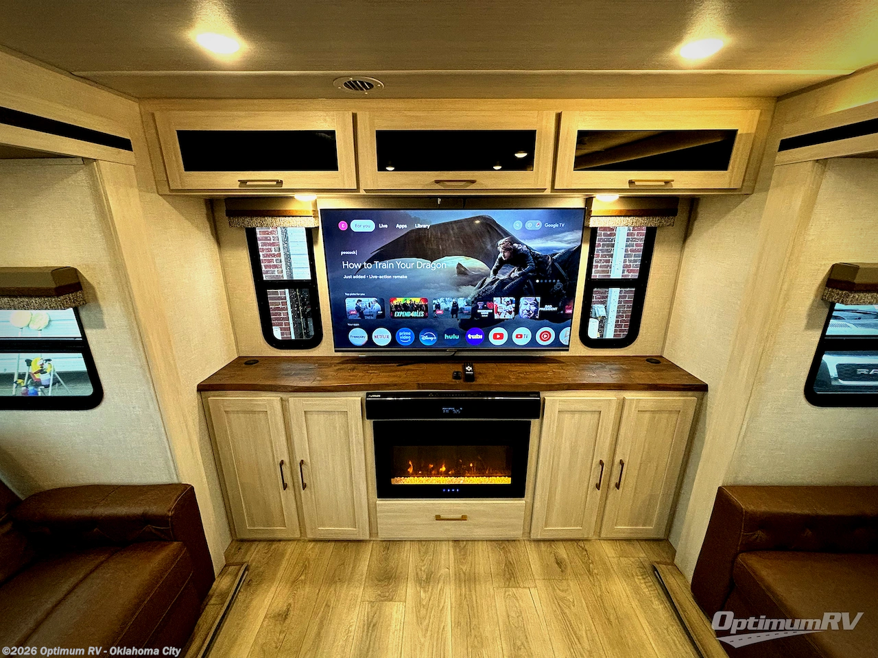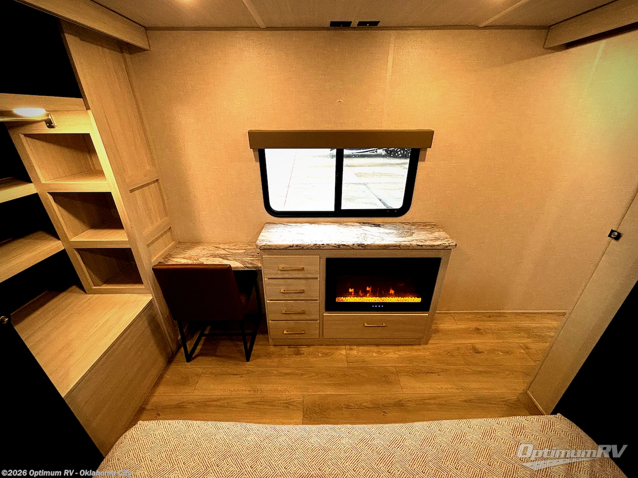 The perfect couples coach that is cozy and also features room for guests! As you enter you will notice the bar top with two chairs facing the rear of the unit where you can easily view the TV and fireplace in the living area while you enjoy your morning coffee. The combined kitchen and living area features two slides with the larger slide along the roadside featuring the kitchen appliances and a 56" tri-fold sofa which would be great for overnight family and friends. There is also a 56" theater seat facing the TV and fireplace, and a slide out free standing table with two chairs on one side and a multi-purpose ottoman than can be used where you need it anytime. Central vac will allow you to clean up easily throughout the unit. You also can choose to cook inside or out thanks to the outside kitchen featured under the 20' awning. When it's time to call it a night, you can clean up in the spacious full bath, then head to the front master bedroom to retire. There is a custom king bed slide out here, along with a full-wall wardrobe in front, a dresser and desk, a closet with washer and dryer prep, plus a second fireplace!