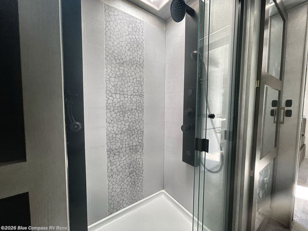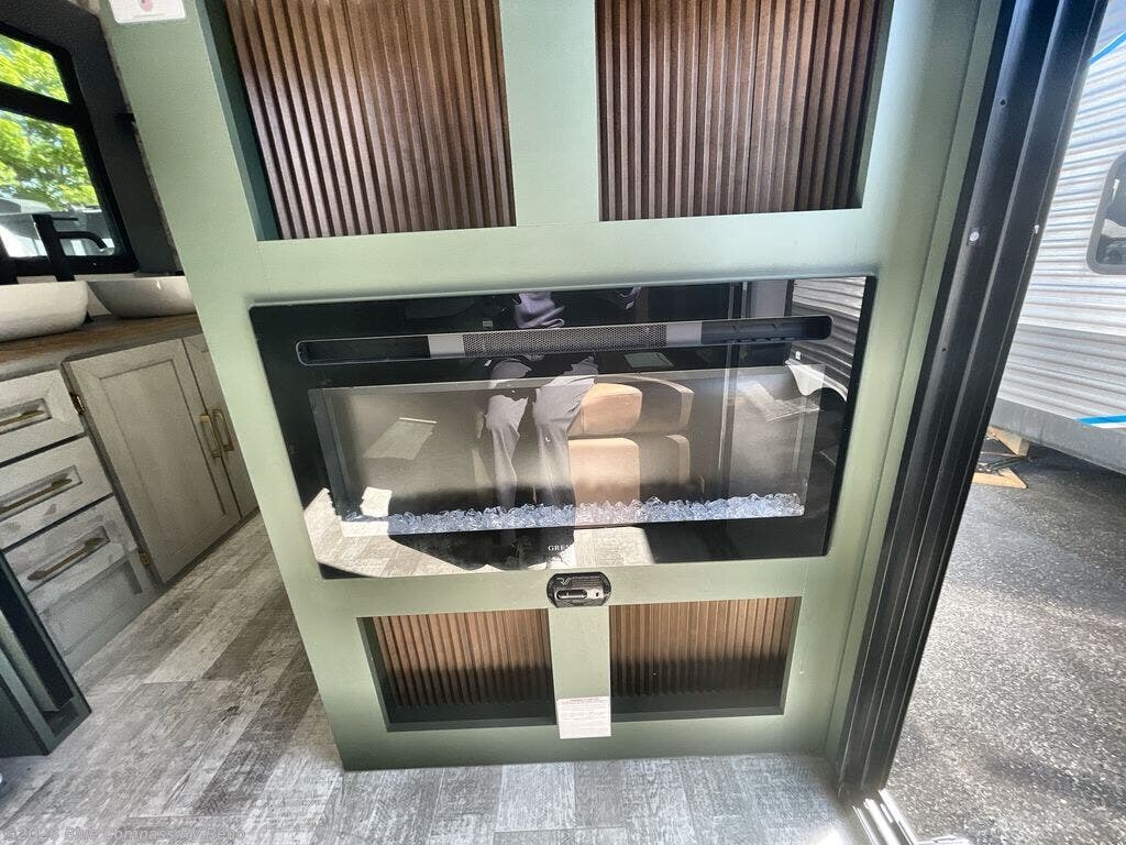 This model has a similar layout to RVS1, but you'll enjoy a fixed king bed slide out with storage instead of a fold up bed, a bedroom fireplace and a dresser, plus a desk with a chair. There are still rear doors with a sun deck, a middle living room/kitchen with a luxury lounge, and a full kitchen. The front bath is ultra luxurious with its dual bath sinks, waterfall shower, and optional washer/dryer combo!
