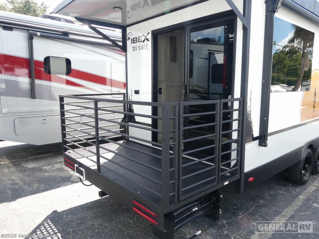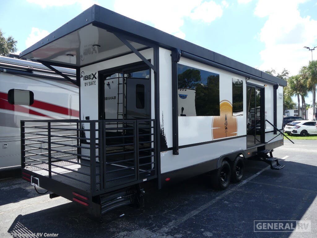 ## Forest River IBEX RV Suite travel trailer RVS1 highlights - Rear Door with Sun Deck - Luxury Lounge - Waterfall Shower - Round Kitchen Sink It won't be hard to find comfort in this travel trailer, whether you're camping on the weekends, or going full-time! There is a built-in king suite with a remote work area and standing desk that will allow you to utilize this room as a bedroom or office! There are also dual bedroom wardrobes for your things and rear doors that lead to a cozy sun deck! The middle living room/kitchen includes a luxury lounge, a fireplace, a two burner cooktop, and a 12 cu. ft. icebox refrigerator. You will love the front bath with dual bath sinks, two linen closets, plus a waterfall shower for added luxury. And the washer/dryer combo is an added benefit you will want to take advantage of! If you're looking for a more home-like travel trailer, the IBEX RV Suite by Forest River may just be perfect for you! The minute you step through the sliding glass patio doors, you will be met with luxurious features. There is a premium Bluetooth audio system in each model, plus a luxury lavatory, solid surface kitchen countertops, and a king suite. You will love the inviting dimmable sunset lighting, and the central vacuum system will make it easier than ever to clean up. Each model is constructed with a gel coat fiberglass and durable Azdel, and the upgraded sidewall insulation will help extend your camping season. All-terrain tires also come standard to make towing easier, and the sleek tinted frameless windows provide more open views!