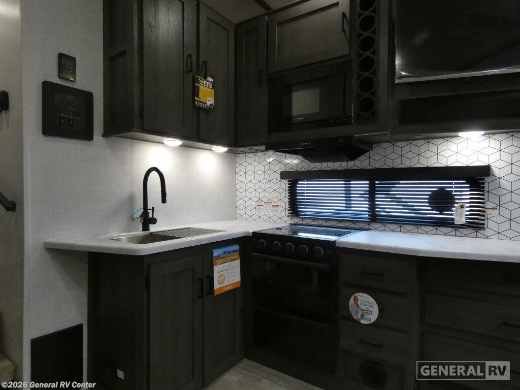 Forest River Impression fifth wheel 242RD highlights - U-Dinette - Tri-Fold Sofa - Private Front Bedroom - Walk-In Shower with Skylight - Unobstructed Pass-Through Storage Four or six can travel together in this Impression fifth wheel comfortably featuring a single slide in the open concept living/kitchen area. Along the rear wall of the unit, you will find a 70" x 40" u-shaped dinette which is perfect for gathering around to dine and play games. This can also be converted for added sleeping space if needed. The 68" tri-fold sofa adjacent is found within the roadside slide that also features a pantry and 12 volt refrigerator, which is handy for all of your snacks and perishables. Opposite, an entertainment center with 40" TV that is easily viewable from the sofa or dinette. The kitchen also provides a three burner range, overhead microwave oven and sink, along with plenty of overhead cabinets for storage. Head up to the bath and front private bedroom where you will start or end your days with a nice walk-in shower including a skylight for more headroom and natural lighting. The private bedroom features a queen bed for a comfortable nights rest, dual bedside wardrobes and nightstands, as well as a wardrobe that has been prepped for a washer and dryer if you choose to add that convenience. On the outside, you will find an unobstructed pass-through compartment for your outdoor gear, a 17' awning for added outdoor living space, and a docking station with a Shurflow water pressure regulator, and more. With any Impression mid-profile fifth wheel by Forest River, the focus of the design is comfort and value, built with quality craftsmanship and attention to customer's desires in each Impression! The exterior includes upgraded E-rated Goodyear Endurance tires made in the U.S.A., custom exterior graphics package, and One Touch automatic leveling system for easy setup. There is also an enclosed docking station and a gel coat fiberglass front cap with an automotive windshield with LED lights for style and beautiful views. The fully heated and enclosed AccessiBelly has removable underbelly panels and offers four seasons of travel. The interior has oversized opening windows in the living area for more natural lighting and good air flow, a stainless steel single bowl sink with high rise faucet with a pulldown sprayer to easily clean the dishes, and a porcelain foot flush toilet to mention a few comforts and conveniences.