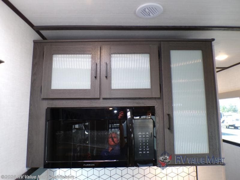 Experience a home away from home with this fifth wheel! The rear sectional sleeper sofa has a theater seating for a relaxing evening by the entertainment center with a 55" TV. Next to the entertainment center is a hidden door with cabinets and 16 cu. ft. 12V refrigerator, and above it is a 36" x 74" flip-down bunk and pad below it all housed within a slide. The kitchen has plenty of countertop space to prepare your best home cooked meals and an island with four bar stools to enjoy your meals. As you walk up the floating steps, you will notice the full bathroom to your left with a walk-in shower with a skylight for added natural lighting. The front private bedroom has a queen bed with Versa Tilt technology, wardrobes on either side and a wardrobe slide, plus there is a closet that is prepped for a washer and dryer!