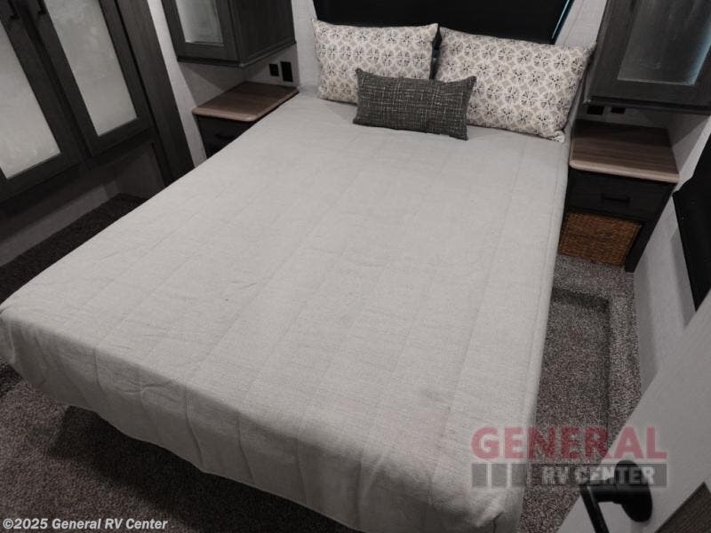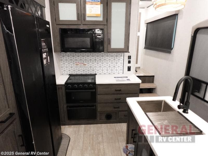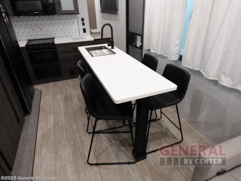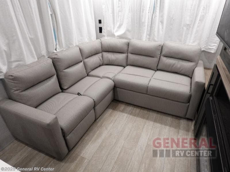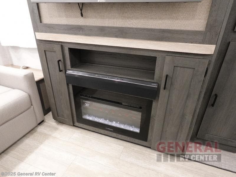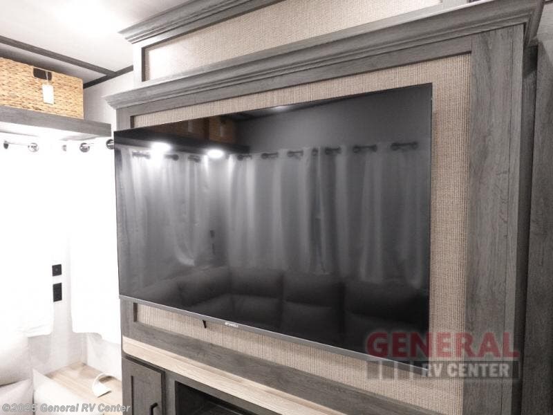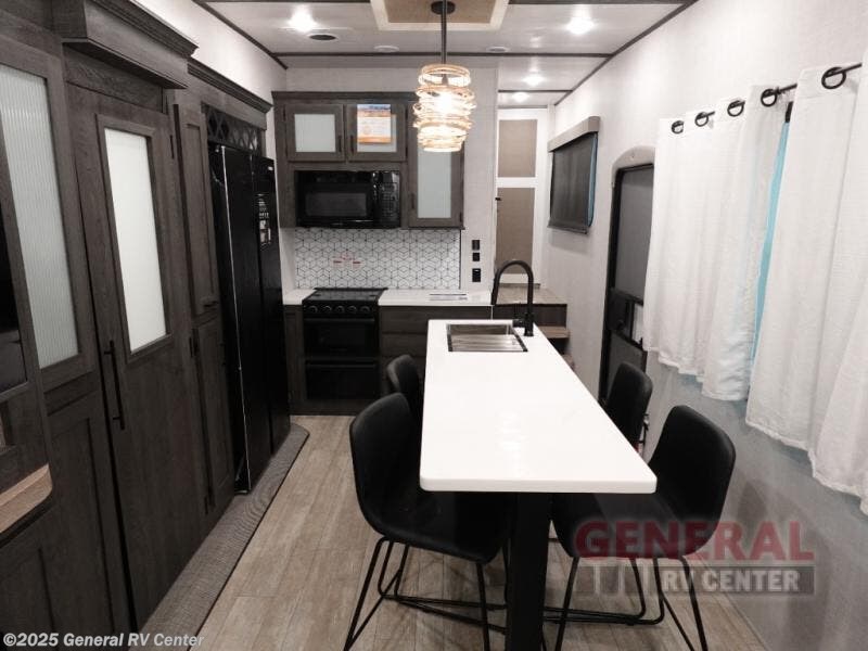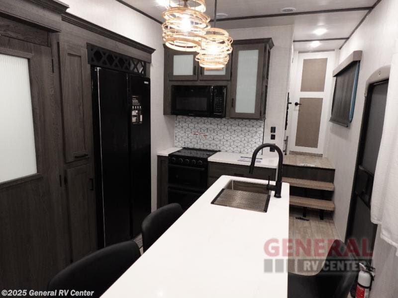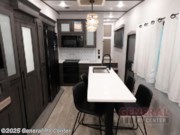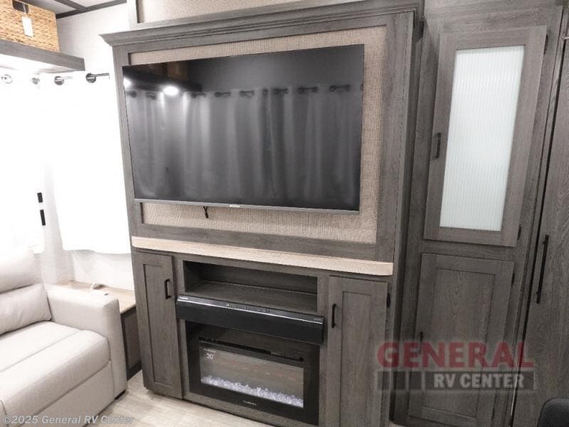 Experience a home away from home with this fifth wheel! The rear sectional sleeper sofa has a theater seating for a relaxing evening by the entertainment center with a 55" TV. Next to the entertainment center is a hidden door with cabinets and 16 cu. ft. 12V refrigerator, and above it is a 36" x 74" flip-down bunk and pad below it all housed within a slide. The kitchen has plenty of countertop space to prepare your best home cooked meals and an island with four bar stools to enjoy your meals. As you walk up the floating steps, you will notice the full bathroom to your left with a walk-in shower with a skylight for added natural lighting. The front private bedroom has a queen bed with Versa Tilt technology, wardrobes on either side and a wardrobe slide, plus there is a closet that is prepped for a washer and dryer!