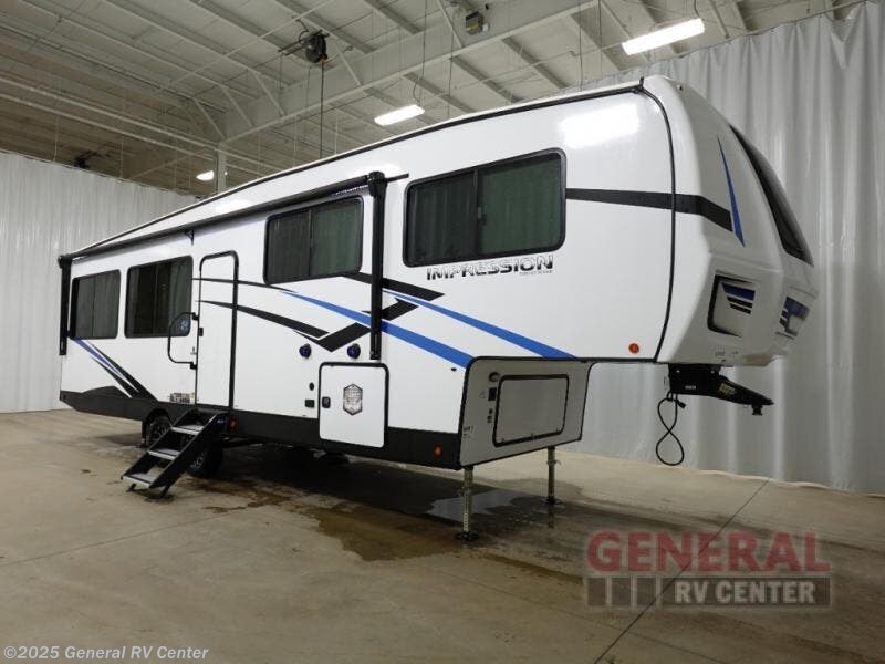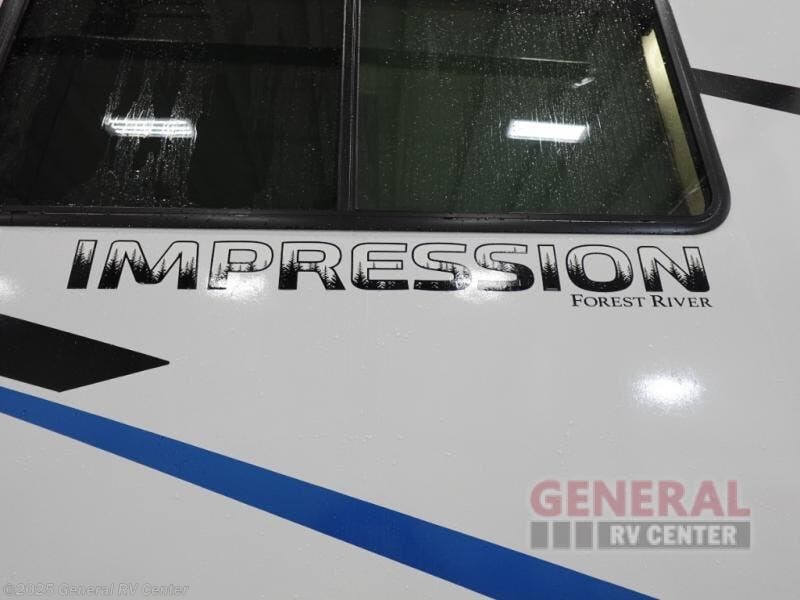 With any Impression mid-profile fifth wheel by Forest River, the focus of the design is comfort and value, built with quality craftsmanship and attention to customer's desires in each Impression! The exterior includes upgraded E-rated Goodyear Endurance tires made in the U.S.A., custom exterior graphics package, and One Touch automatic leveling system for easy setup. There is also an enclosed docking station and a gel coat fiberglass front cap with an automotive windshield with LED lights for style and beautiful views. The fully heated and enclosed AccessiBelly has removable underbelly panels and offers four seasons of travel. The interior has oversized opening windows in the living area for more natural lighting and good air flow, a stainless steel single bowl sink with high rise faucet with a pulldown sprayer to easily clean the dishes, and a porcelain foot flush toilet to mention a few comforts and conveniences.