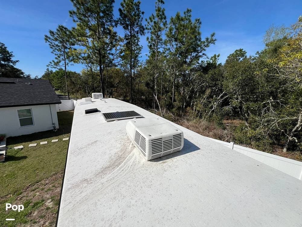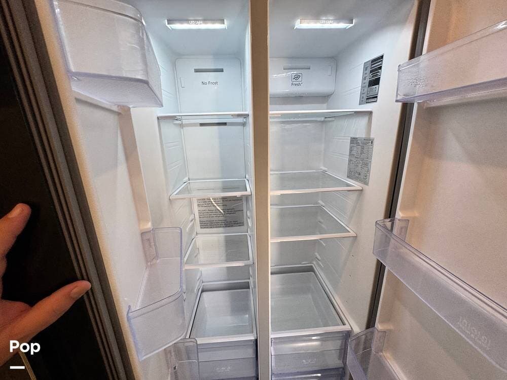 Interior amenities include a 15k air conditioning unit, one full bathroom with a shower, a large LED television entertainment center, laundry washer/dryer hookups, and a fireplace situated beneath the entertainment center.