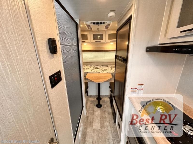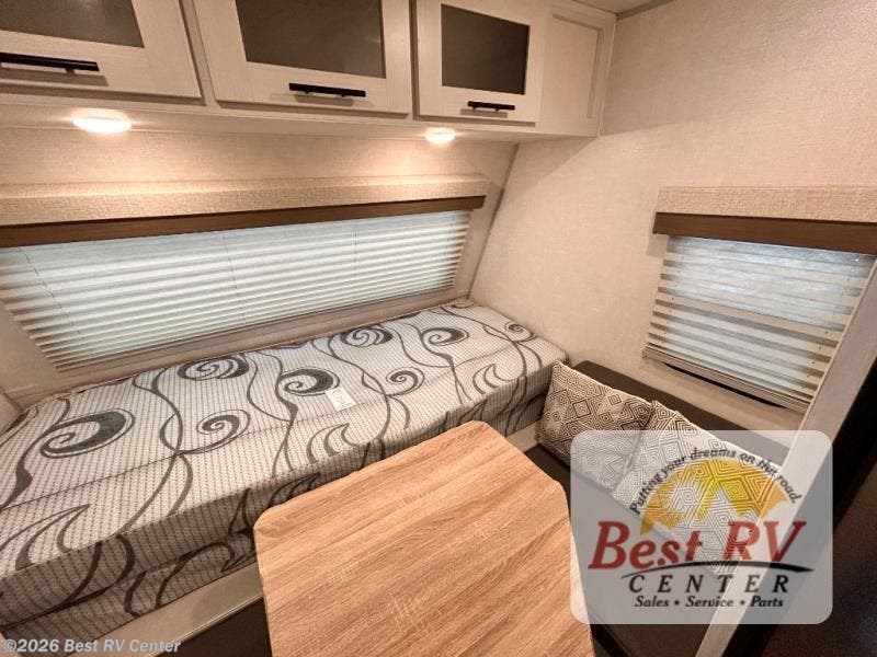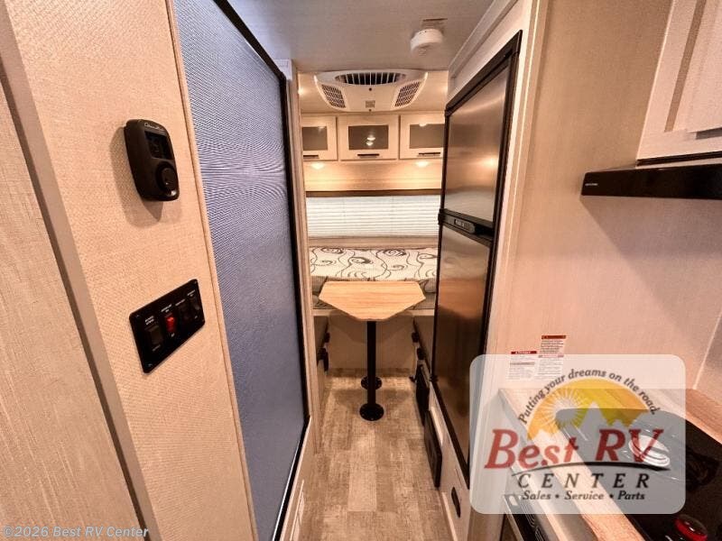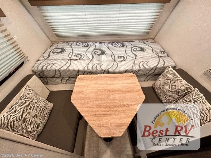 This is the perfect couples unit that features everything that you need to enjoy traveling and exploring yet keeping your tow length and weight down. The unique rear entry makes this unit easy to access, and just inside the rear door there is a private toilet area for quick access when you are outside and you need the bathroom. A front queen bed that is 60" x 74" provides a great night's rest, and can easily convert to a booth dinette when needed for inside seating and meals. The two burner cooktop, sink, and refrigerator allow you to make easy camp meals inside if you'd like.
