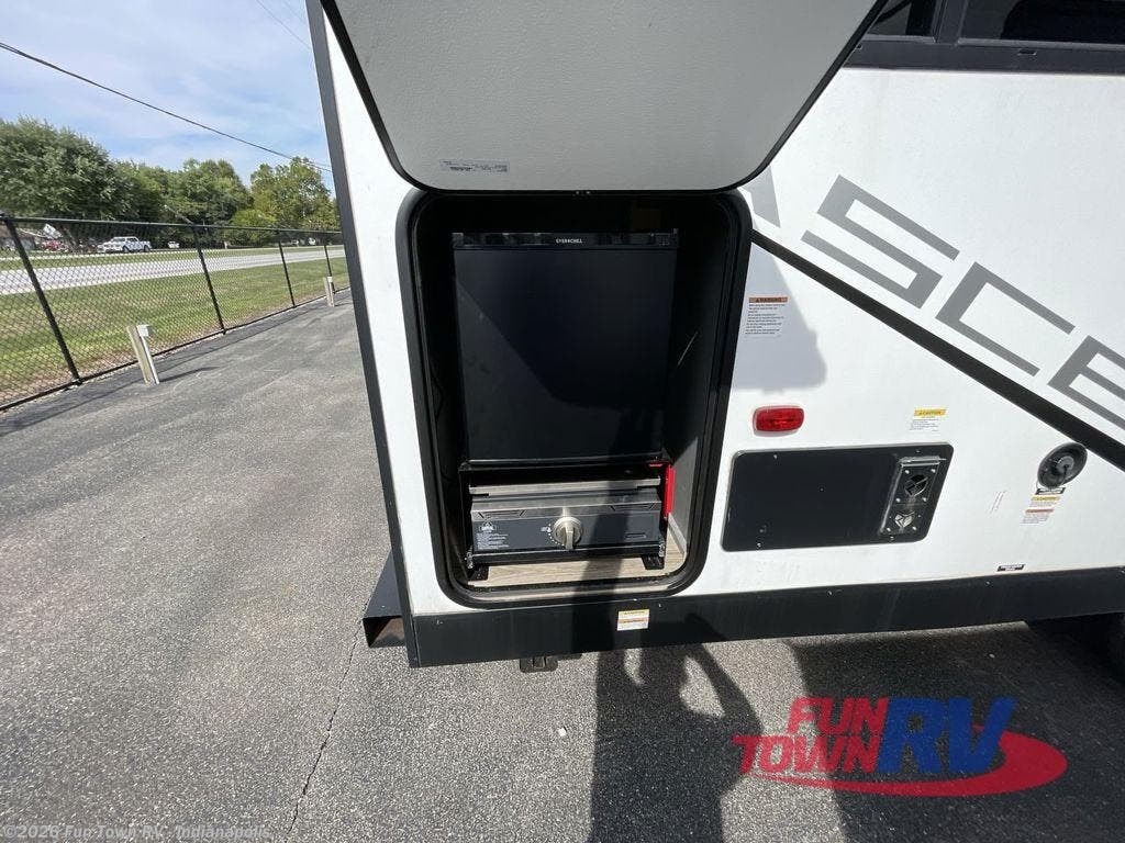 This travel trailer provides ample space and amenities just like home! Once you step inside, you'll find a rear kitchen with tons of counter space and the living area with theater seating within a slide with direct TV viewing. There is a bar top with two stools where the little ones can enjoy their breakfast at, and a shoe rack where shoes won't get in the way. Head to the front of the unit to enjoy the private bedroom with a king bed slide out, a dresser with a TV hookup, plus a walk-in wardrobe, complete with washer and dryer prep! And don't overlook the exterior with its outdoor LP griddle and mini refrigerator, Solid Step entry steps, and quick drop stabilizer jacks for maximum stability!