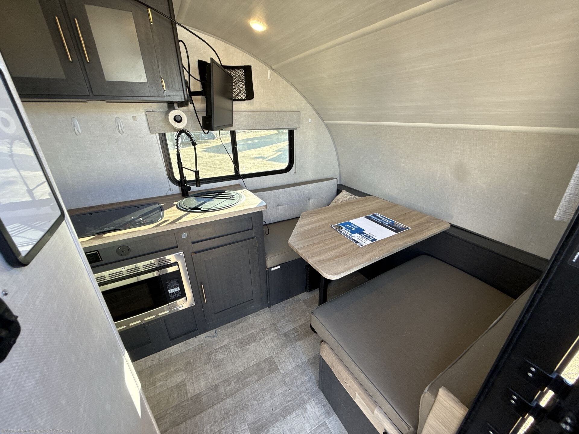 This R Pod travel trailer by Forest River is perfect for weekend trips or month-long vacations to enjoy the great outdoors with conveniences of home. You can easily sleep three people with a rear RV queen bed and a front dinette folded down for the little ones. This unit also includes a two-burner cooktop and convection microwave to make meals inside. You will also find a convenient wet bath where you can easily get ready for bed each night.