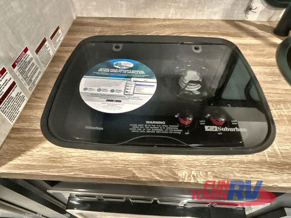 This R Pod travel trailer by Forest River is perfect for weekend trips or month-long vacations to enjoy the great outdoors with conveniences of home. You can easily sleep three people with a rear RV queen bed and a front dinette folded down for the little ones. This unit also includes a two-burner cooktop and convection microwave to make meals inside. You will also find a convenient wet bath where you can easily get ready for bed each night.