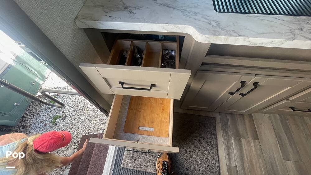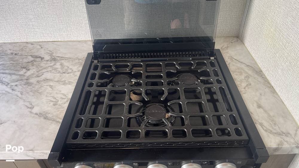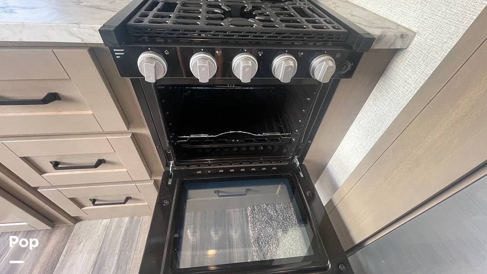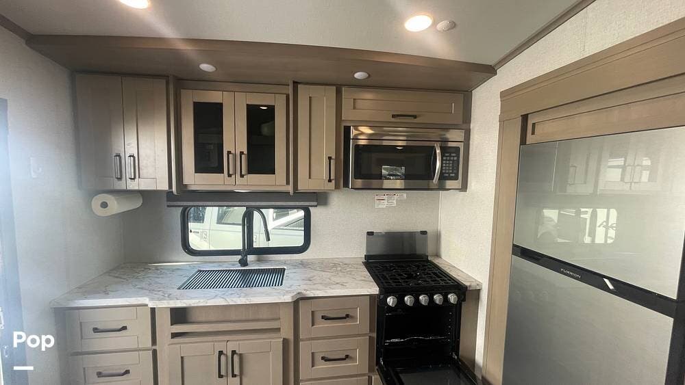The rear kitchen has a 10-cubic-foot 12V refrigerator, three-burner cooktop, convection microwave, oven, and solid-surface countertops, offering ample prep space for gourmet meals.