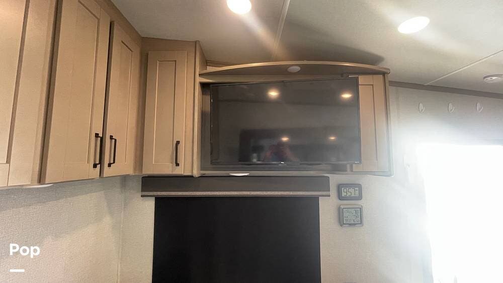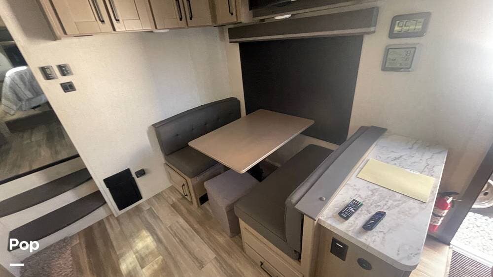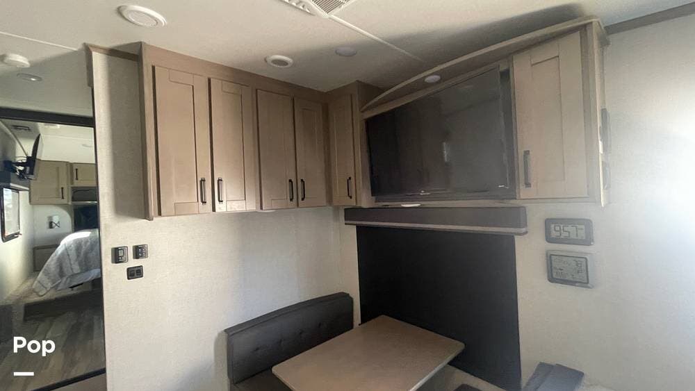 The cozy living area includes theater seating, a booth dinette that converts for guests, and large panoramic windows. It is paired with a Bluetooth stereo and LED TV for entertainment.