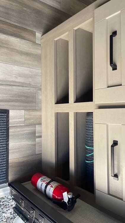 Step inside to a modern, residential-inspired cabin featuring the Peace of Mind Package, with premium Congoleum flooring, residential cabinetry, blackout shades, and stylish matte black fixtures.