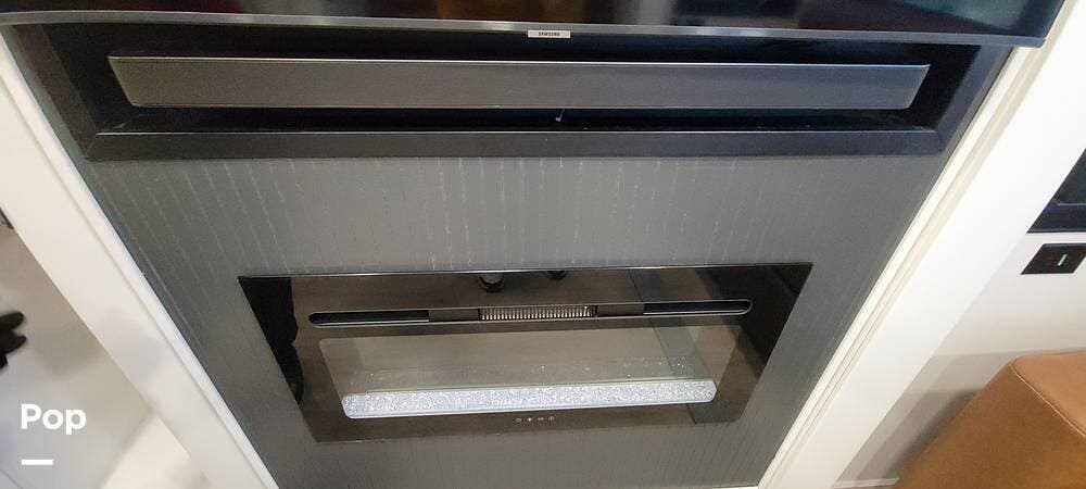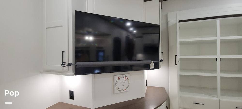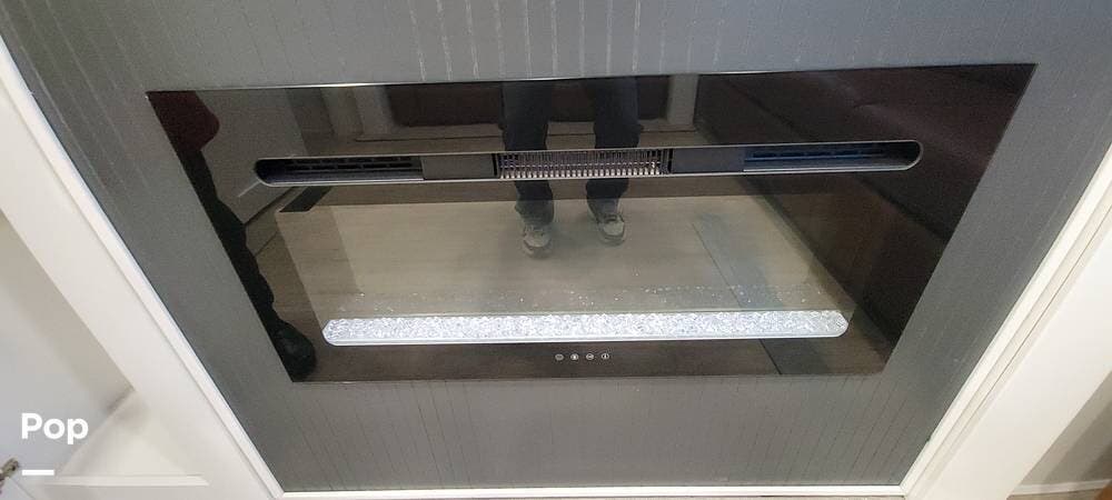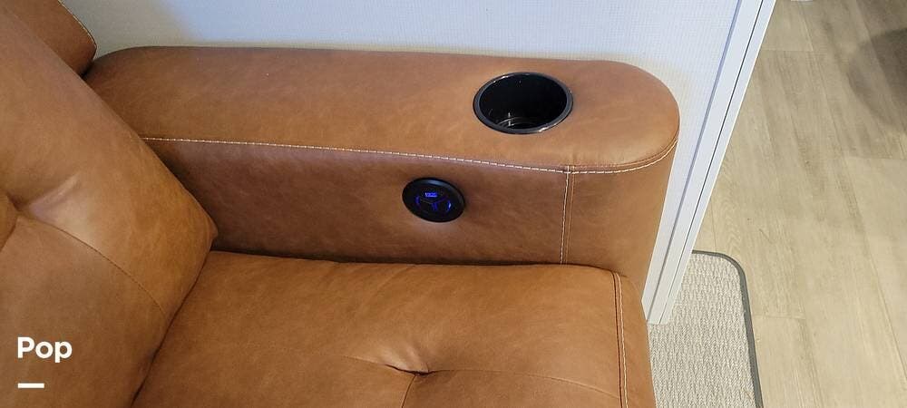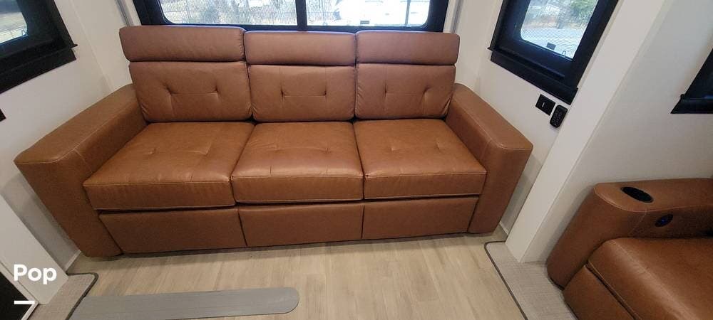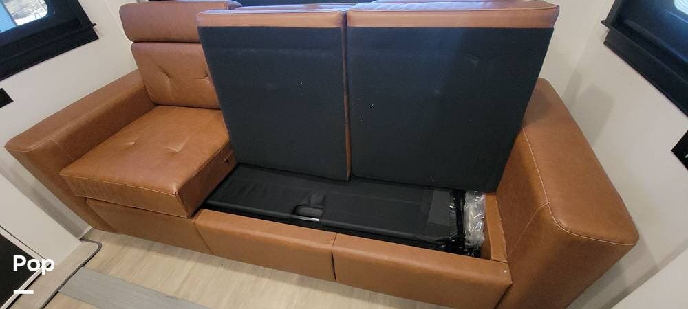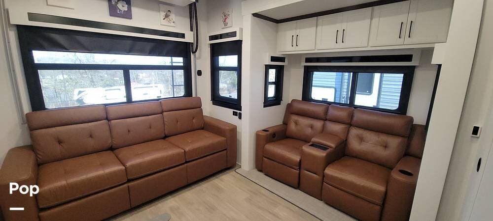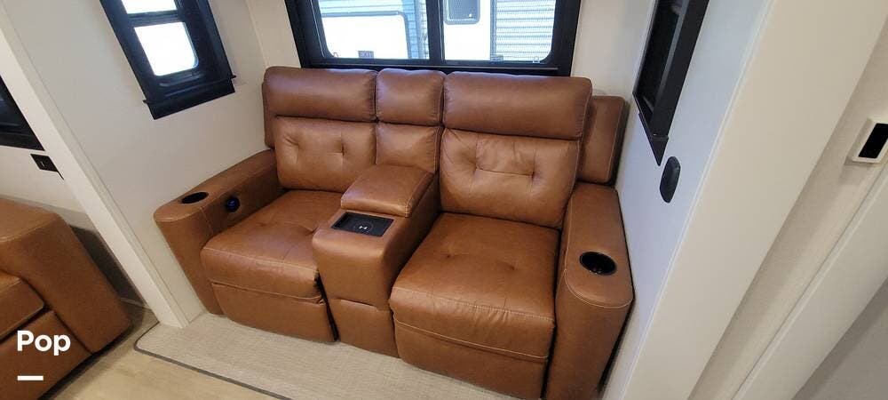 The 442MC floor plan features a rear lounge area separate from the main living area. It comes with a large-screen TV with storage behind it and an electric fireplace. It also has a pull-out sofa bed, two stadium-style electric recliners, and a half bath!