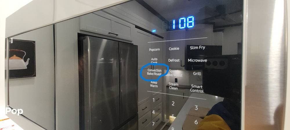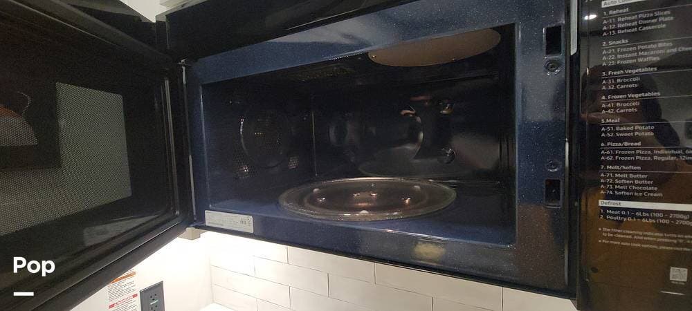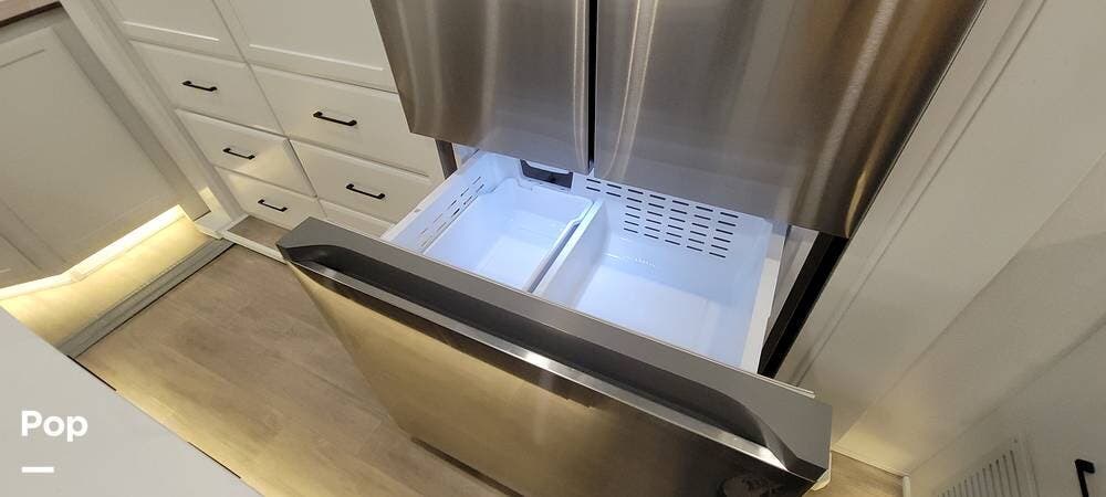 Inside it has an 18 cu. ft. French door refrigerator/freezer, a four-burner cooktop with oven, a 30" microwave convection oven, and a residential King-size bed.