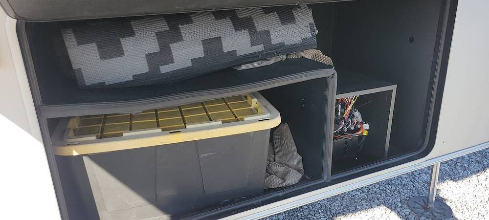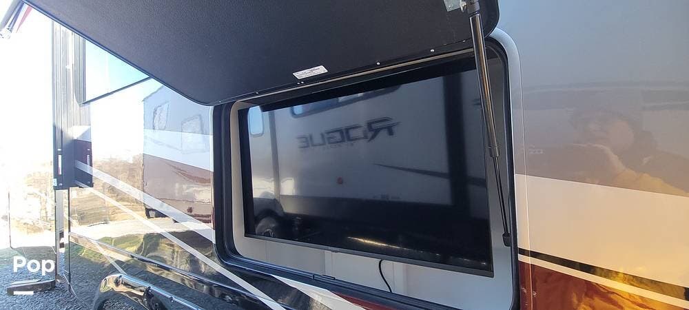 Outside, you have 50 Amp service, 12V heated holding tanks, and solar panels. It also has two outdoor awnings and an outdoor television.