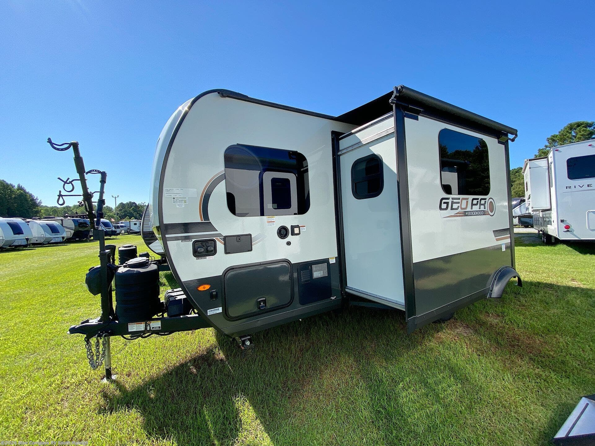 With any Rockwood GEO Pro travel trailer by Forest River you will enjoy easy towing, durable construction, and off-road capabilities with larger 15" tires and a lift kit! Package A includes a 200W solar panel and an 1800W inverter to go off-grid when you want, a tire pressure monitoring system and Key Alike door and compartment locks, plus a power awning to relax outdoors. Each model is constructed with complete composite wall construction for added strength and durability, and the torsion axle, Rubber-Ryde suspension will make towing easier than ever. Inside, you'll find sleek roller shades and hidden hinge cabinet doors, a 12V refrigerator and a microwave, plus a 20,000 BTU furnace to keep you warm during the colder camping months.