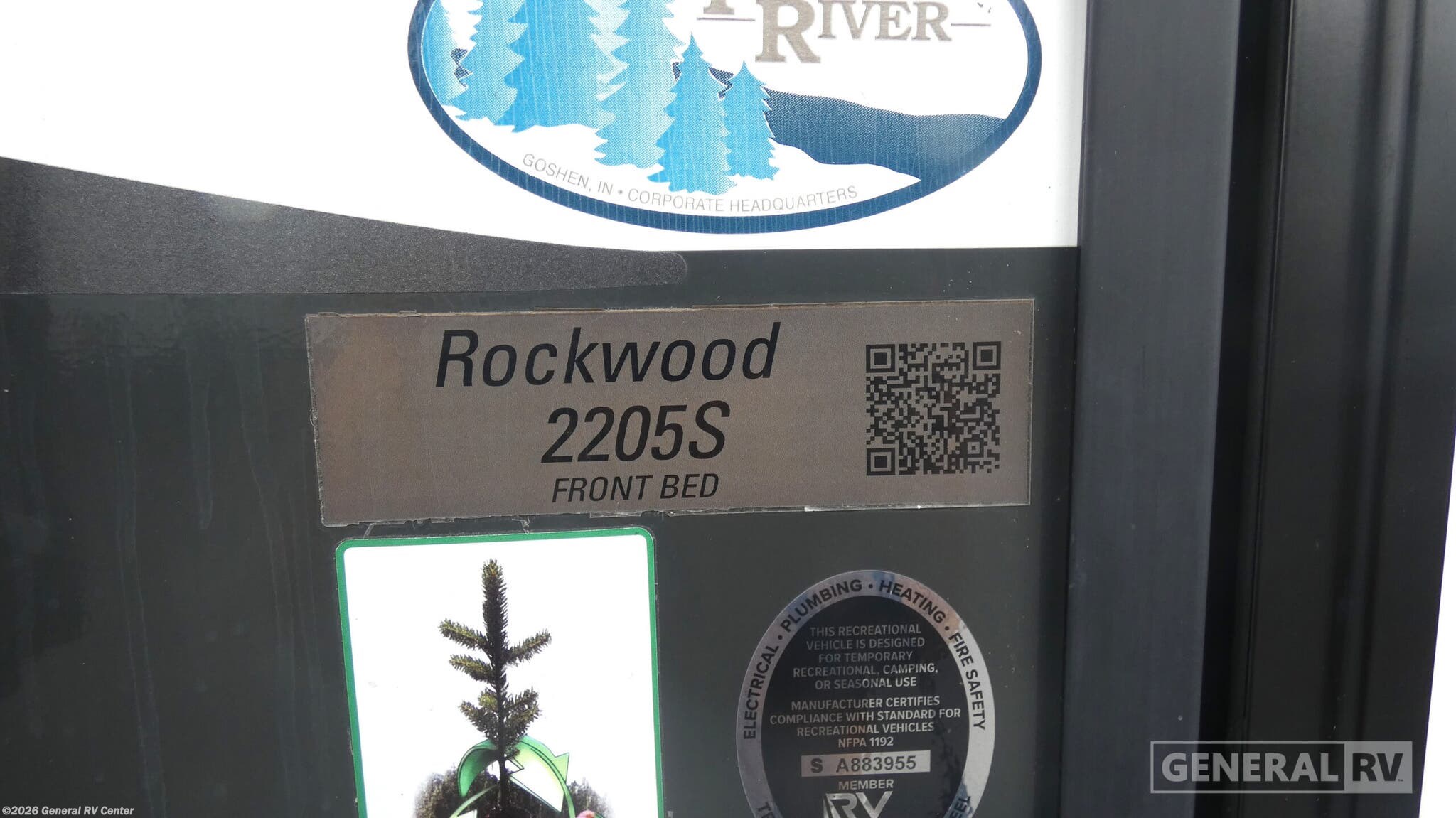 **Forest River Rockwood Mini Lite travel trailer 2205S highlights:** - Entertainment Center - Queen Bed - 15' Power Awning with LED Lights - Water Filtration System - Bath Skylight Enjoy the camping season with your spouse, friend, or significant other in this cozy travel trailer for two. Each morning, you can have your coffee on the 67" theater seats with a table within the slide out, then head outdoors to make pancakes on the outdoor griddle with an LP hookup. The interior kitchen includes a three burner cooktop, a microwave oven, plus a 12 volt refrigerator for perishables. An entertainment center with a fireplace will make your space feel more like home, and what's better than sleeping on your own queen bed with dual bedroom wardrobes for your clothes!? Each Rockwood Mini Lite travel trailer by Forest River is constructed with a fully laminated one-piece walkable roof, sleek frameless windows, and a six-sided full aluminum frame for strength and durability. The 12V thermostatically controlled heated tanks, plus radiant foil in the underbelly, front caps, and slide out floors will allow you to camp well into the colder months, and the 200W roof solar panel will be perfect for a little off-gridding. Each model includes solid surface kitchen countertops, solid wood cabinet doors, night roller shades, plus many more interior features. Having an Air 360+ omnidirectional antenna with wifi prep on board will allow you to get some work done if it's needed, and the power tongue jack provides hassle-free set up, so you can enjoy more time relaxing!