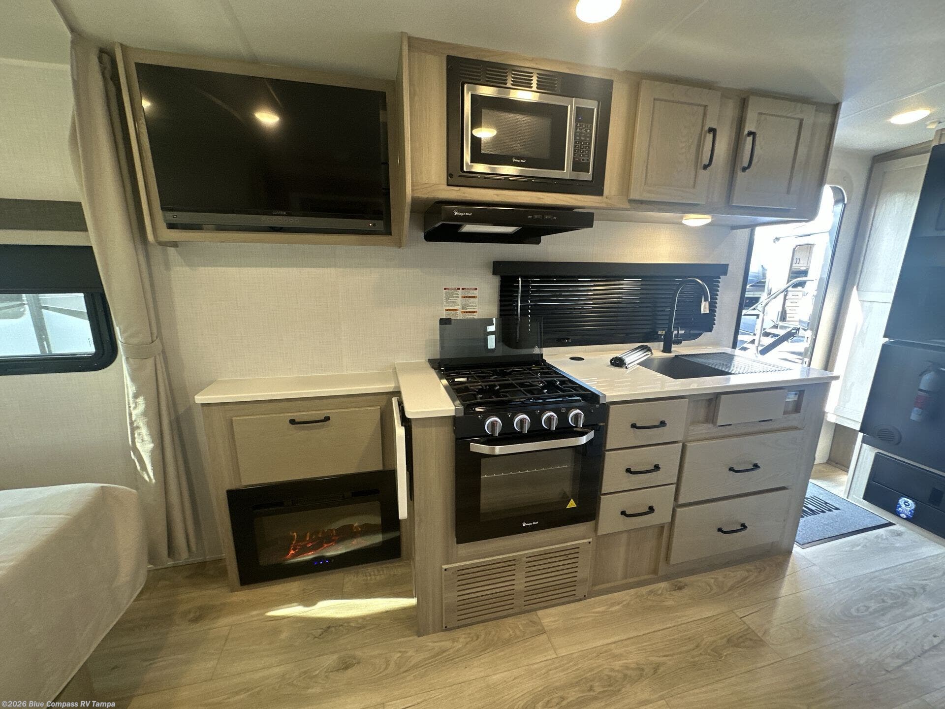 Enjoy the camping season with your spouse, friend, or significant other in this cozy travel trailer for two. Each morning, you can have your coffee on the 67" theater seats with a table within the slide out, then head outdoors to make pancakes on the outdoor griddle with an LP hookup. The interior kitchen includes a three burner cooktop, a microwave oven, plus a 12 volt refrigerator for perishables. An entertainment center with a fireplace will make your space feel more like home, and what's better than sleeping on your own queen bed with dual bedroom wardrobes for your clothes!?