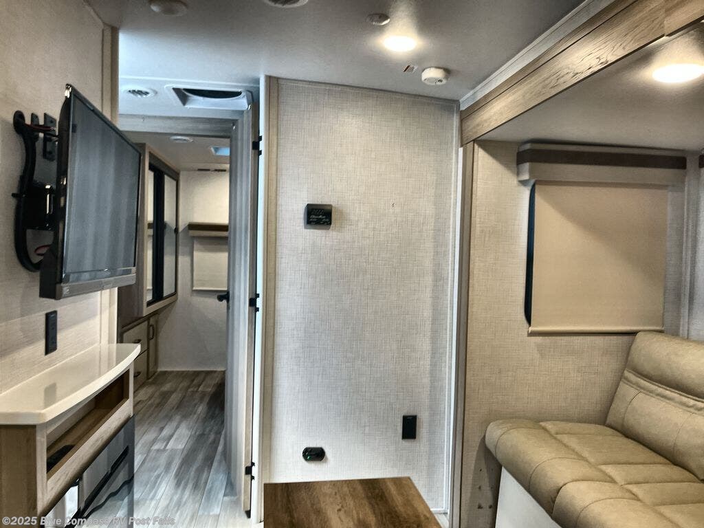 Escape the city life for weekend trips in this cozy couple's trailer. The dual entry doors will allow you to enter in through the rear private bedroom, or the front kitchen/main living area for convenience. You will enjoy relaxing on the theater seating across from the LED TV and fireplace in the evenings, or you can visit outdoors under the 19' power awning. You'll also find an exterior griddle here for quick meals and exterior storage for the fishing poles or hiking gear. This model also includes a walk-through bath with a shower skylight, a linen closet, plus a Showermiser Water Saving System. And don't worry about storage space inside since this model includes an entryway pantry/closet, a second pantry in the front kitchen, plus a large bedroom wardrobe to keep your clothes wrinkle-free!