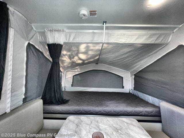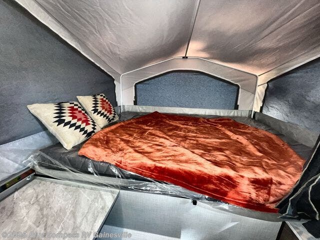 With any Rockwood OTG (Off The Ground) folding pop-up camper by Forest River, you will enjoy a more simple approach to outdoor fun. If you're a regular tent camper, but are looking for a little more comfort, then take a look at these easy-to-tow models! There are electric brakes, nitrogen filled tires, and leaf spring axles that provide that easy towing, and the black exterior is sure to be eye-catching. A one-piece screen door also comes standard so you can let fresh air in, while keeping bugs out, and the LED interior lights will be an added benefit you didn't have while tent camping. Each model also includes residential style cabinet doors, wood look flooring, and an Autumn Wood interior for a more outdoorsy feel!