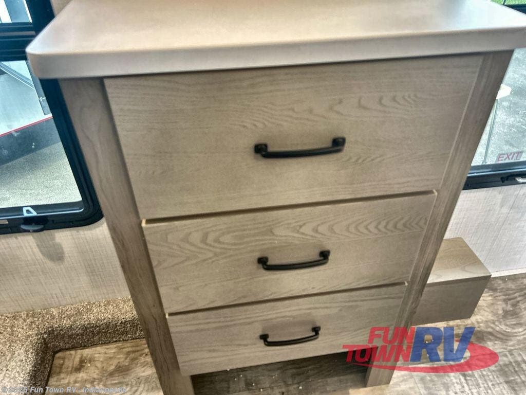 Looking for a spacious bedroom and bathroom for the perfect couple's RV with extra sleeping space for guests? This model provides a queen bed slide out for more interior floor space to get to the front wardrobe with shelves, and the dresser with a window above for great views of your campsite. The bathroom offers a shower with a seat, linen storage, and counter space for your toiletries. The main living and kitchen combined area has a hide-a-bed sofa slide that allows two guests to stay the night or you can choose the optional theater seat. There is also a breakfast bar with stools to dine at, and a U-shaped counter including appliances to make meals and store leftovers. And you will find exterior storage to bring along camping chairs and extra gear.