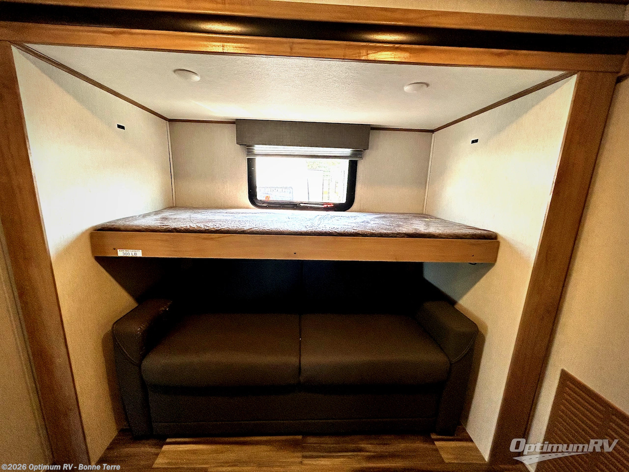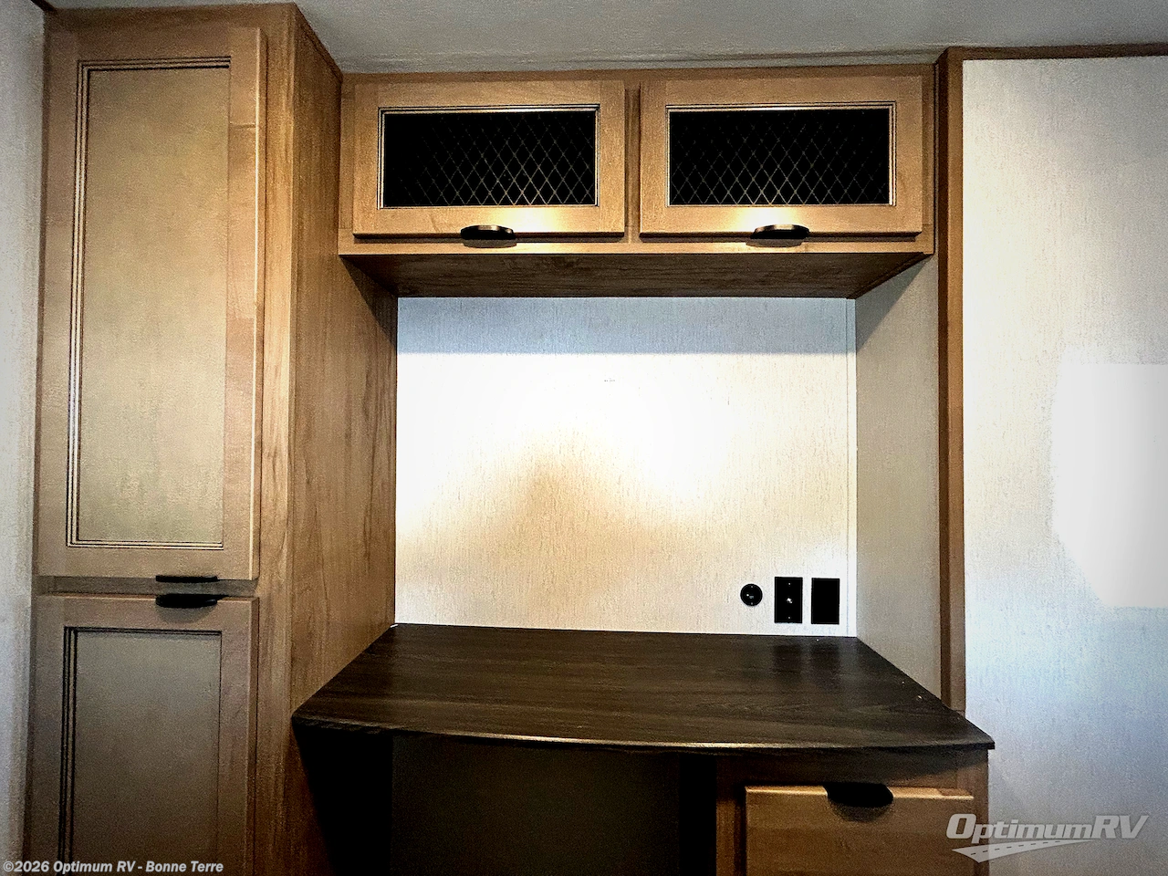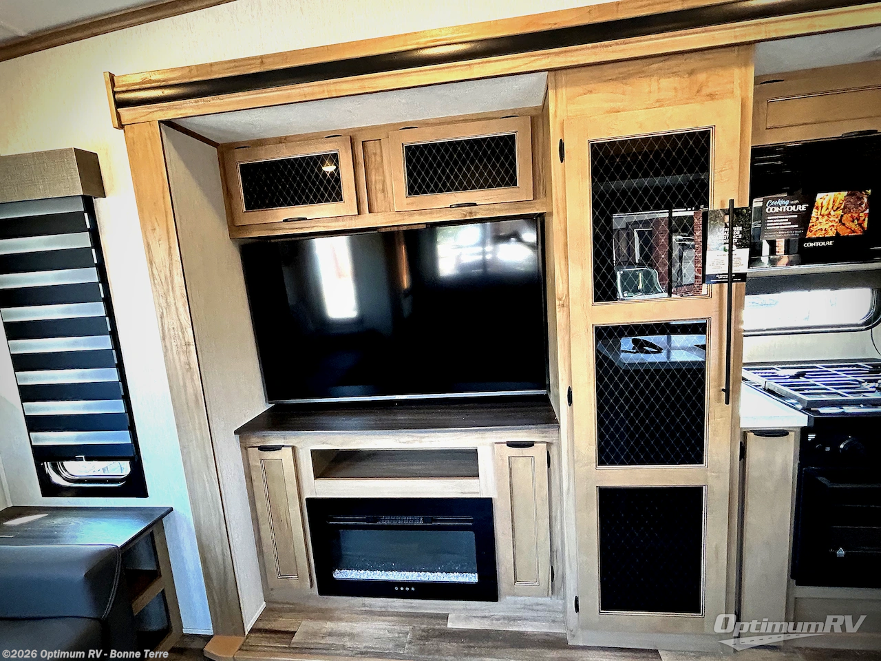 There is much to love in this fifth wheel! Starting with the second bedroom which has a slide that houses a flip-up bunk above a tri-fold sofa across from a desk with drawers, a drop zone, and a wardrobe, plus above all of that is a storage/bunk loft. The rear living area includes a tri-fold sofa, a TV with a fireplace below, and theater seating for two making this space another area at night for guests. In the morning, you can prepare breakfast on the kitchen island and three burner range, then dine together at the free-standing table with bench seating and two chairs. There is plenty of storage space here, including a pantry and overhead cabinets. The full bath will allow you to stay clean throughout your trip, and you'll feel right at home in the front private bedroom with a king bed and the front wardrobe is even prepped to add an optional washer and dryer. This model also includes an outside kitchen to make meals, plus pass-thru storage for all your gear!