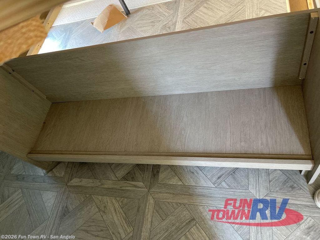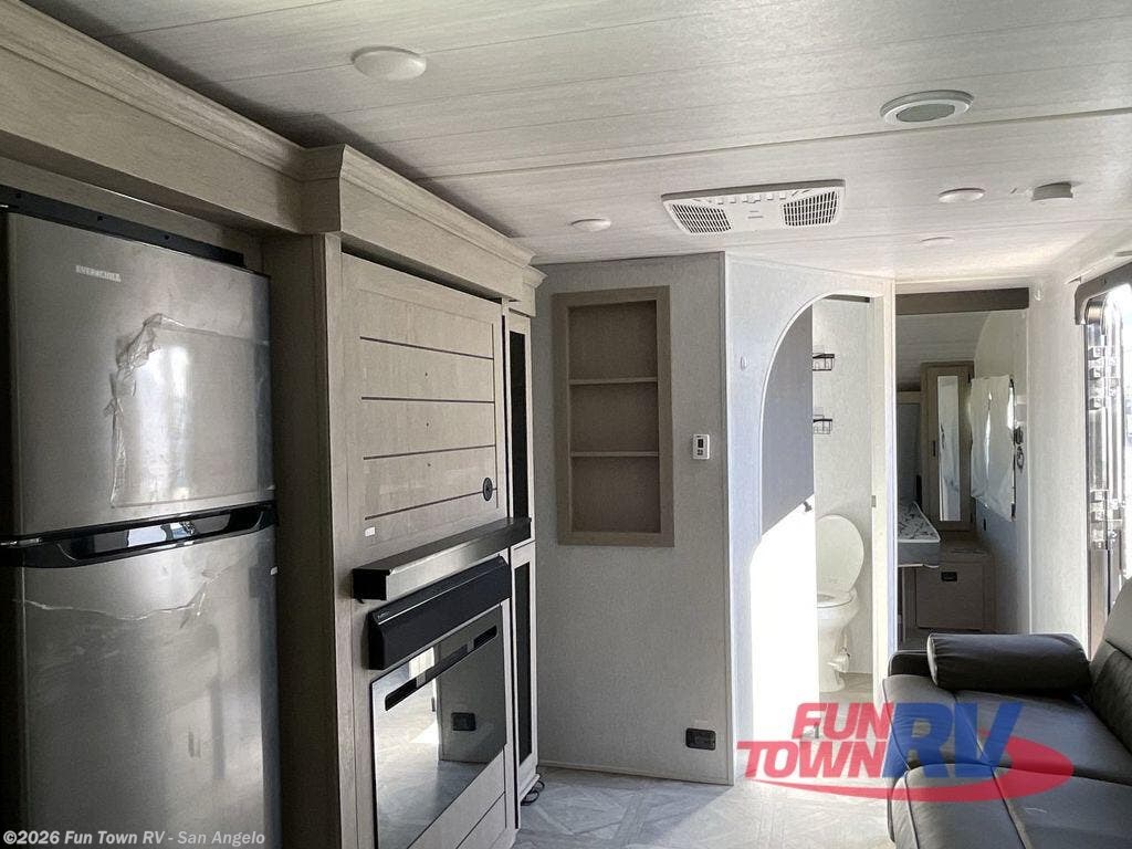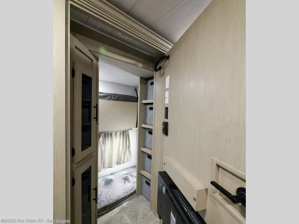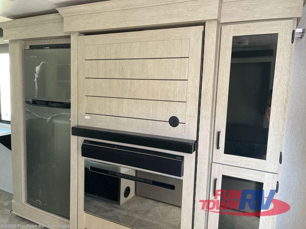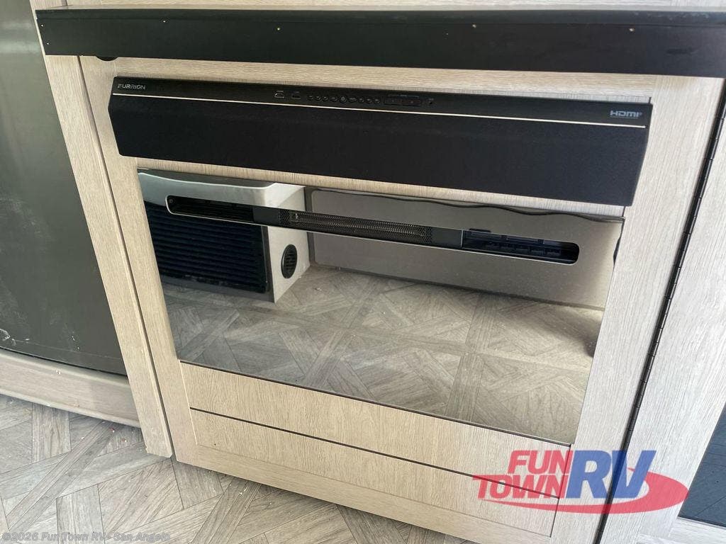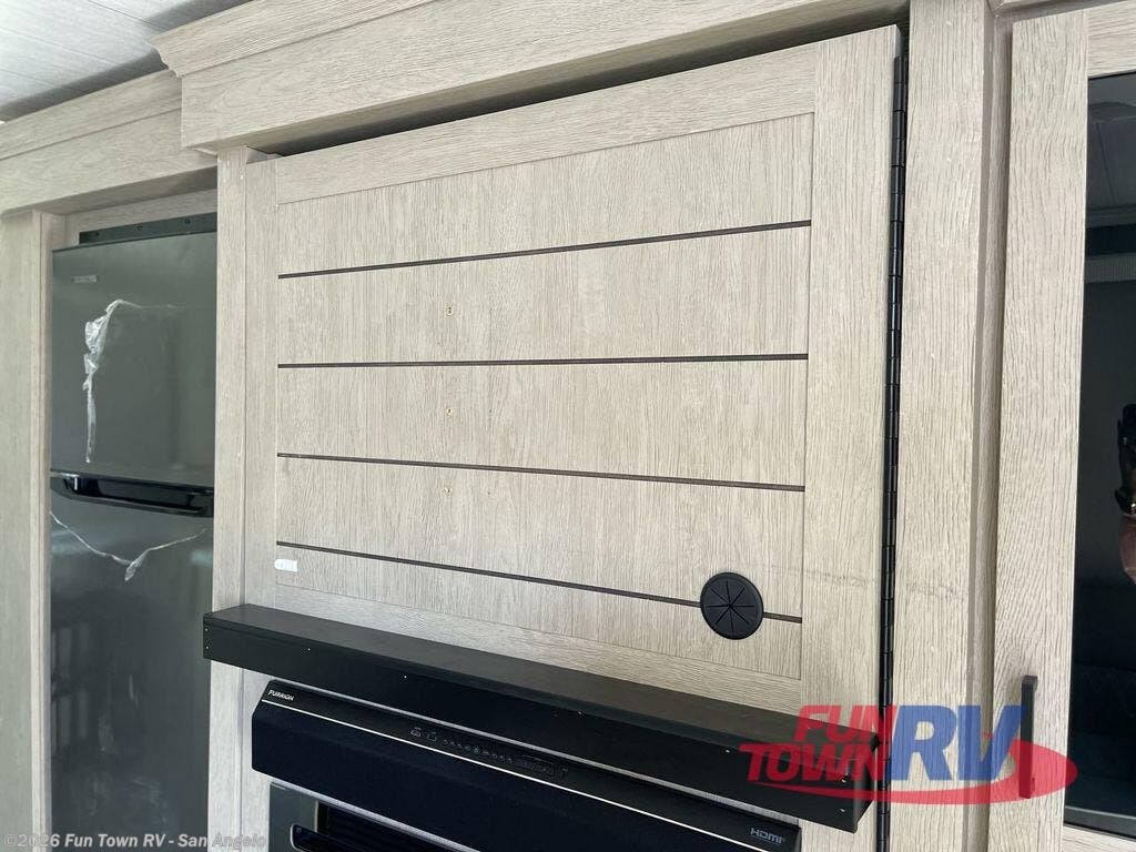 Camping trips in this spacious travel trailer are sure to leave memories. You will love the amount of counter space you have in the rear kitchen since there is wrap-around counter space with a flip-up table and two stools. The main living area will be a favorite place to visit, especially with its L-shaped sofa plus swiveling entertainment center with a fireplace. Behind the TV, you'll find a hinged mattress with a mattress below, storage cubbies, and a desk, making this hidden bunkhouse perfect for guests or an office. A spacious full bath with a radius shower will let you clean up each day, and a Versa-Tilt custom king bed in the front bedroom is sure to bring a great night's rest. There are also dual bedroom wardrobes to keep your clothes wrinkle-free!