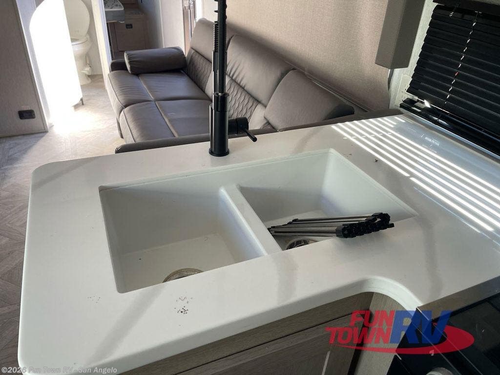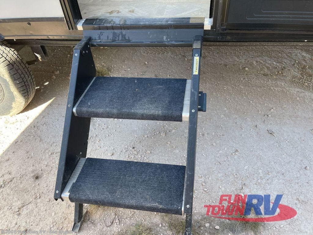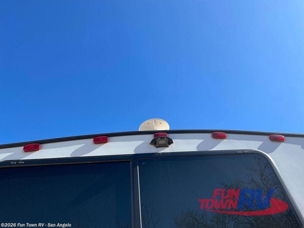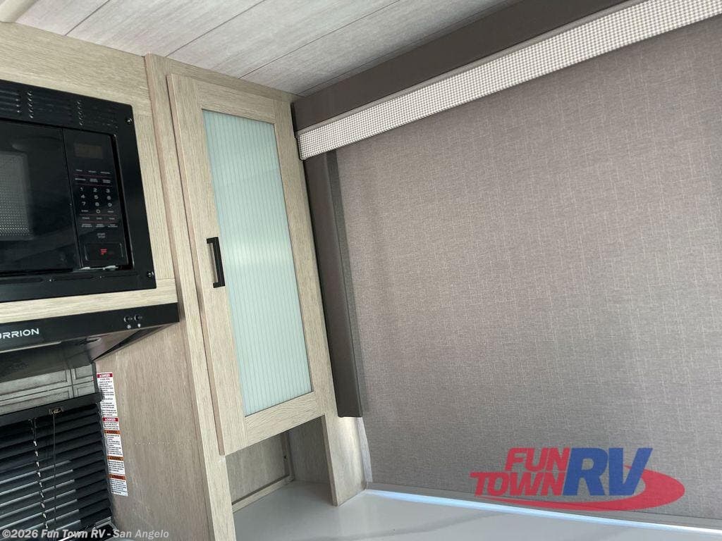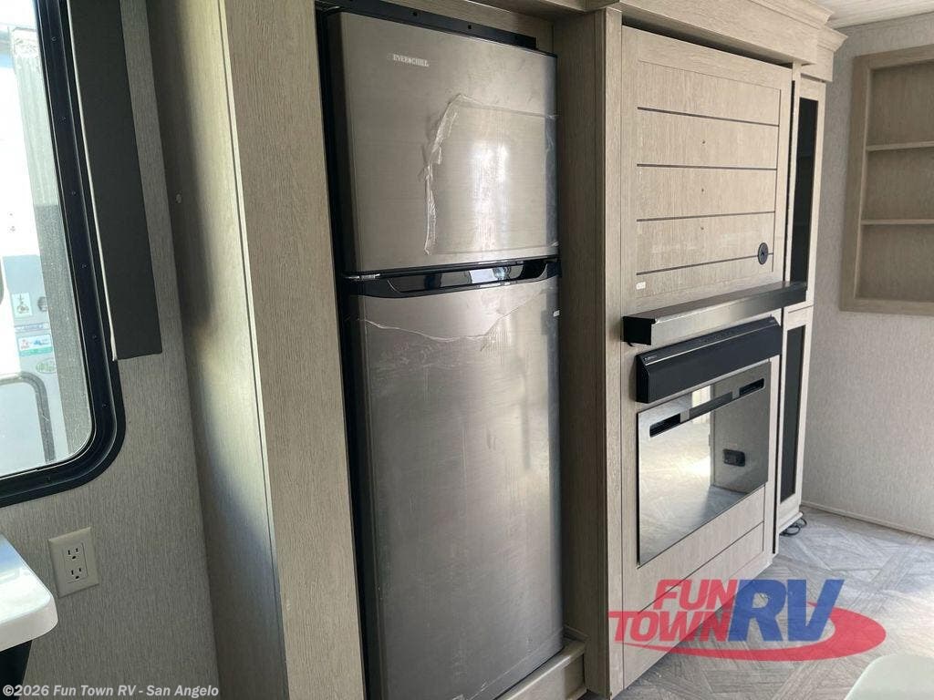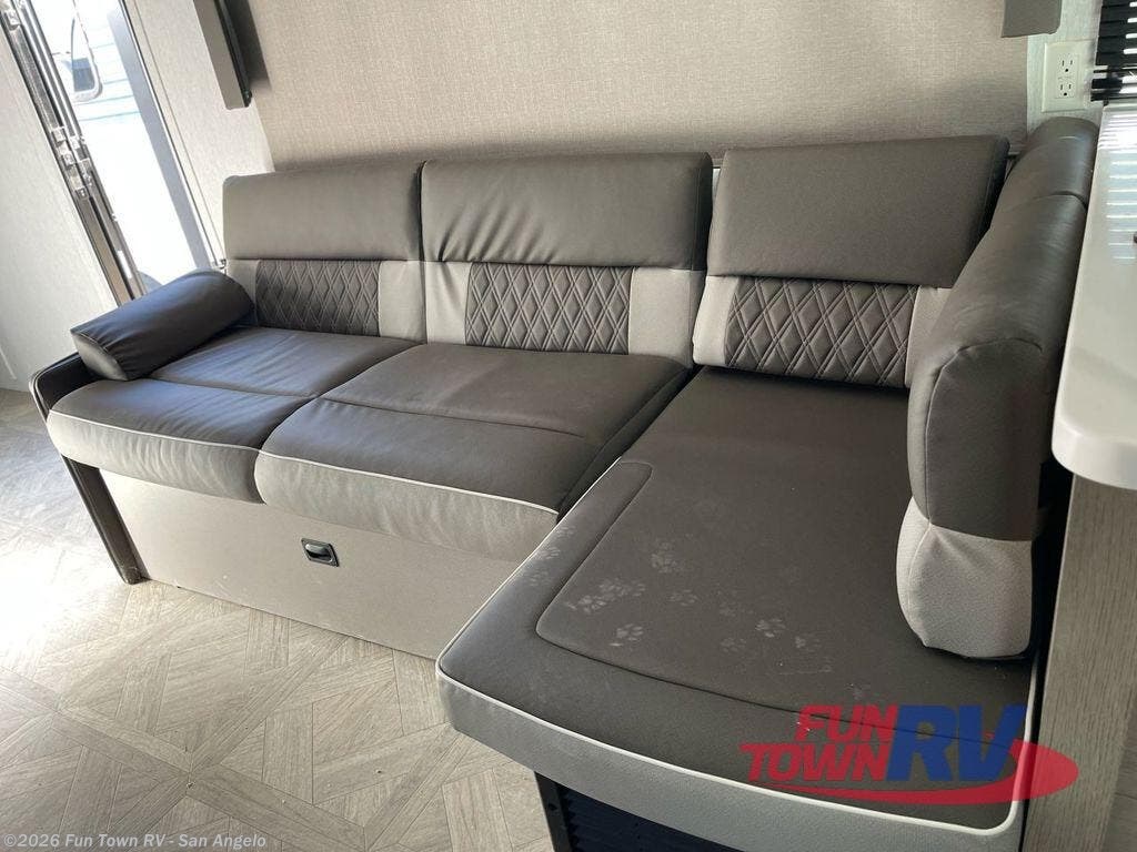Camping trips in this spacious travel trailer are sure to leave memories. You will love the amount of counter space you have in the rear kitchen since there is wrap-around counter space with a flip-up table and two stools. The main living area will be a favorite place to visit, especially with its L-shaped sofa plus swiveling entertainment center with a fireplace. Behind the TV, you'll find a hinged mattress with a mattress below, storage cubbies, and a desk, making this hidden bunkhouse perfect for guests or an office. A spacious full bath with a radius shower will let you clean up each day, and a Versa-Tilt custom king bed in the front bedroom is sure to bring a great night's rest. There are also dual bedroom wardrobes to keep your clothes wrinkle-free!