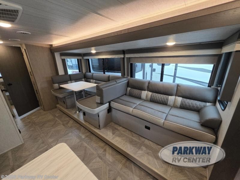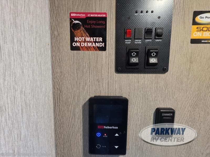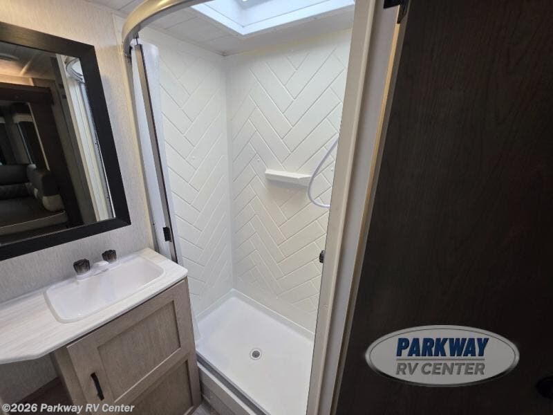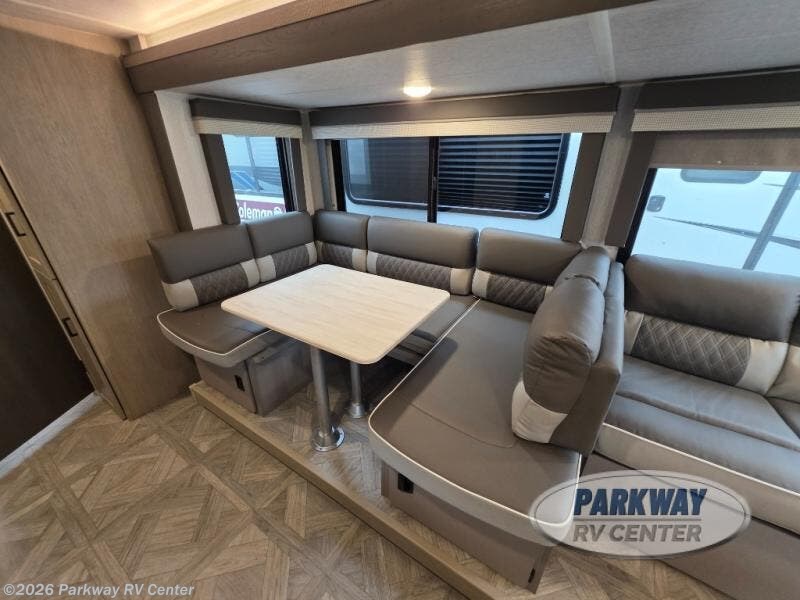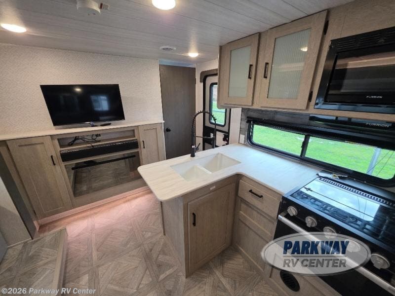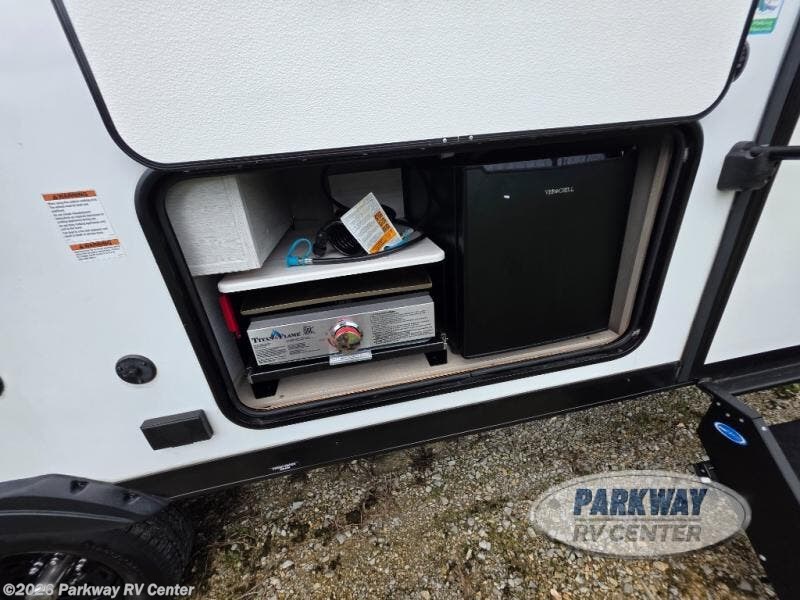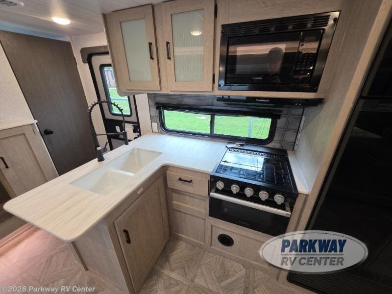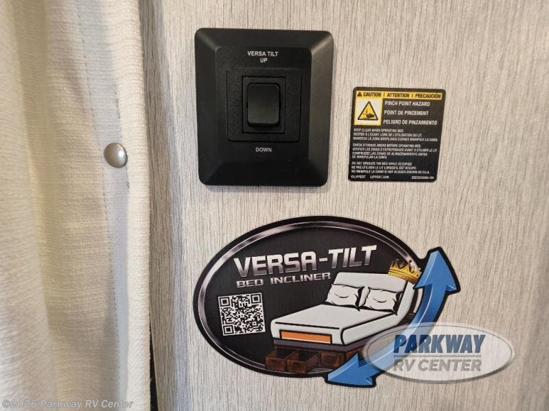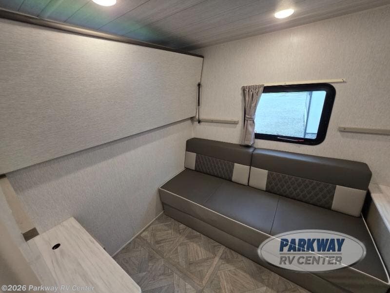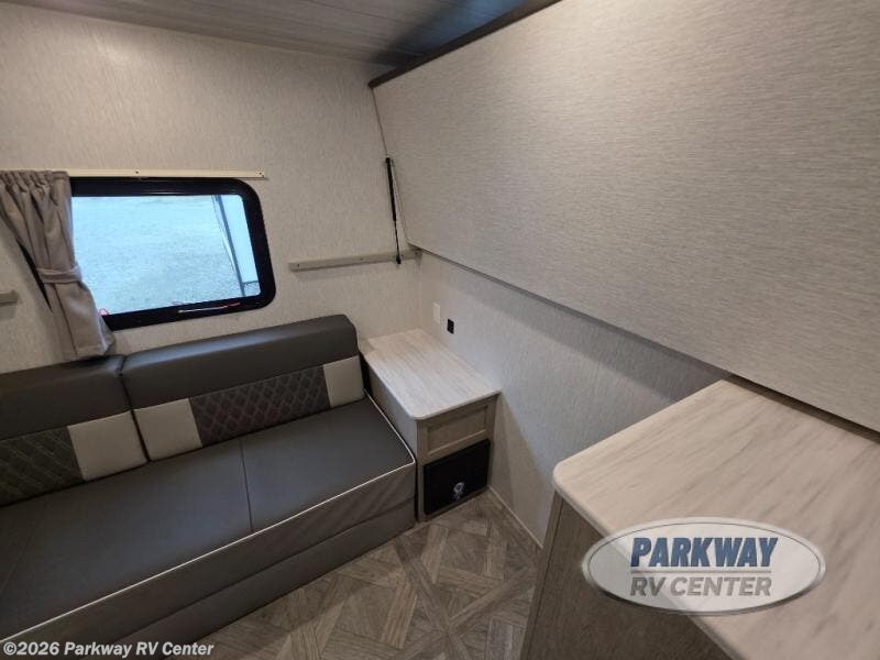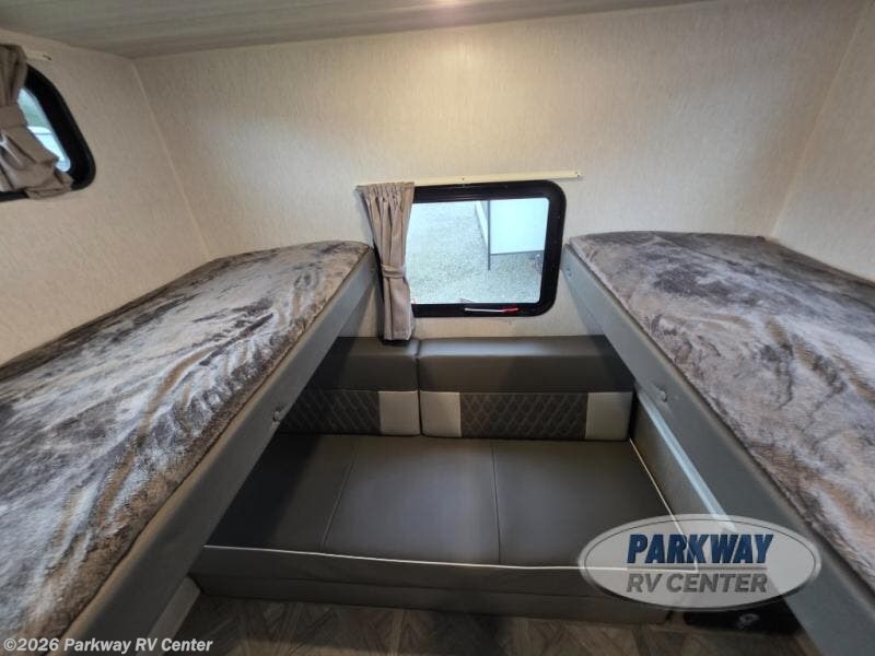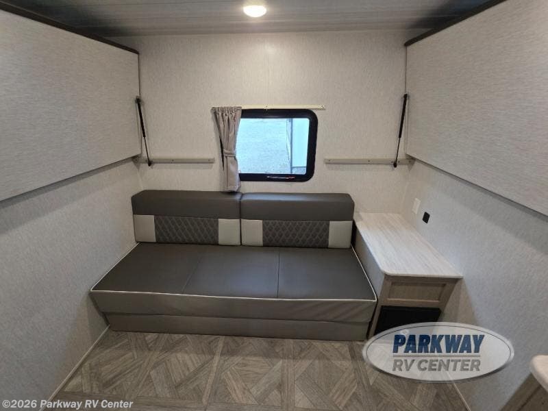This travel trailer is new to the lineup and offers a large amount of versatility! The rear private bunkhouse has two 30" x 74" Versa-bunks and a Versa-queen bed so that more can join in on the camping fun. Start each morning feeling clean and fresh after showering in the walk-in shower with fiberglass surround then head to the front private bedroom to change. The kitchen has an oversized 11 cu. ft. 12V refrigerator to keep your perishables fresh, a three burner cooktop for meals, and a U-shaped dinette for dining, game time, or just hanging out.