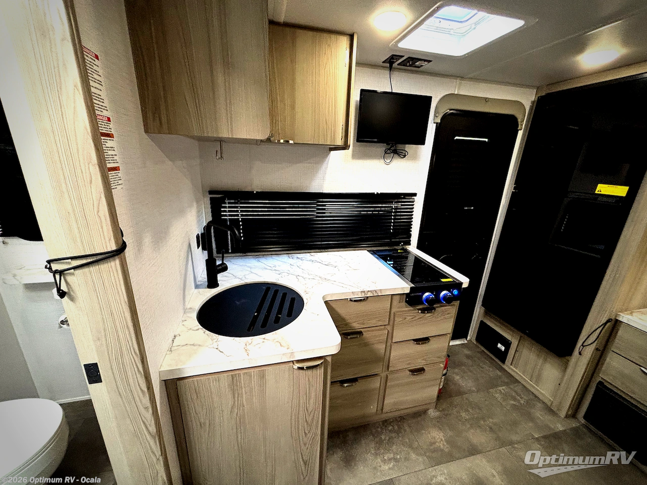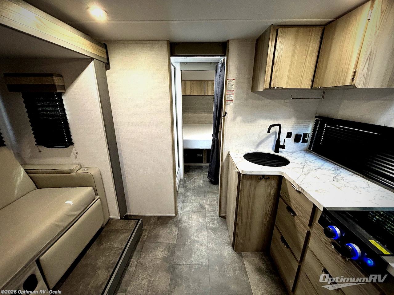 You're going to love every minute spent in this couple's trailer. The queen bed in the front private bedroom will provide a great night's rest, and there are dual wardrobes to easily get dressed in the morning. Head to the kitchen through the bath, then prepare eggs and bacon on the two burner cooktop. There is theater seating here to enjoy your coffee at each morning, or you may want to get some work done at the mobile workstation!