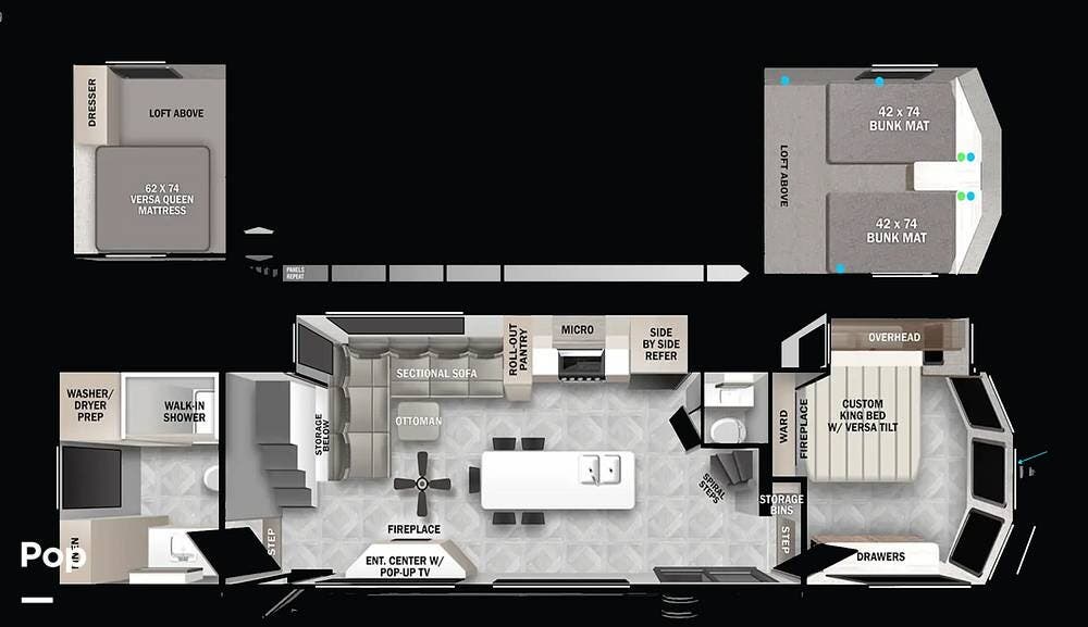The king-size master bedroom includes generous closet space and washer/dryer hookups. Up top, the twin sleeping lofts are ideal for guests or extra storage, offering full headroom and built-in shelving.