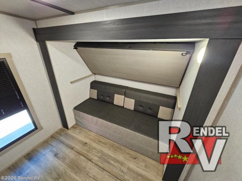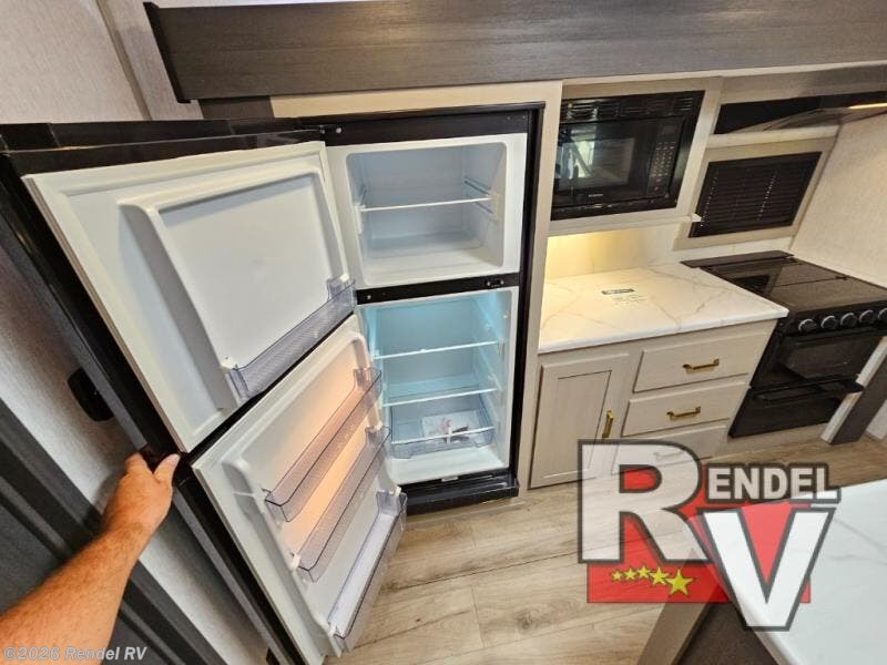 Your outdoor adventures are made better with ample amenities that make every journey memorable. The private rear bunkhouse features a Versa queen convertible sofa and additional bunk above, providing cozy sleeping arrangements for everyone. The heart of the trailer is the kitchen, featuring a 10 cu. ft. 12V refrigerator, microwave, and a chef-sized walk-in pantry designed to keep your favorite treats within reach.