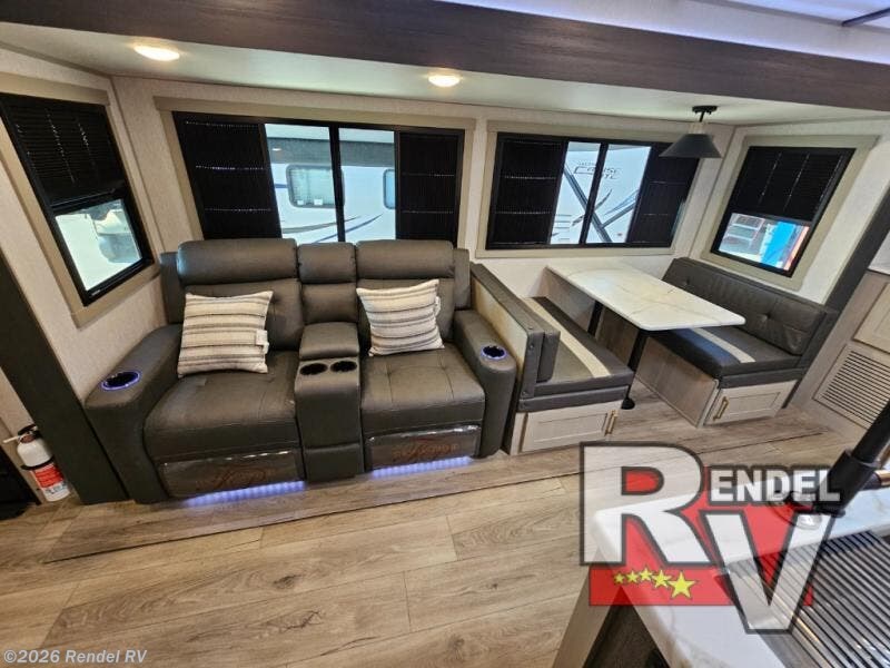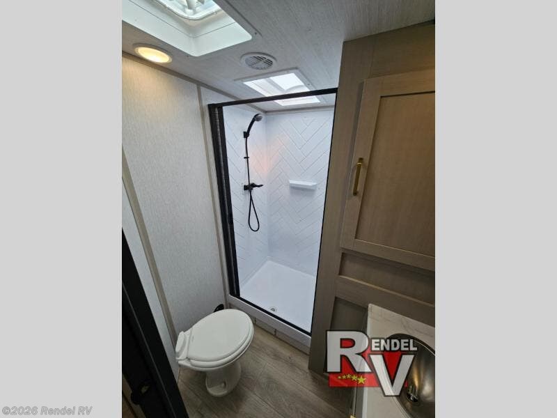 Relax in the comfortable theater seating while taking in views through the panoramic windows. When it comes time to rejuvenate, a luxurious 30" x 36" shower with skylights awaits to provide you with the ultimate bathing experience, complemented by the serene comfort of the queen bed with Versa Tilt in the master bedroom.