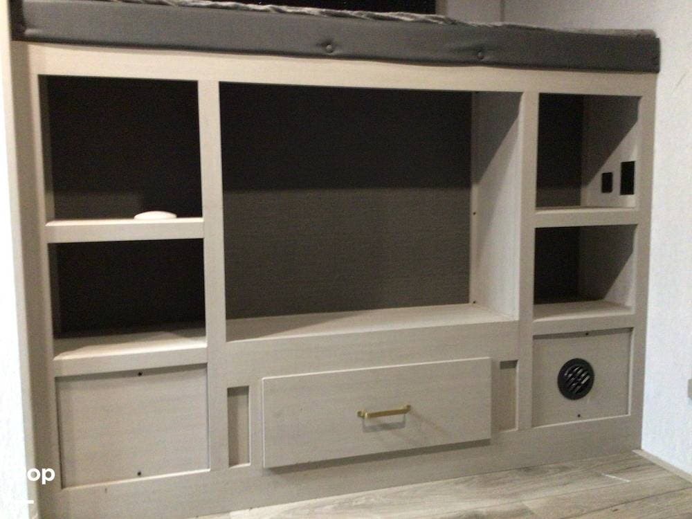There is a large bunk room. It features a total of three bunks and ample storage space. It is prepped for a television. This will make the kids happy!