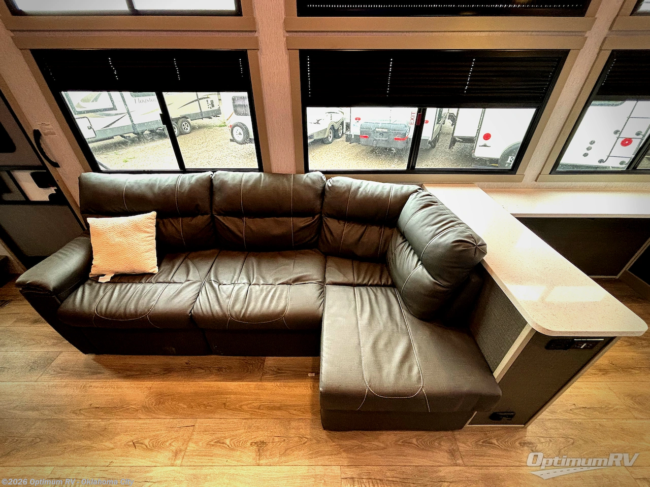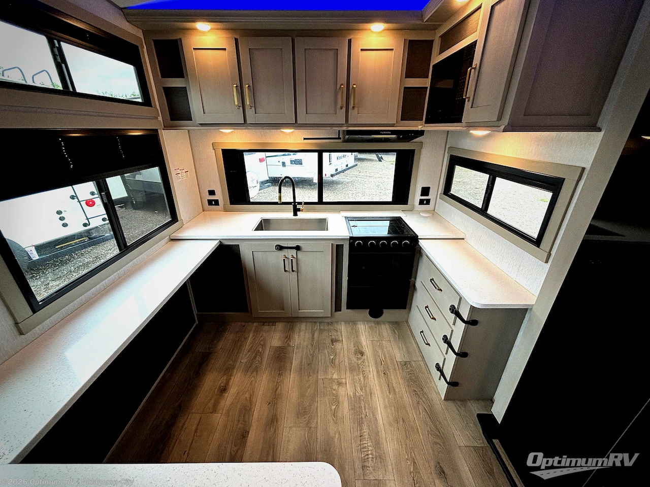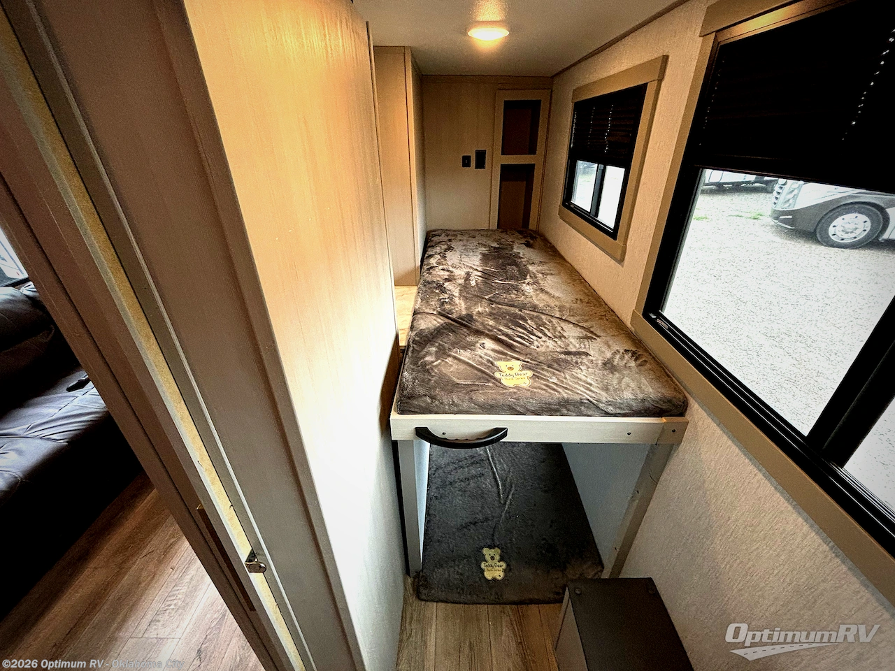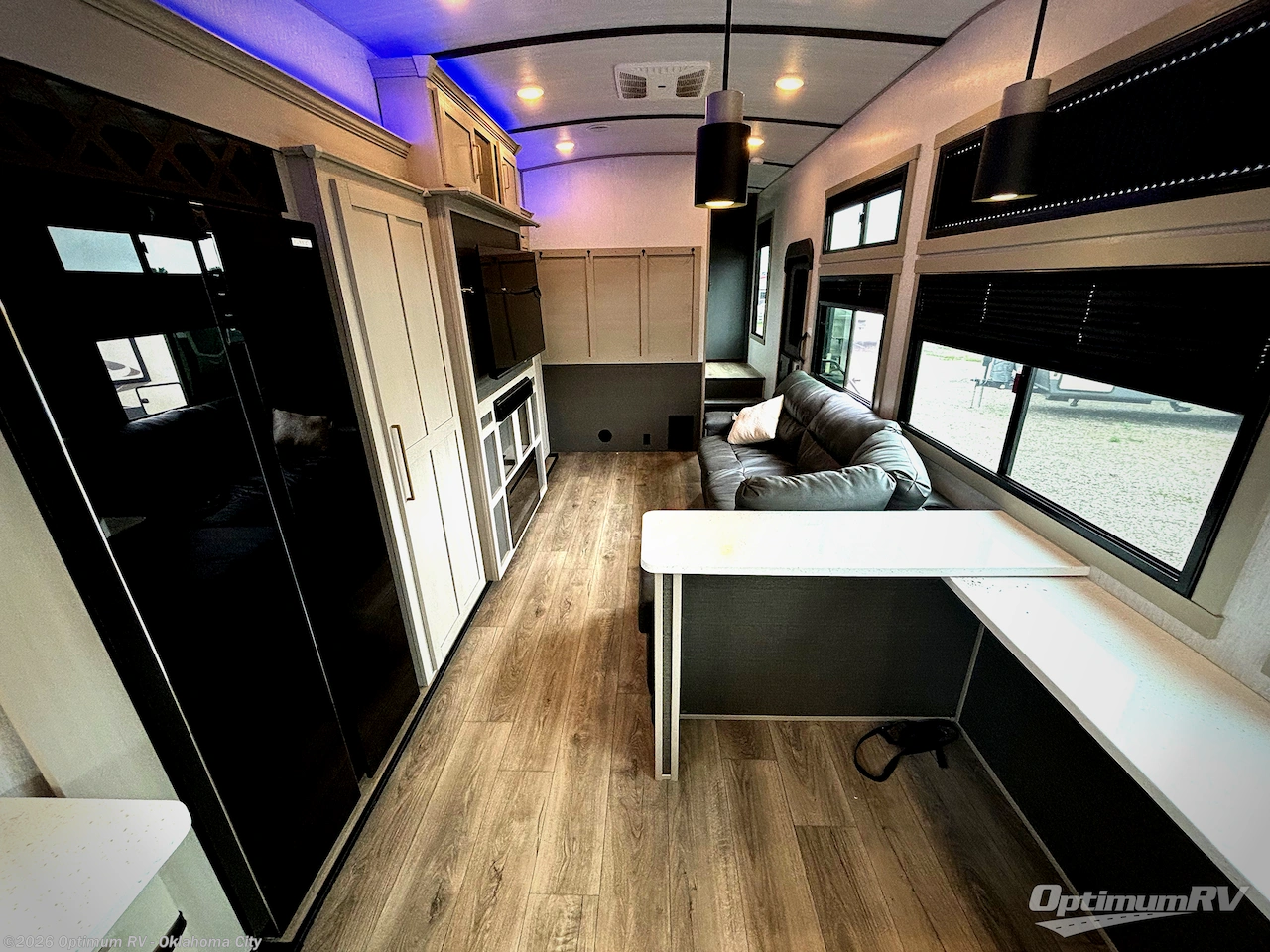 You'll be viewing this fifth wheel with eyes wide open from all of the stand-out features! The chef of your group won't be the only one to love the rear kitchen since it includes wrap-around countertops with four bar stools and panoramic windows for the best outdoor views. The 16' electric awning with LED lights will provide shade during the day, and the XL Texas-size pass-through can hold fishing gear, camp chairs, and more! Once you've entered the unit, you'll find the sectional sofa across from the large slide out with a hidden bunk room behind! There is a pocket door with storage, a dresser, bunk beds, and shelves for even more storage; how convenient! Head to the front private bedroom after a day of fun where you'll sleep soundly on the custom king bed with Versa-Tilt, a dresser with a bench beside it, plus a walk-in closet with shelves and washer/dryer prep!