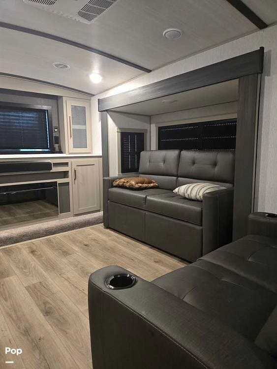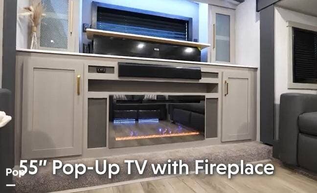 The front living area is very spacious due to the opposing slides. Relax on the theater seats or the two tri-fold sofa/sleepers and enjoy the large TV and fireplace.