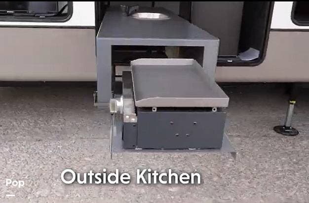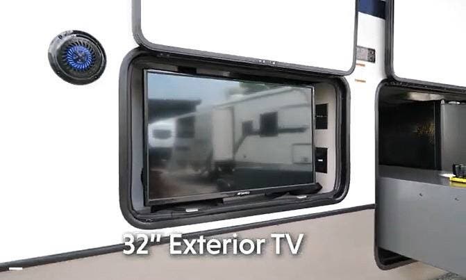 On the exterior, you can relax under the large 20' power awning and enjoy the exterior TV and exterior kitchen.