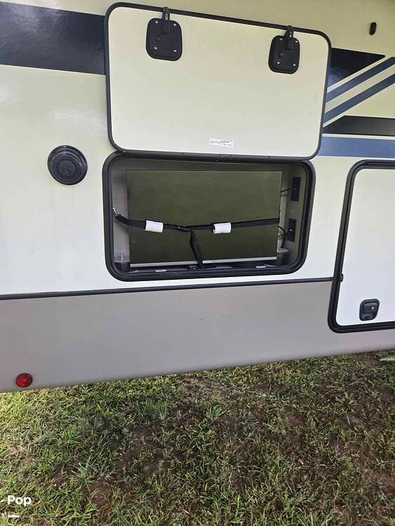 The RV is equipped with nice pass-through storage compartments, an auto-level system, heated tanks, and slide toppers.