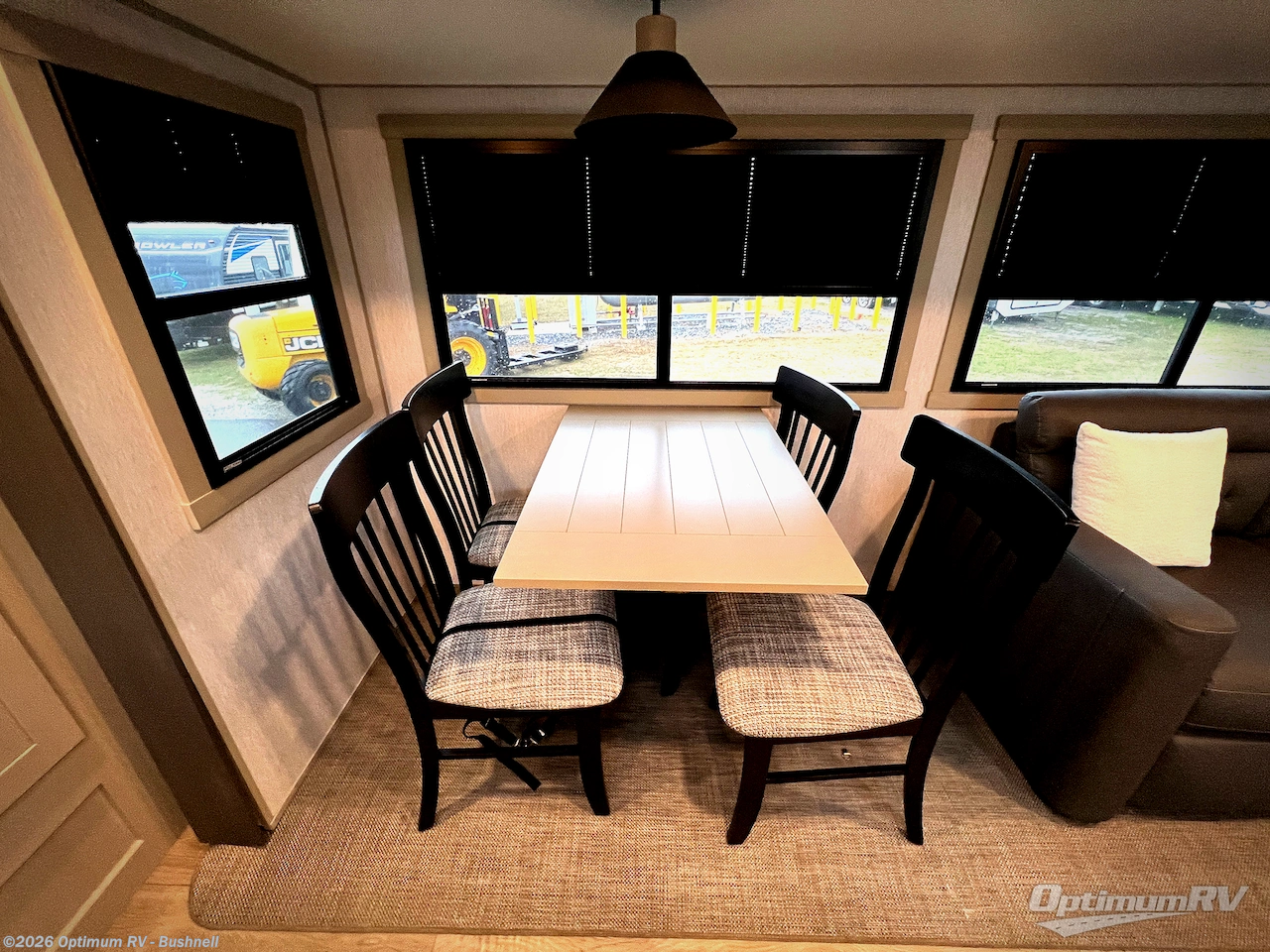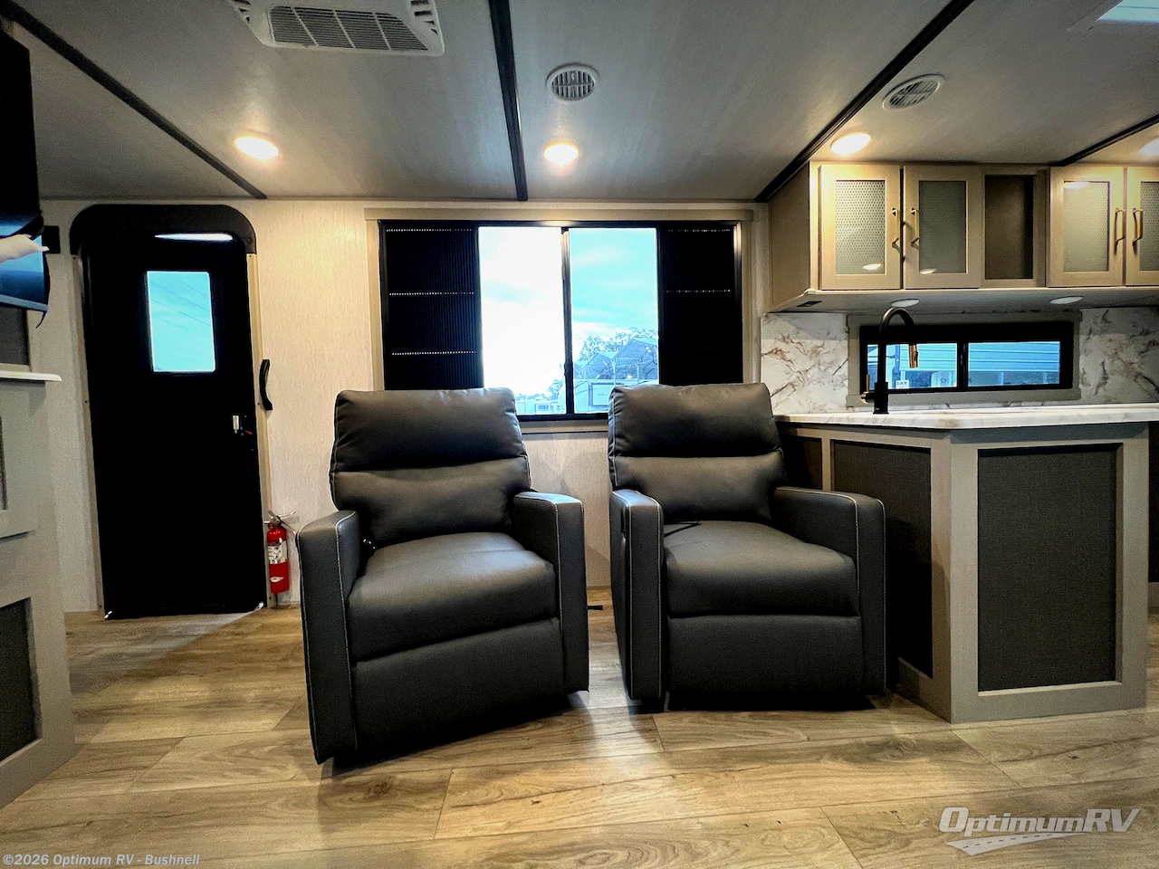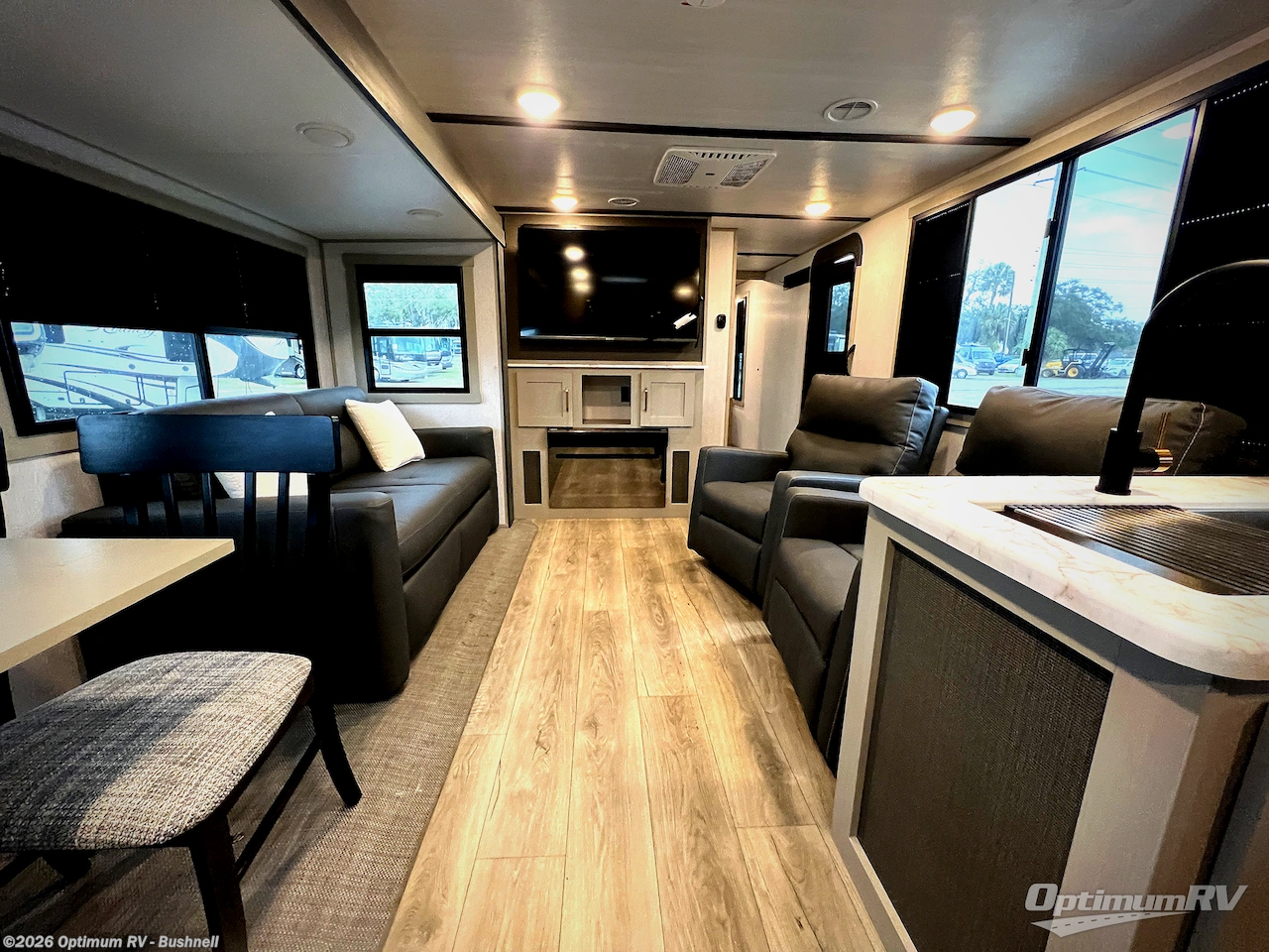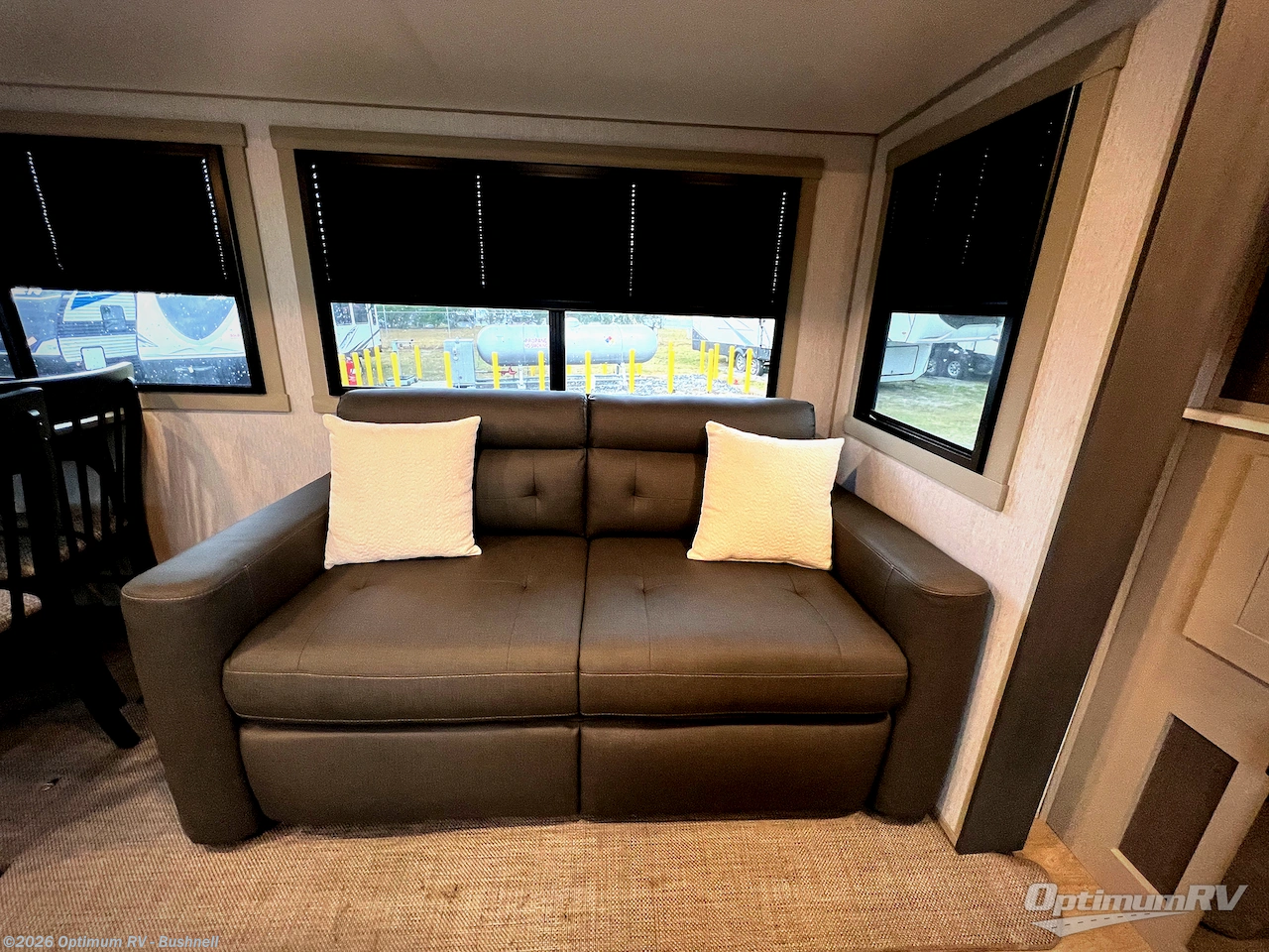 When you need to get away to the great outdoors, you won't be leaving creature comforts at home with this trailer in tow! Once you arrive at your campsite, set up the power awning, then make lunch on the exterior griddle with a refrigerator. After you've went on a hike to stretch your legs, you can get cleaned up in the full bath instead of using the camp's facilities. There is a rear kitchen with ample counter space, a three burner cooktop, plus a pantry and a 12V refrigerator for food. Your crew can get comfortable on the tri-fold sofa, booth dinette, or the two lounge chairs and watch a movie on the 40" LED TV. This model also includes a closet with washer and dryer prep to make full time RV living easier than ever!