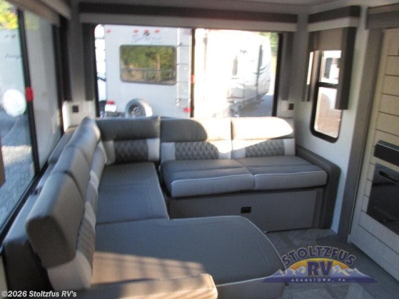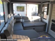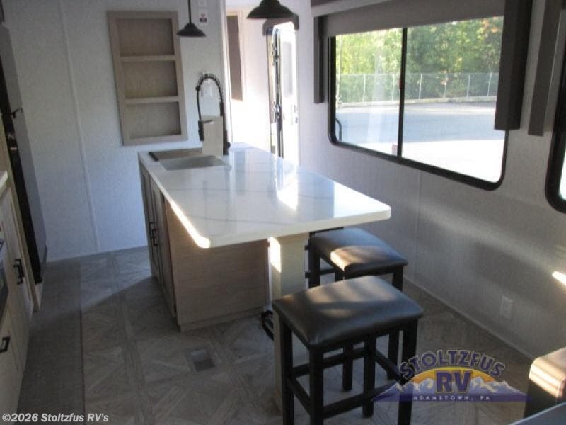 The perfect couple's coach with a view! This Salem View features a 7' kitchen island with a waterfall edge and five bar stools for dining and prep space. The island also houses a double kitchen sink for easy clean-up. Thanks to the island, you will enjoy 15 linear feet of countertop space throughout. The view will be of your choosing thanks to 95.5 square feet of windows that will easily bring the outdoors inside. A sectional sofa across the back of the unit provides ample seating to relax and enjoy a good book or the entertainment center. Behind the entertainment center, you will find hidden storage space with shelves so everything can be tucked out of sight, and an oversized refrigerator will provide enough space for your perishables while you are on vacation as well. A full bath is conveniently located near the main entry featuring StepAbove entry steps. The bath provides a walk-in shower, vanity with sink, toilet, and linen storage. In the private front bedroom, a Versa-Tilt custom king bed will allow you a relaxing and comfortable night's rest, and once again, a great view out the dual opposing windows. On the outside, a 23' awning offers additional living space protected from the elements, and a spacious pass-through storage compartment will allow you to stow away your camp chairs and outdoor equipment and games easily for transport.