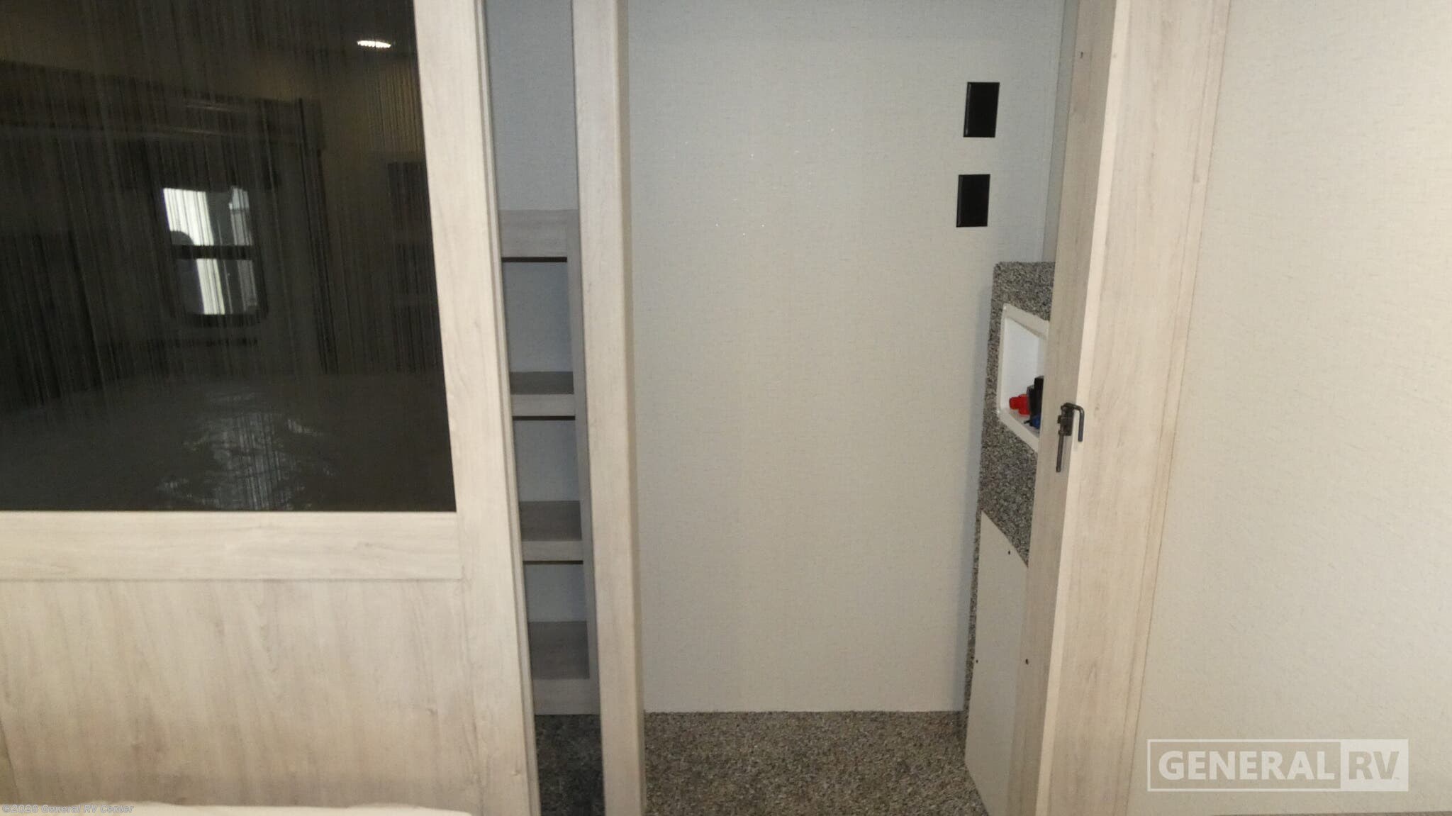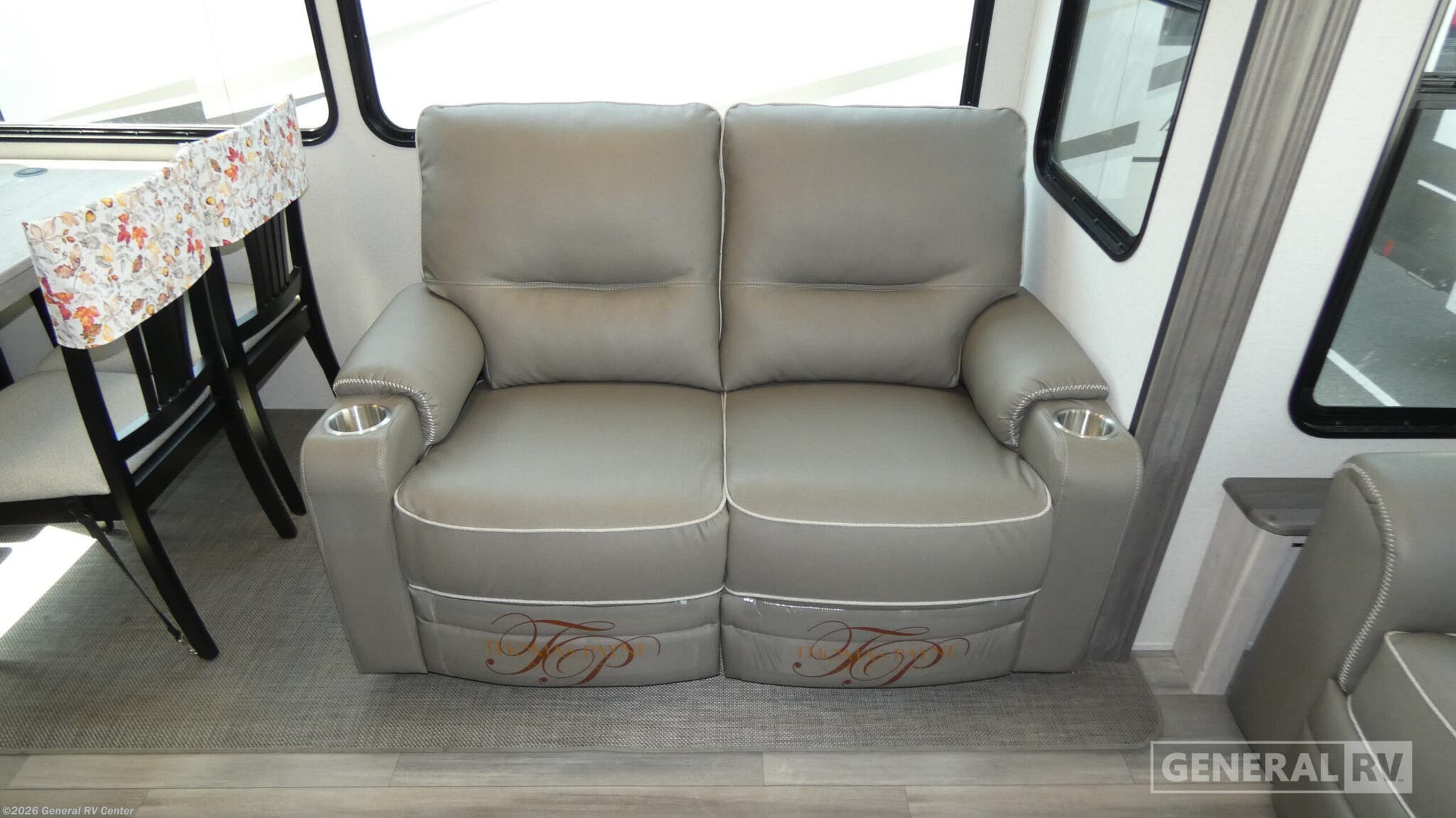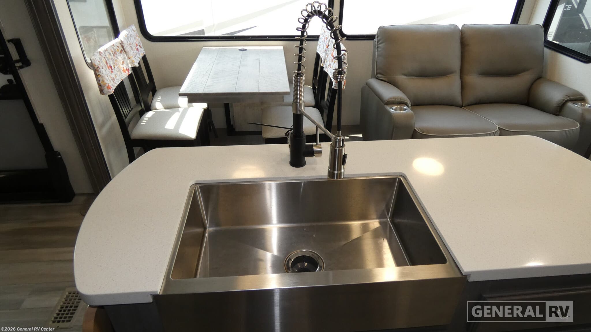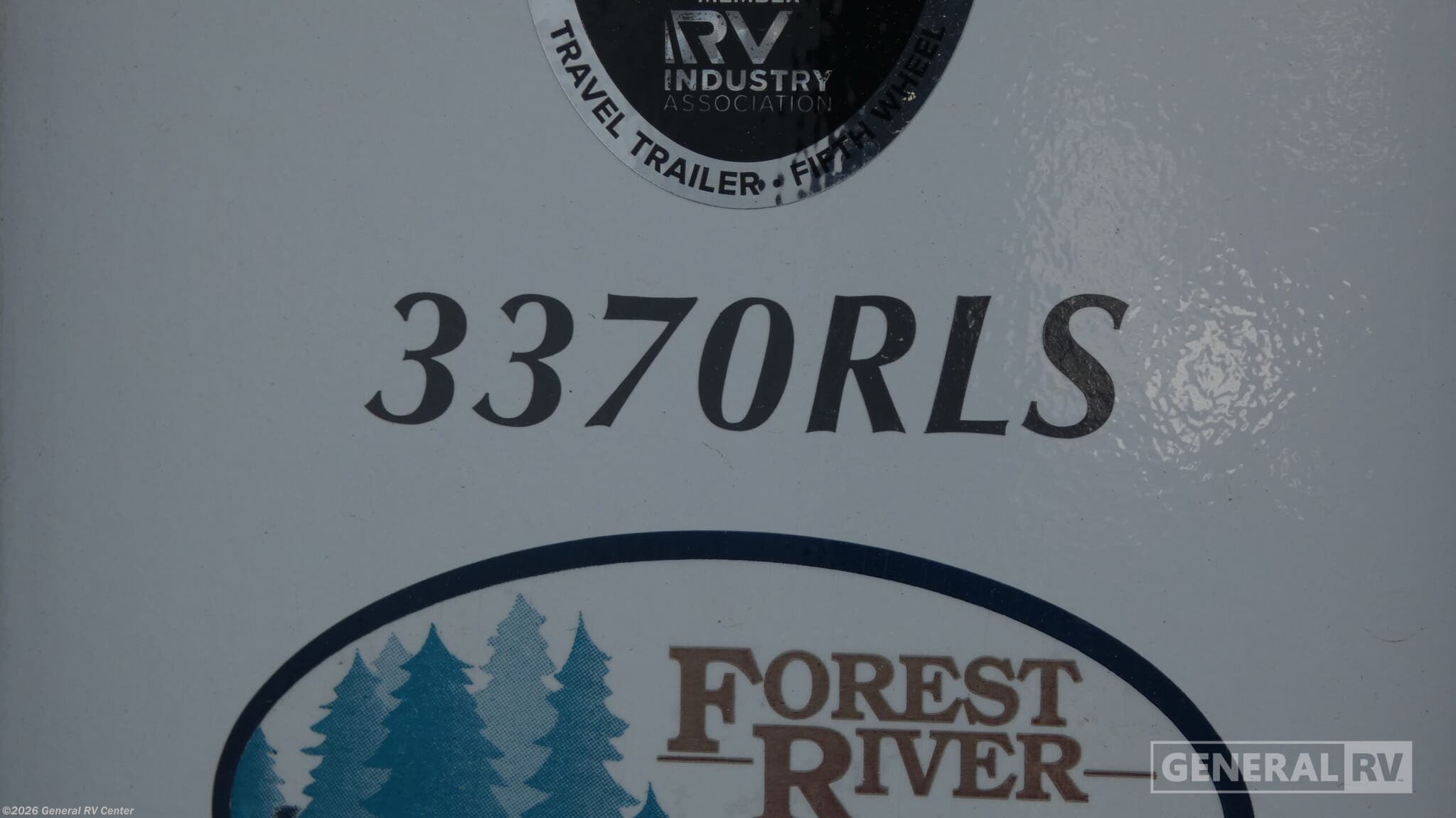 Forest River Sandpiper fifth wheel 3370RLS highlights: King Bed Slide Out Exterior Docking Station Coffee Bar Hide-A-Bed sofa Kitchen Island Drop-Frame Pass-Through Weekend camping trips and full-time RV living is made complete in this triple slide out fifth wheel. Your crew can relax under the 16' electric awning while lunch is being made on the exterior cooktop, or head inside to enjoy the rear living area. There is also a 50" flat screen TV here across from the theater seating, plus a tri-fold sofa and a free-standing dinette to dine at. And the chef will love the hidden pantry behind the entertainment center! The spacious full bath includes a walk-in shower with a seat for your comfort, and the front private bedroom will feel just like home with its king bed and large front wardrobe. There is even washer and dryer prep to make laundry day easier than ever. You will find the perfect balance of size, space, features, and luxury with any one of these Forest River Sandpiper fifth wheels! They are constructed with a welded aluminum framed vacuum bonded laminated superstructure, a cambered powder coated frame with rust prohibitor, and a fully enclosed underbelly to protect the units vitals during any season. Some hassle-free amenities include a 60k BTU on-demand water heater, full coach water filter system, tire pressure monitor system, and an electric leveling system! Inside, you'll enjoy stainless steel appliances, solid surface countertops, upgraded raised panel cabinet doors, and rustic wood plank linoleum to name a few comforts!