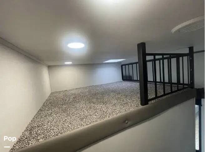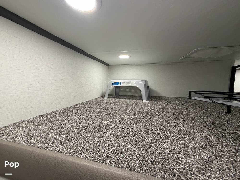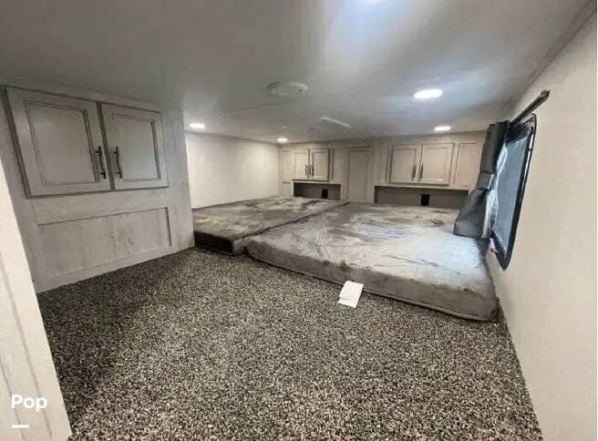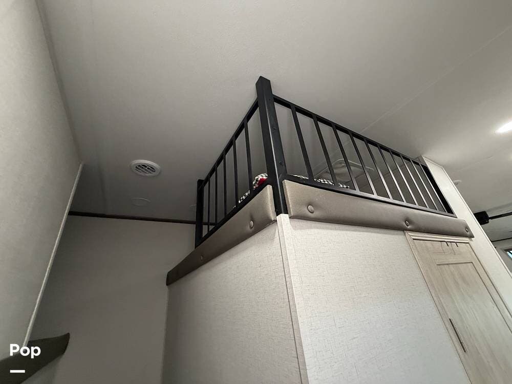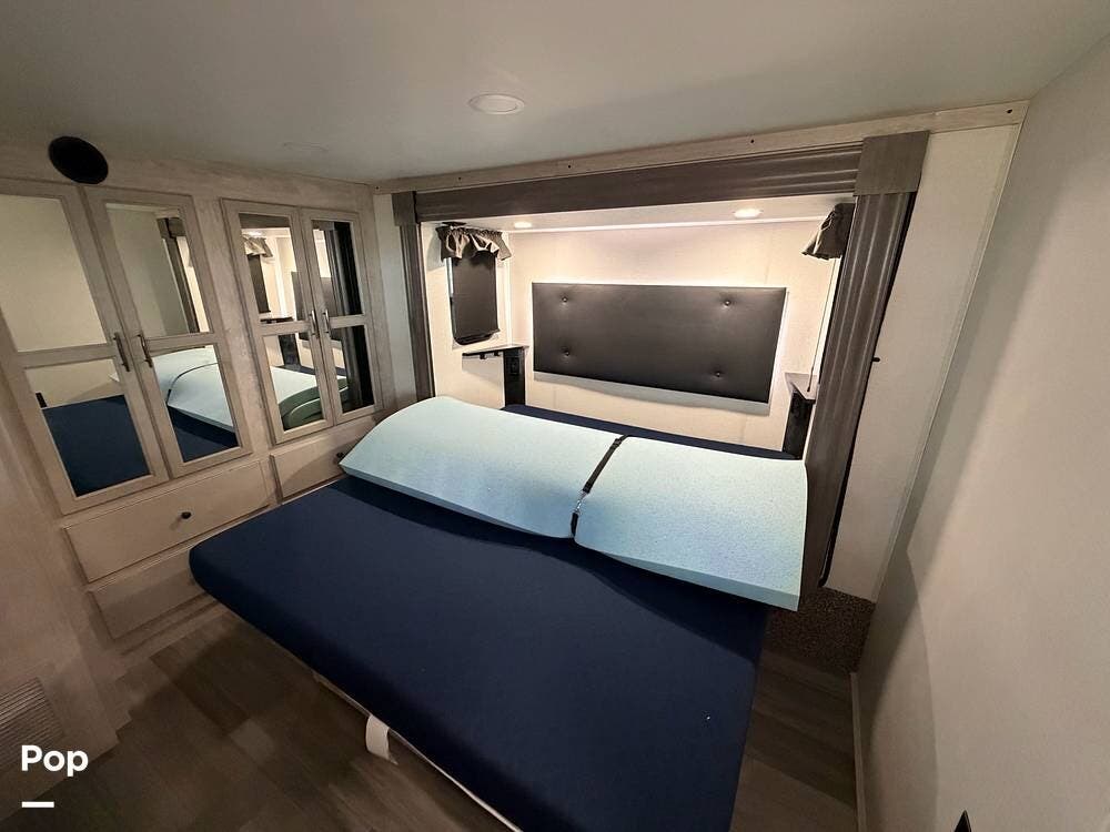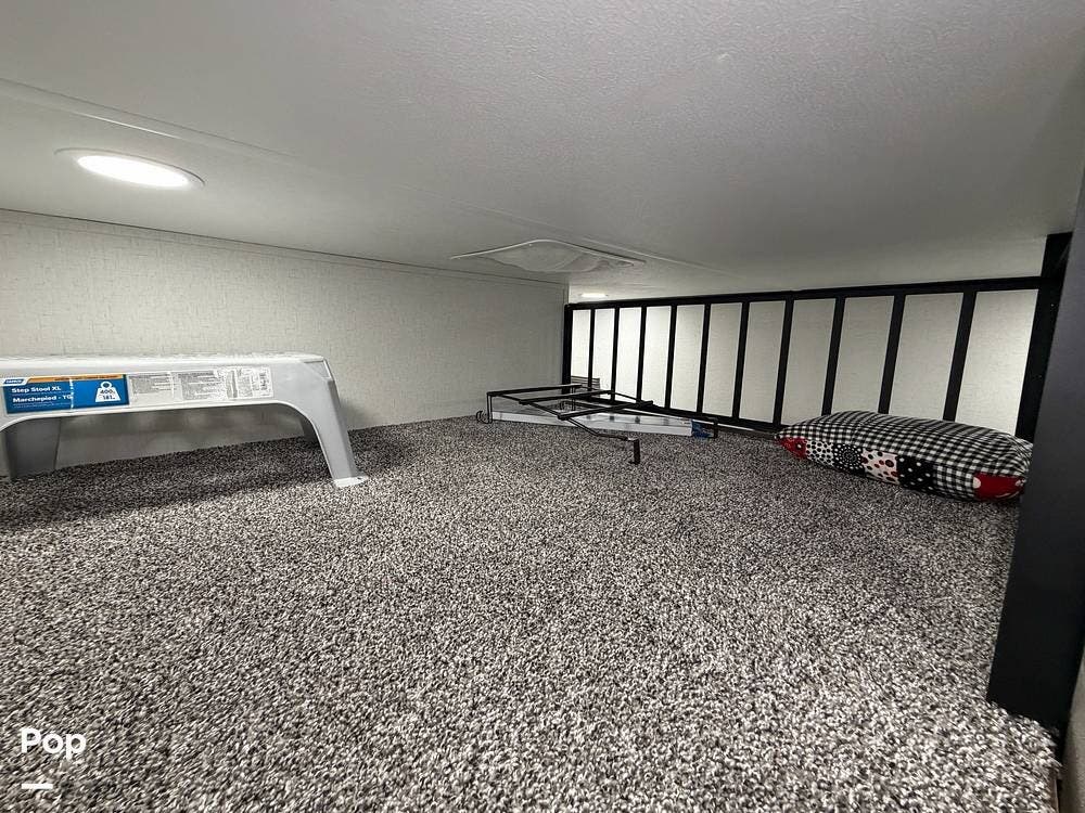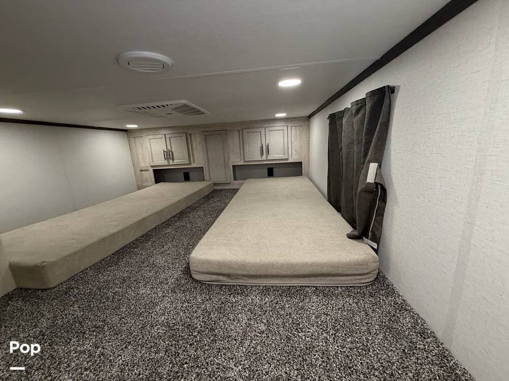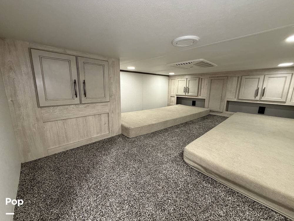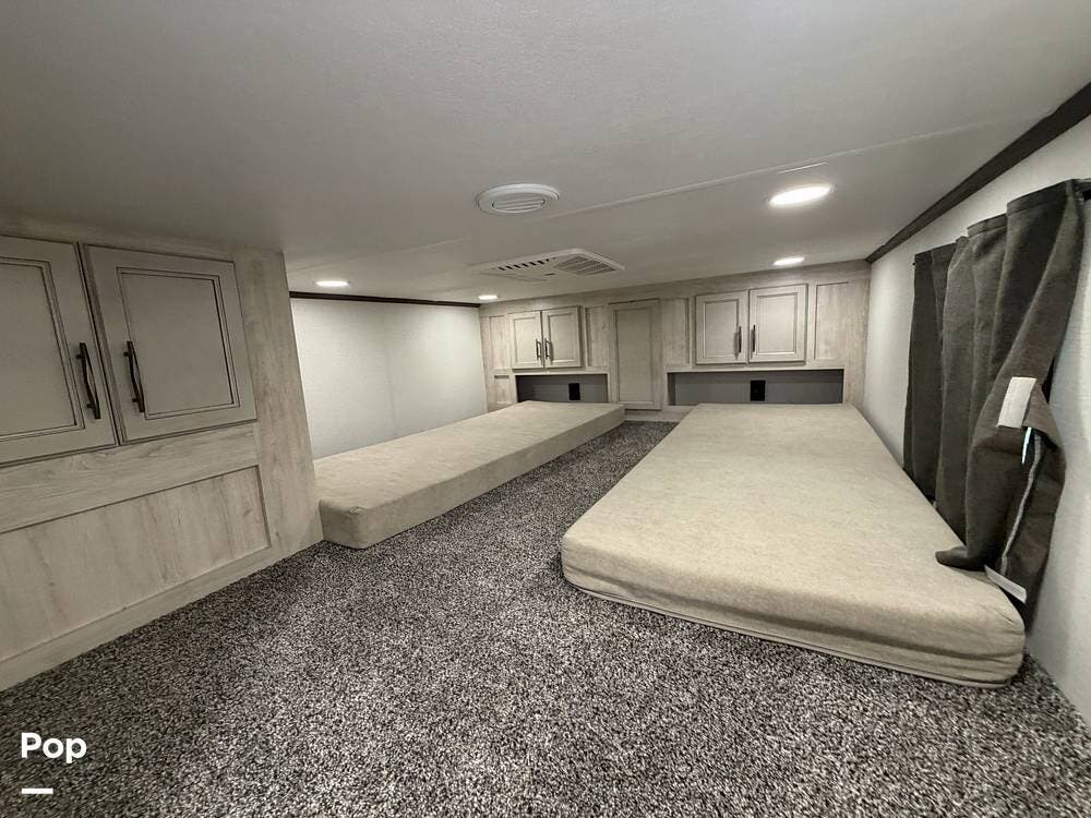 This 2024 Sandpiper by Forest River sleeps eight people. There is a full loft above the rear master bedroom and a half loft above the bathroom. In the full loft area, there are two 44" x 74" bunk mats for comfort as well as wardrobe/storage at the head of each.