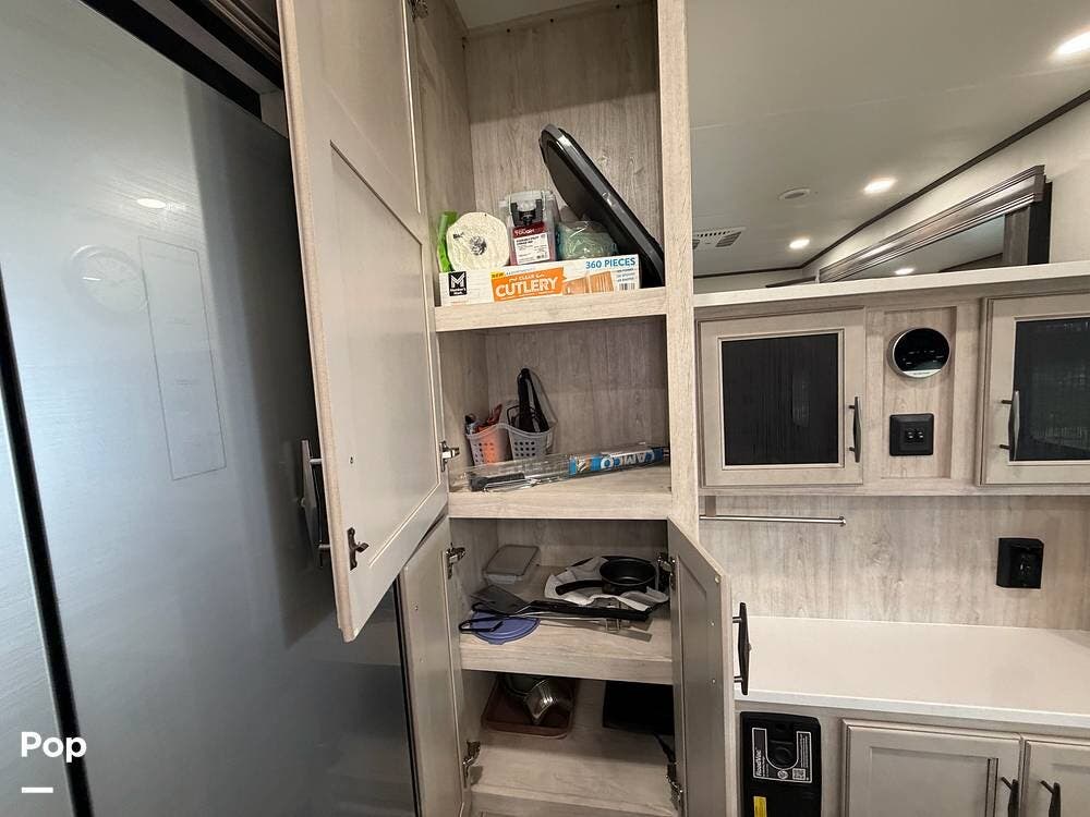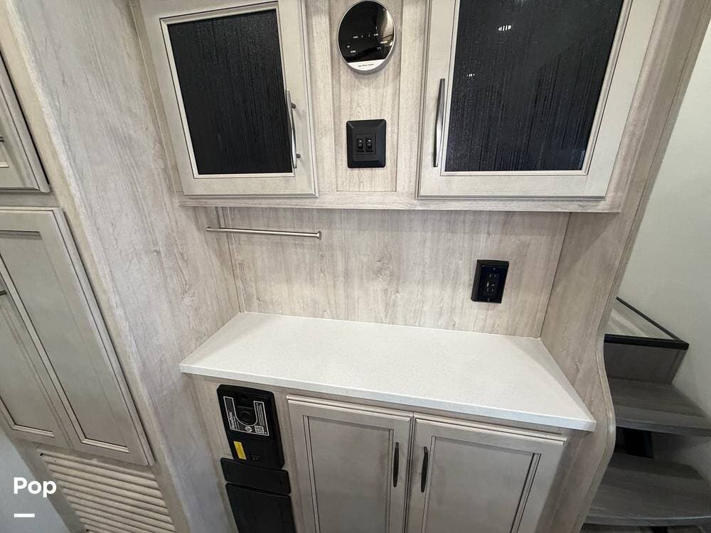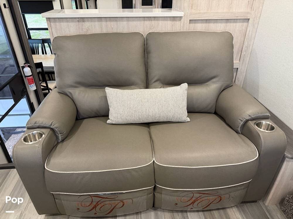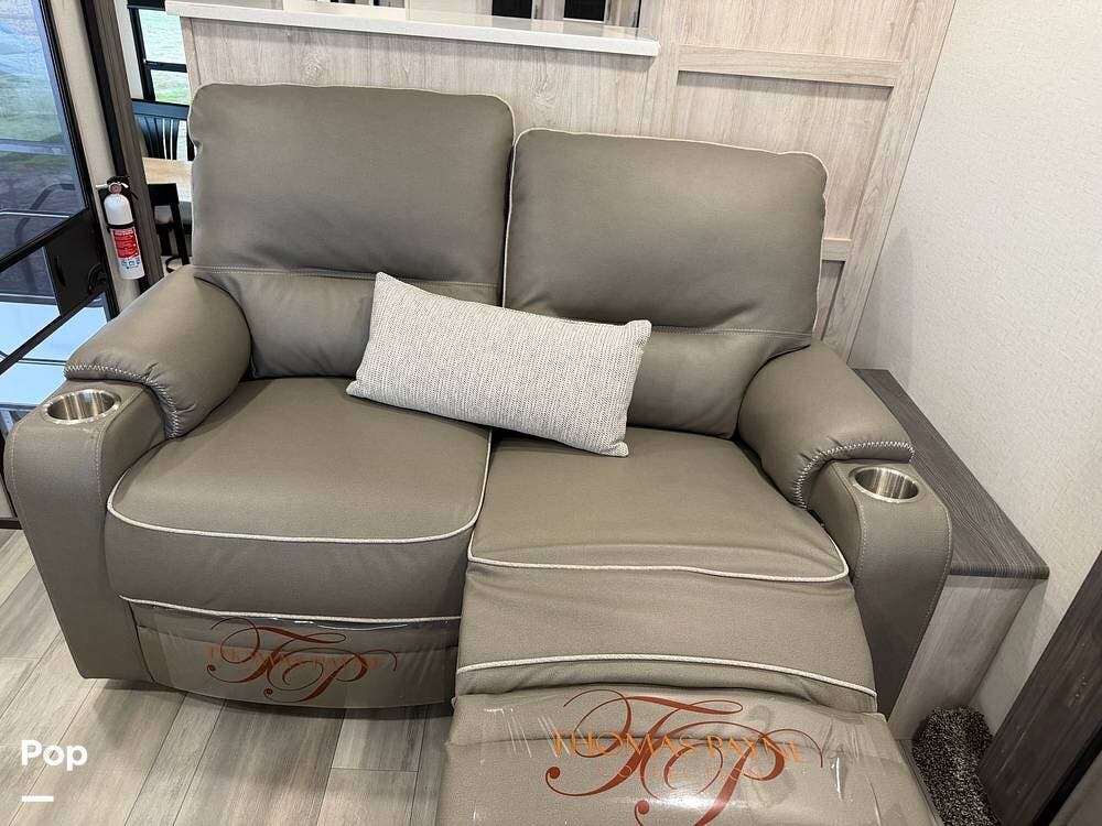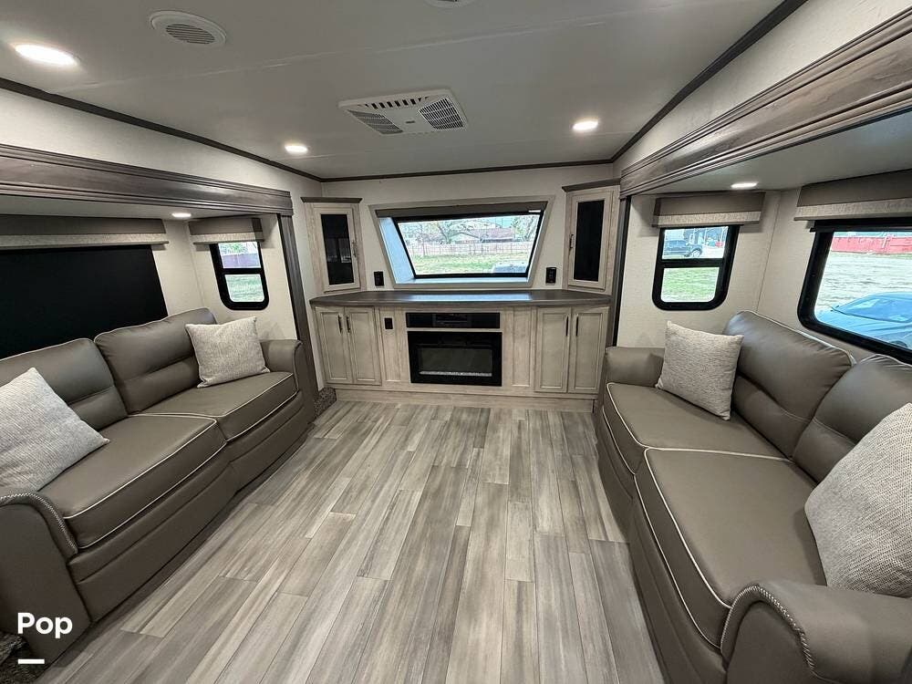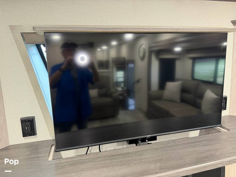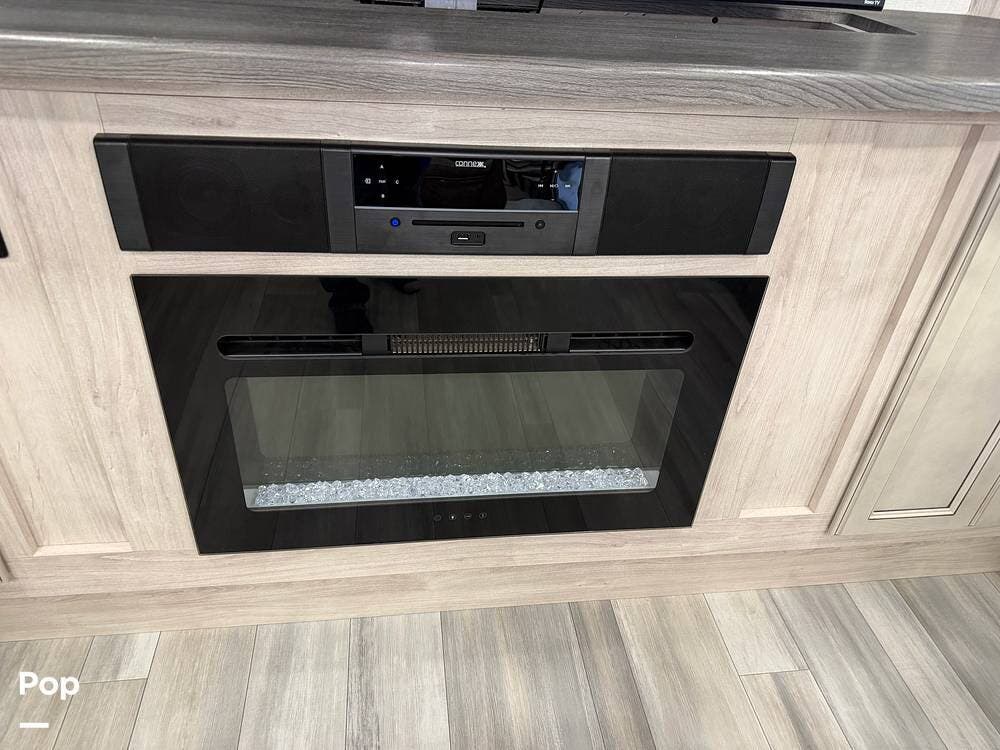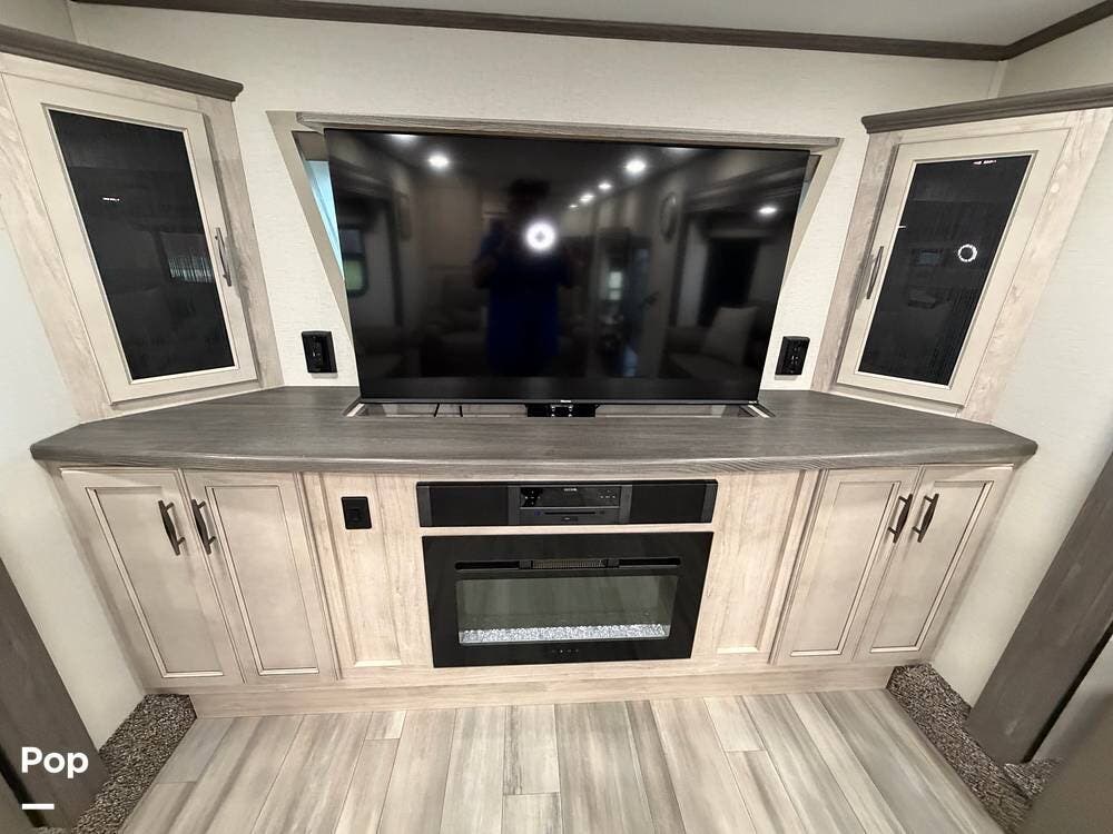 Head up the steps in front to a dual slide front living area with a 50" pop-up TV and a fireplace beneath the window. There is also theater seating opposite the TV, and a tri-fold hide-a-bed in each slide, allowing added sleeping space when needed.